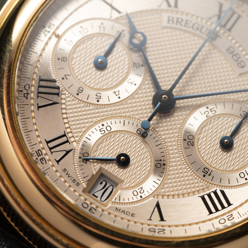 La referenza in oggetto si distingue per i dettagli di stile che caratterizzano gli orologi di Breguet, introdotti da Daniel Roth quando assunse la direzione artistica della manifattura. Il quadrante è in oro finemente lavorato con motivo guilloché à clous de Paris, tipico delle finiture della Maison. Gli indici sono in numeri romani e le lancette Breguet à pomme évidée; il quadrante riporta il contatore dei secondi continui a ore 6, quello dei minuti del cronografo a ore 3, e quello delle ore del cronografo a ore 9. A ore 6 è presente anche la finestra del datario con rimessa rapida dalla corona, che è a cappello di prete con incisione Breguet, affiancata dai pulsanti cronografici a pompa.