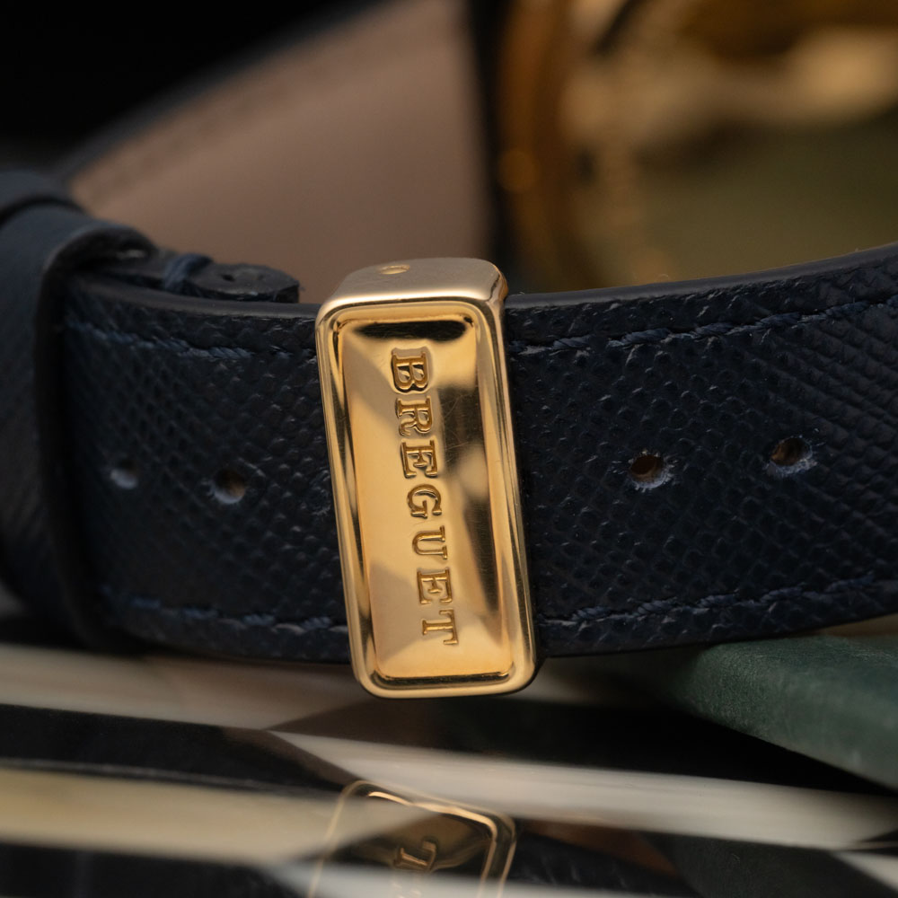 Nella cassa, caratterizzata dal fondello chiuso in oro e dai lati con la lavorazione “a moneta” tipica del brand, è alloggiato il calibro meccanico a carica automatica Breguet 576, realizzato su base Frederic Piguet 1185 e regolato in cinque posizioni di isocronismo. Oltre alla scatola e ai documenti originali, l’orologio è dotato di un cinturino in pelle con chiusura deployante in oro.