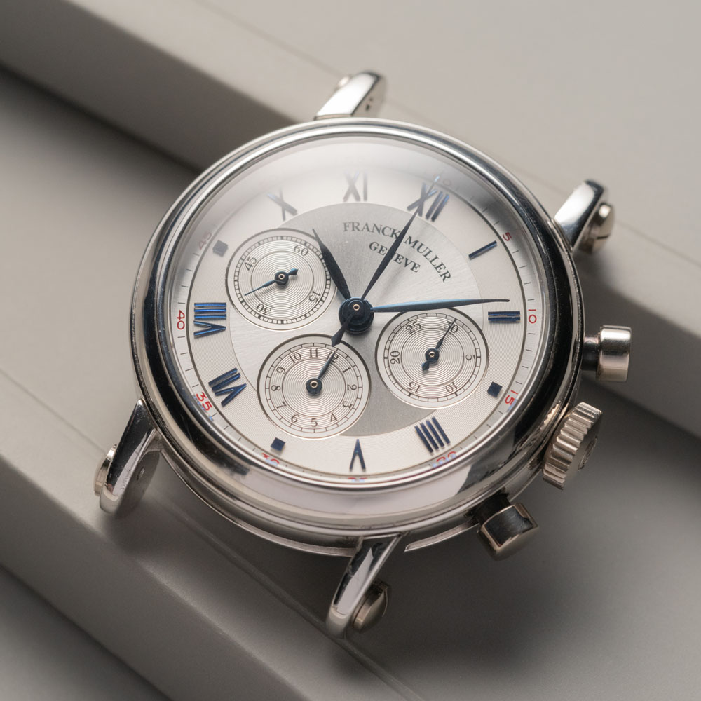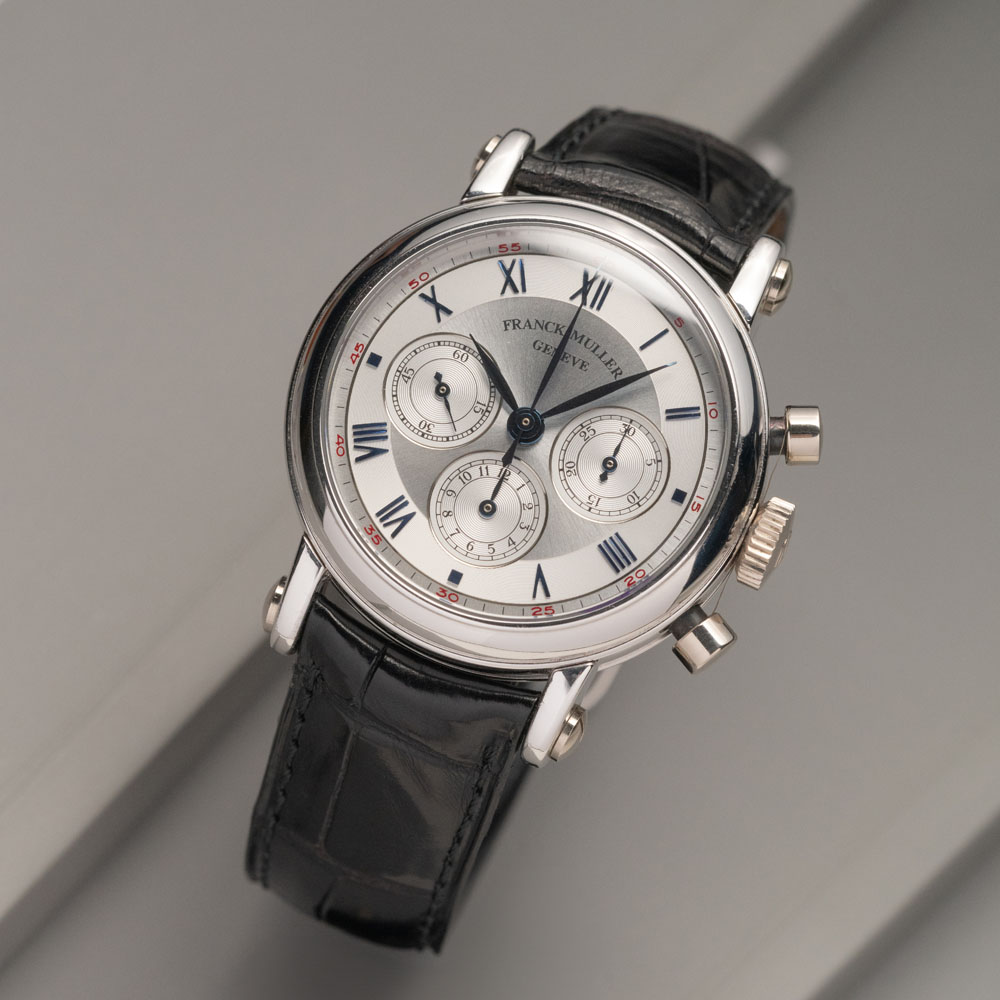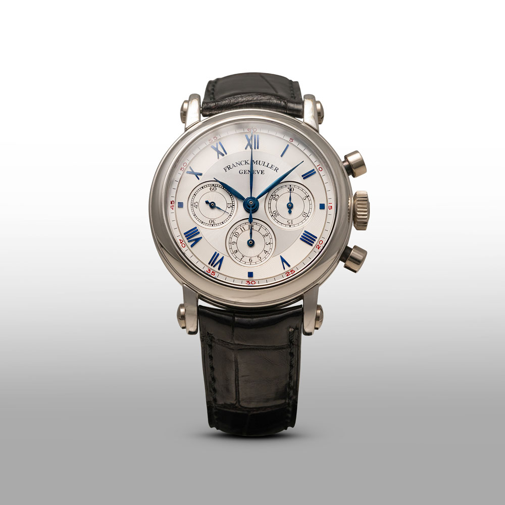 Le condizioni generali dell’orologio sono eccellenti e il corredo è completo di scatola e garanzia originali. Il cronografo è dotato di cinturino in pelle nera con fibbia in platino firmata Franck Muller.