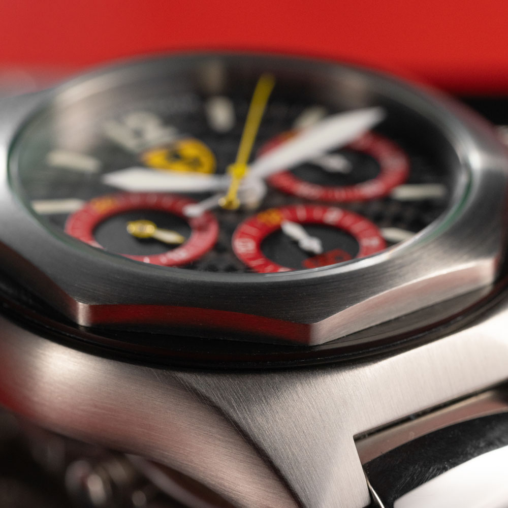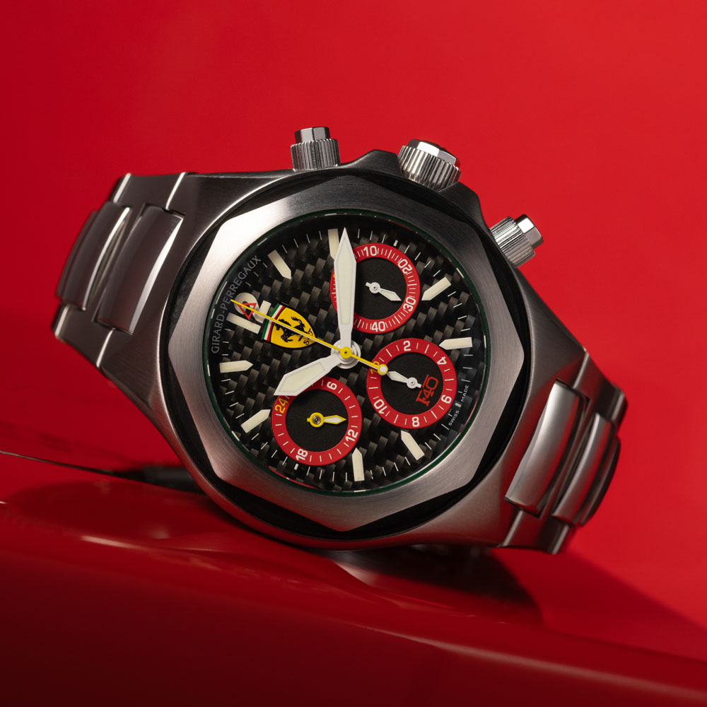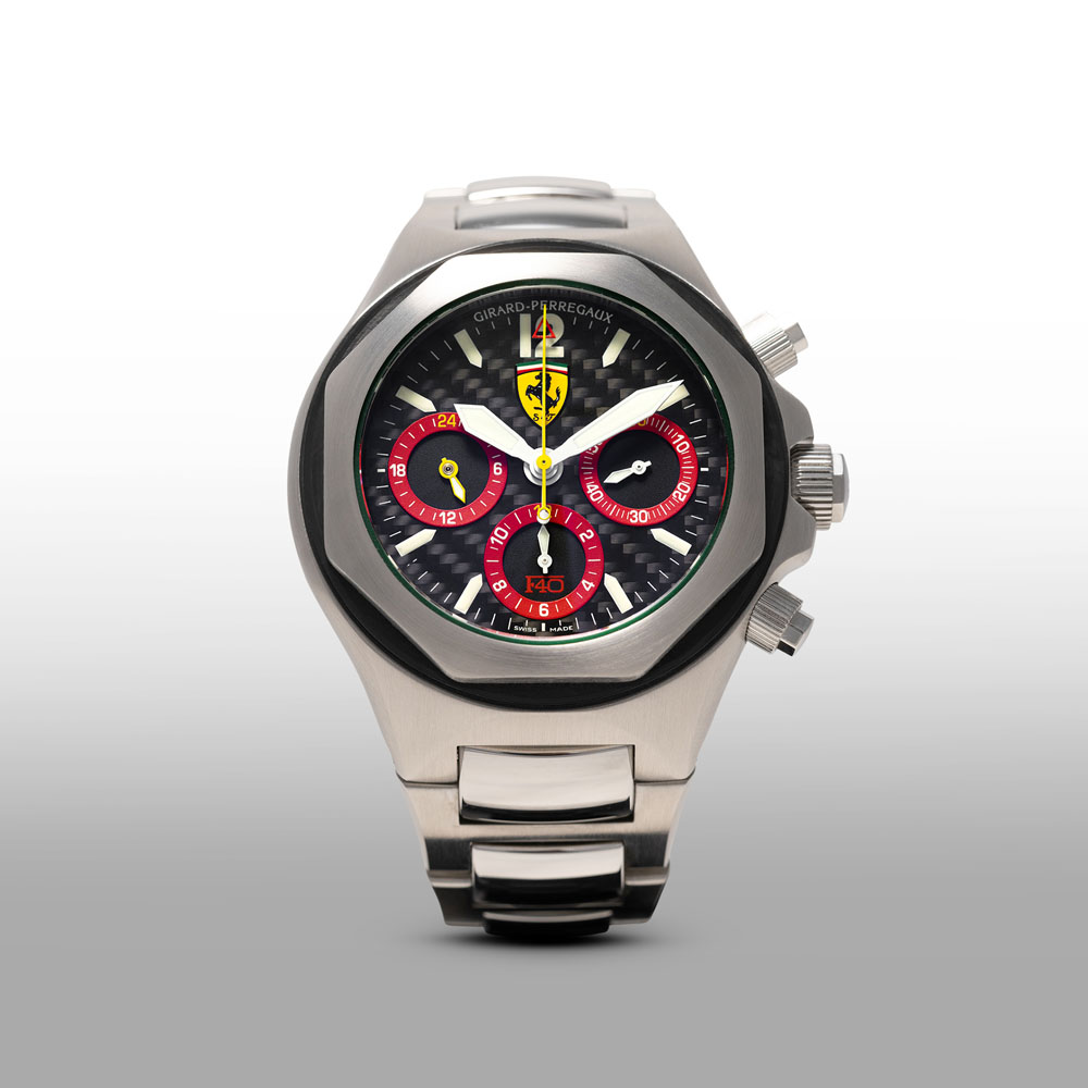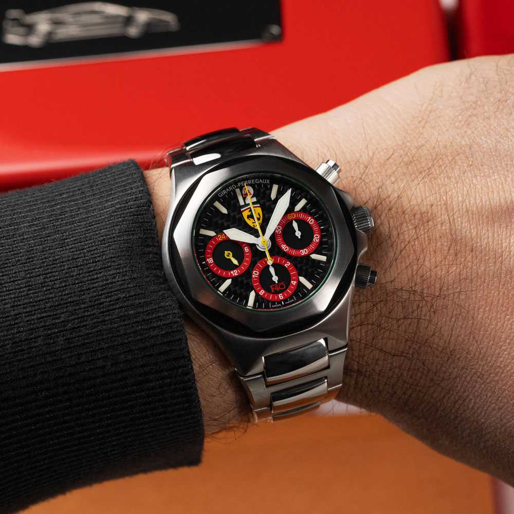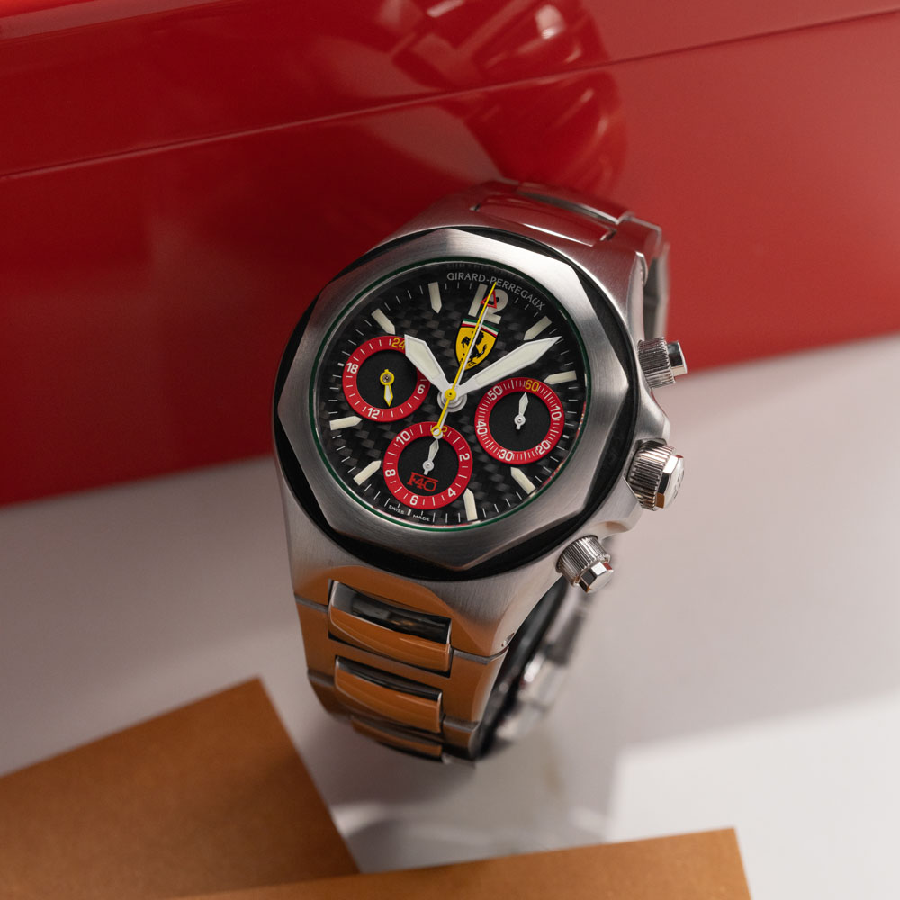 Girard-Perregaux ha una storia recente nella quale c’è largo spazio per il mondo dei motori. Oltre alla partnership con Aston Martin che dura tuttora, negli anni ’90 creò alcuni orologi destinati a essere donati ai dirigenti della Fiat che festeggiavano i 30 anni in azienda. Ma, tra le referenze più interessanti e ricercate che uniscono il marchio di La Chaux-de-Fonds con il motorsport, c’è il Laureato Chronograph realizzato per celebrare il lancio della Ferrari F-40. L’auto fu presentata nel 1987 per i primi quarant’anni di attività sportiva della casa automobilistica ed era dotata di un motore V8 2.9L da 478 CV. È stata l’auto di serie più veloce tra il 1987 e il 1989, raggiungendo i 324 km/h. Ne dovevano essere costruite solo 400, ma al termine della produzione ne furono consegnate più di 1000. A quell’anniversario, Girard-Perregaux dedicò una versione cronografo dell’iconico Laureato realizzata in edizione limitata di 500 pezzi, diventata in breve tempo molto ricercata da collezionisti e appassionati.