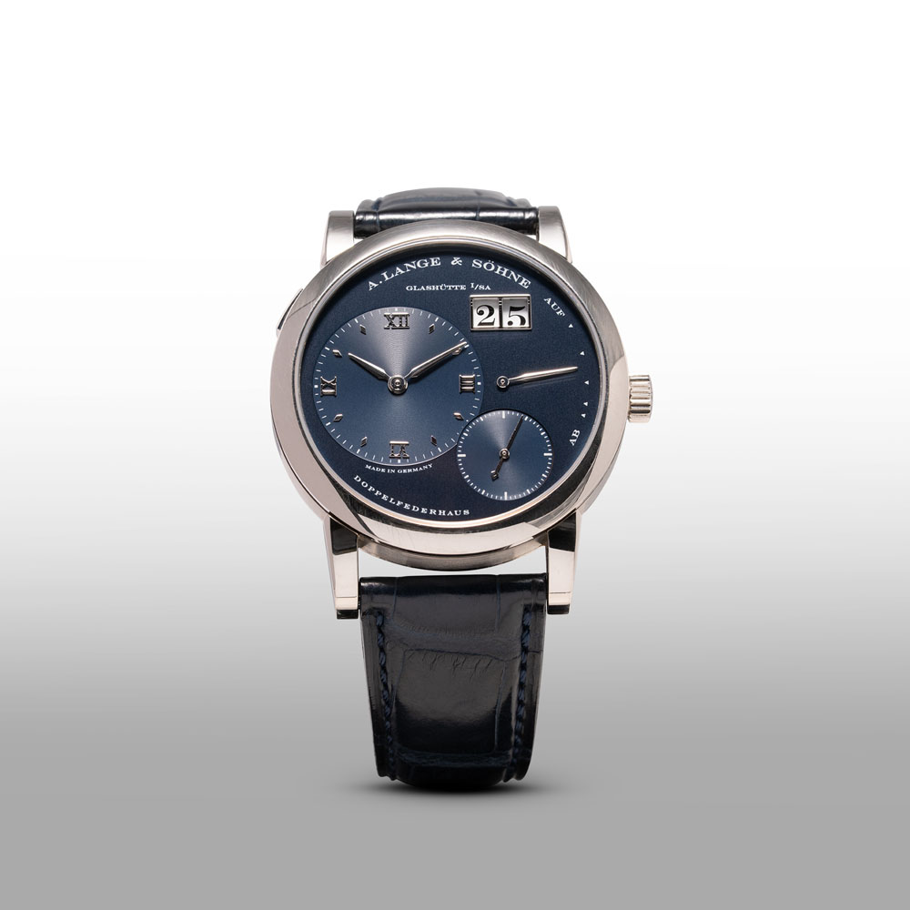 L’orologio qui proposto, è una ref. 101.027, che è stata prodotta regolarmente da A. Lange & Söhnedal 1997 al 2002. Presenta una cassa in oro bianco di dimensioni tradizionali (38,5 mm) con fondello a vista, un quadrante blu con finitura spazzolata verticale, lancette e indici in numeri romani in oro bianco e dischi della data bianchi con stampa nera. L’orologio è dotato di un cinturino in pelle di coccodrillo blu con fibbia ad ardiglione in oro bianco. Durante tutto il suo ciclo di produzione, la ref. 101.027 è stata alimentata esclusivamente dal movimento originale Lange 1, calibro L901.0, basato sul treno di ingranaggi del calibro 822 di Jaeger-LeCoultre. Nel 2017, l’orologio è stato reintrodotto nell’ambito della “Serie Blu” con la referenza 191.028, con un movimento e una finitura del quadrante aggiornati. L’orologio qui proposto è offerto con la sua scatola originale e con l’estratto di archivio.