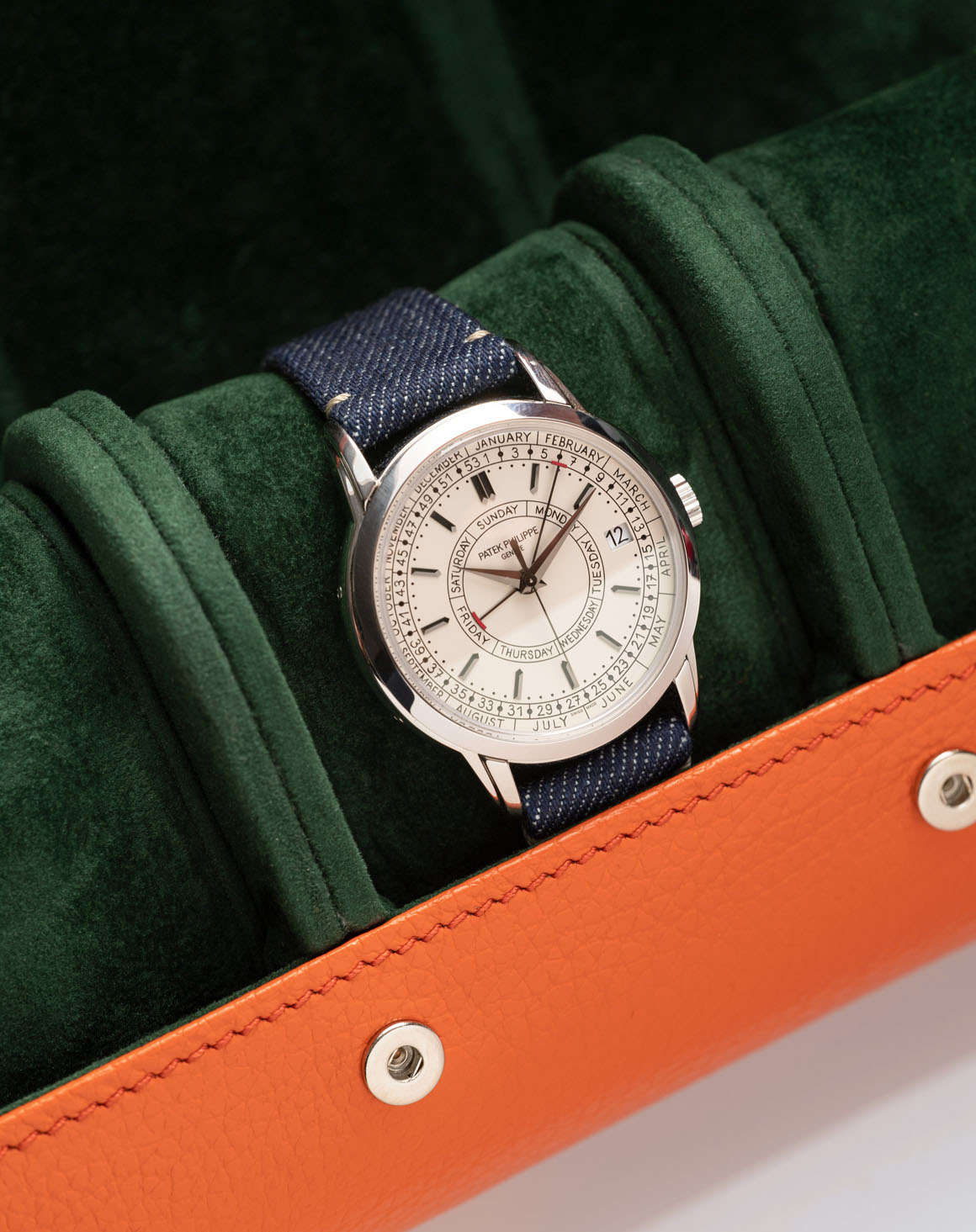 Pensato per custodire fino a tre orologi, il nostro watch roll è l’accessorio ideale dove riporre i tuoi segnatempo. Realizzato esternamente in pelle con fodera interna in suede è dotato di un sistema di binari interni che permette a ogni cuscino di scivolare e bloccarsi all’interno della propria sezione con facilità e precisione.