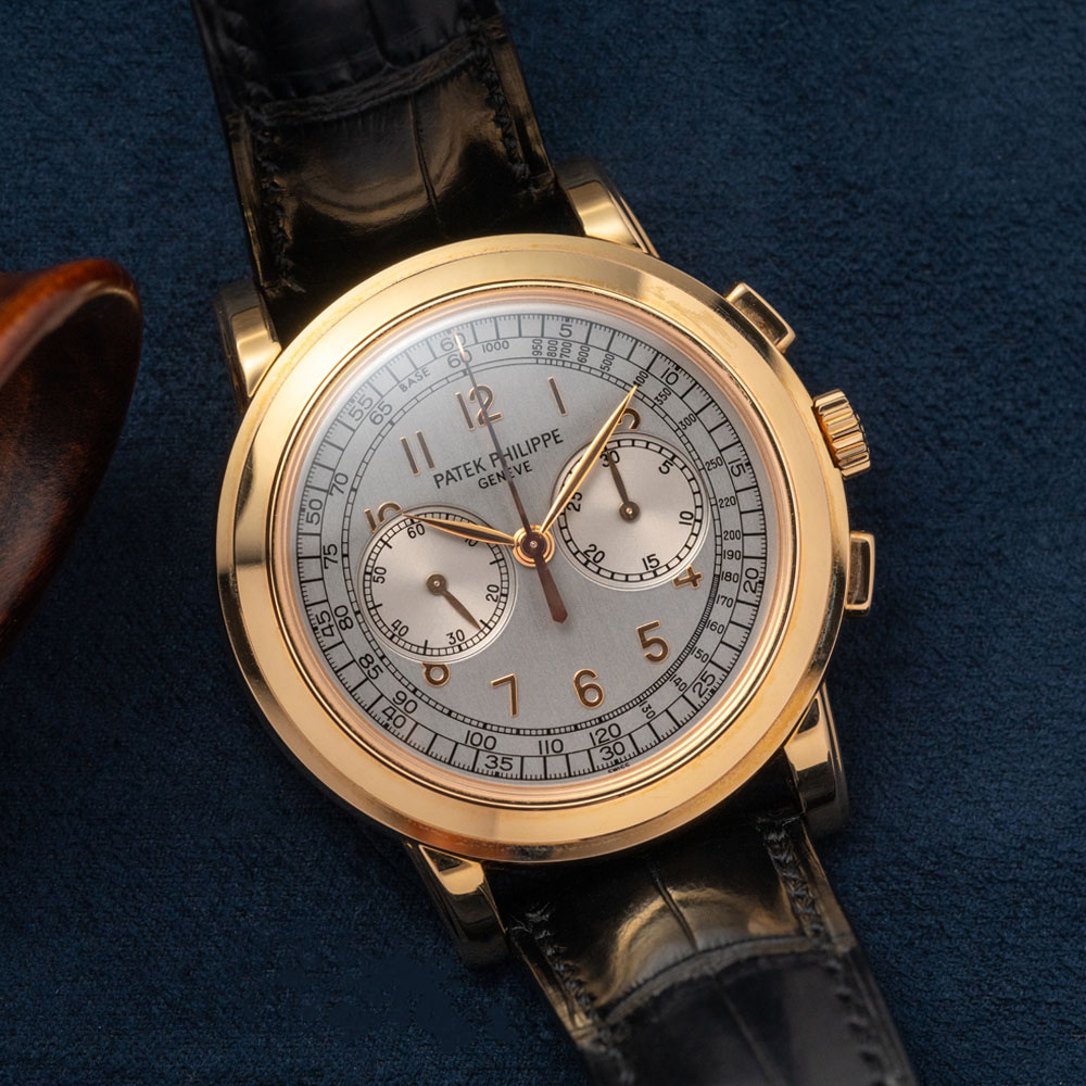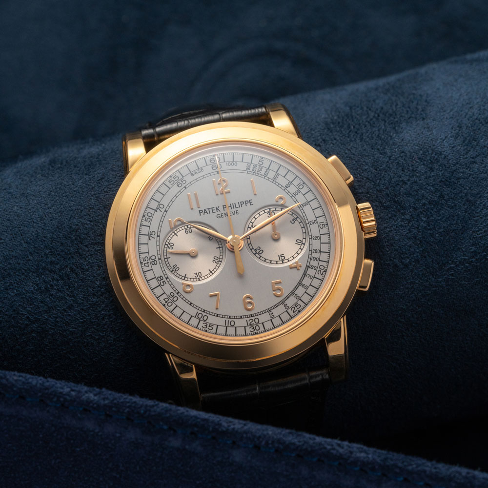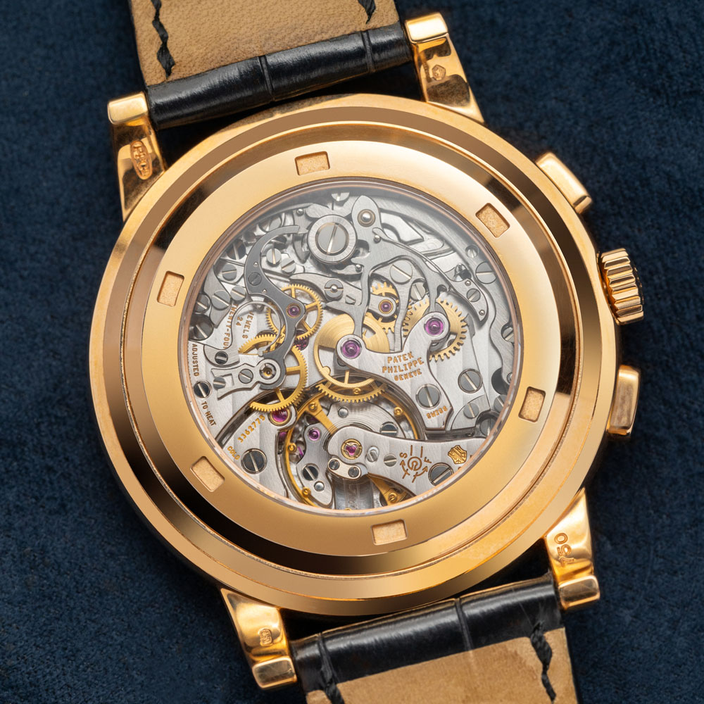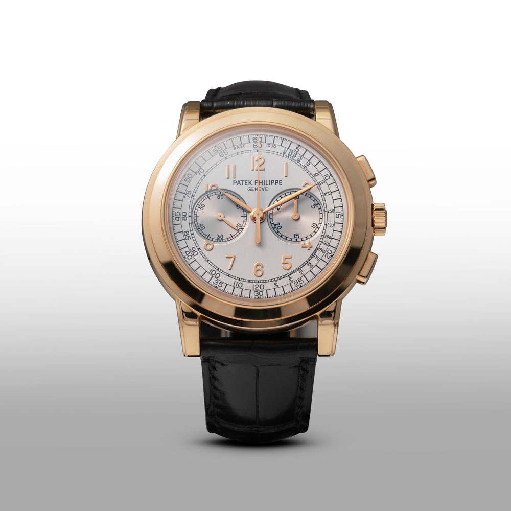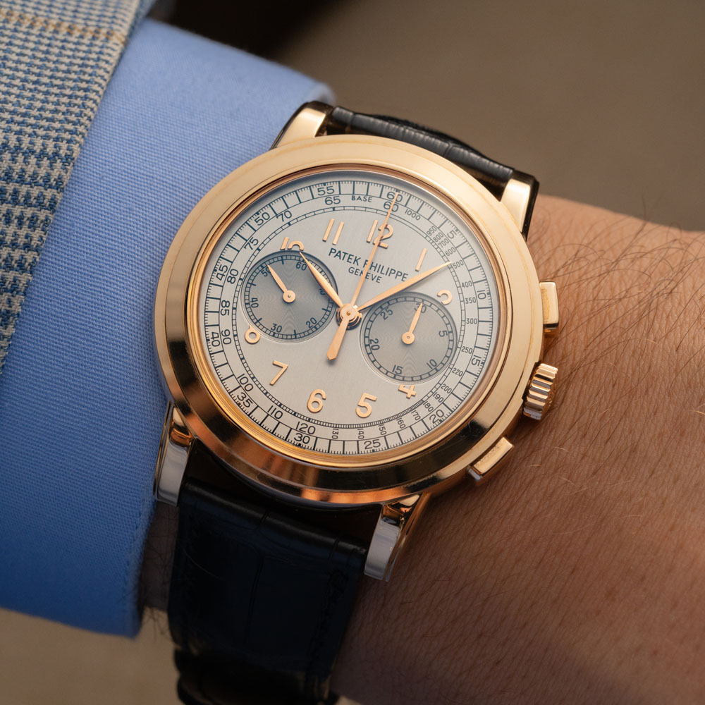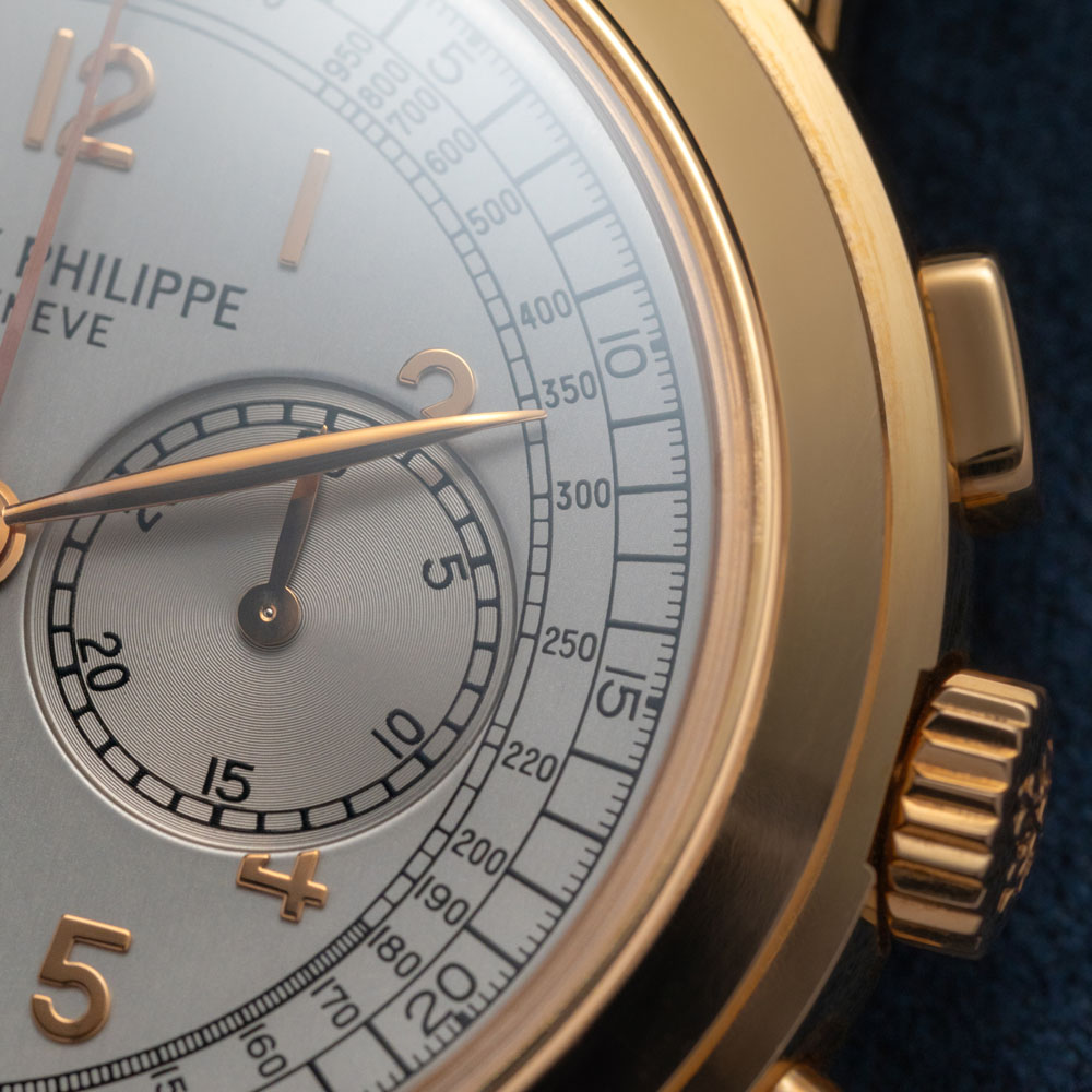 L’orologio che potete ammirare in queste foto incarna i valori tecnici ed estetici della Maison. È un esemplare del 2006, seconda serie della referenza 5070, una famiglia di cronografi a carica manuale per la quale Patek Philippe ha ripreso la produzione nel 1998. La realizzazione della seconda serie della referenza 5070 inizia nel 2002 e termina nel 2008. È caratterizzata da una cassa in oro rosa da 42 mm con quadrante silver e grafiche nere. Presenta una scala dei secondi con precisione al quinto e la scala tachimetrica all’interno della minuteria. I contatori, a ore 3 quello dei 30 minuti cronografici e a ore 9 quello dei piccoli secondi, sono grandi e centrati in modo da rendere il quadrante equilibrato. Il cuore dell’orologio è il calibro manuale a base Lemania CH 27-70, con una frequenza di 18.000 alternanze/ora e una riserva di carica di circa 60 ore. È possibile ammirarlo attraverso il fondello in vetro zaffiro. La referenza 5070 è l’ultimo cronografo di Patek Philippe a incassare calibri a base Lemania.