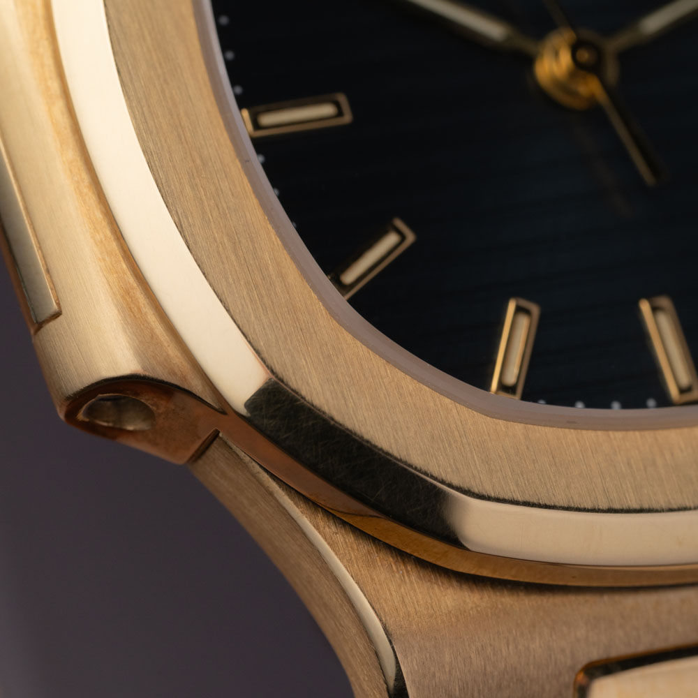 Il quadrante è inconfondibile: tono scuro sfumato con rilievo orizzontale inciso, indici applicati al trizio, sfere a bastone lucidate (con inserti luminosi) e finestra data ad ore 3. Gli indici e le sfere sono realizzati in oro giallo, come suggerisce la presenza della lettera “sigma” nella parte inferiore del quadrante. Come per l’originale referenza 3700 (nota anche come “Jumbo”), la cassa e il bracciale integrato in oro giallo 18 carati sono sapientemente rifiniti, con bordi angolari, smussati e lucidati. Le viti, la lunetta e i bordi della cassa lucidati, nel contrasto con la superficie spazzolata della cassa e del bracciale donano all’orologio grande fascino. Il diametro di 37,5 millimetri e lo spessore di soli 7,5 millimetri, rendono poi il Nautilus 3800 incredibilmente comodo e versatile.