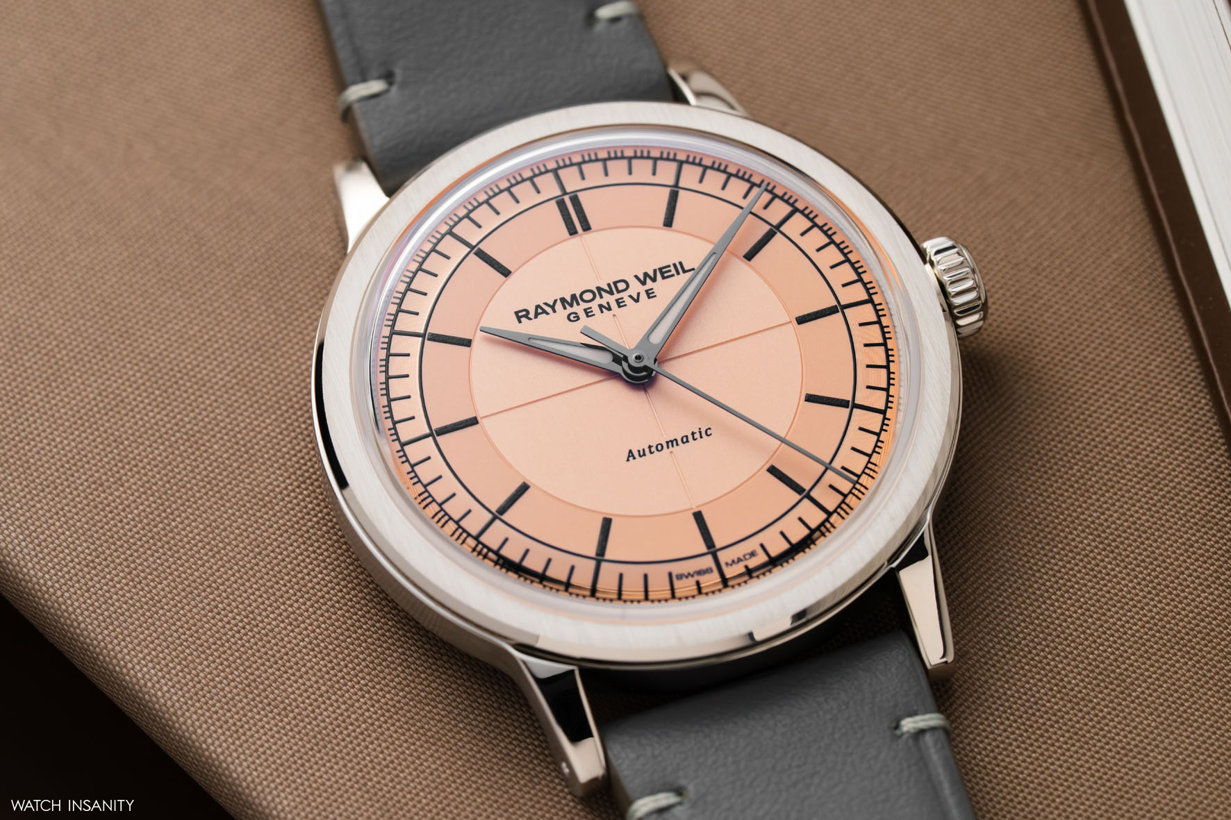 Interessante, nella parte centrale, la presenza del mirino. È spesso un dettaglio degli orologi vintage e qui Raymond Weil lo ha realizzato in chiave moderna, incidendolo sul quadrante e lavorandolo in uno stile tono su tono anziché stamparlo a contrasto. Oltre al silver, l’assortimento di colori comprende lo champagne, il verde, il blu, l’antracite, il salmone e una interessante nuance color crema.