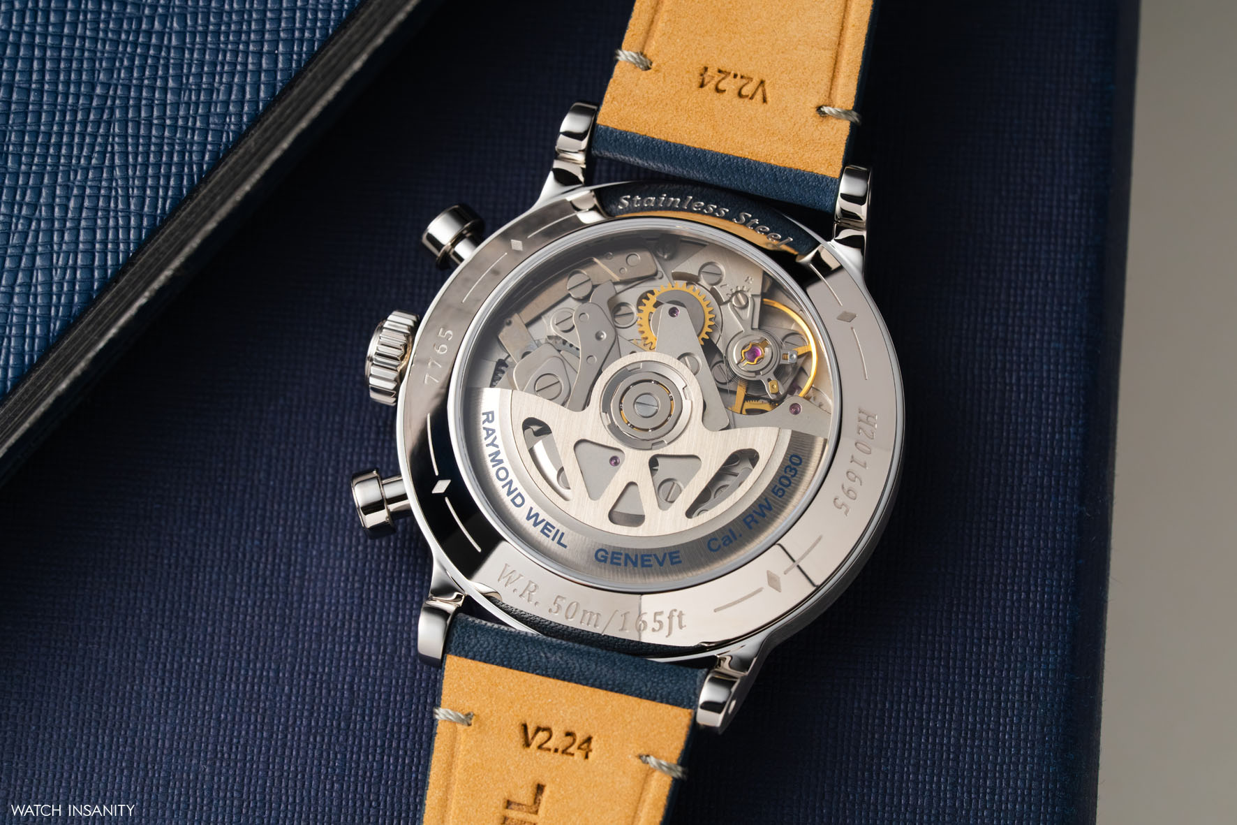 Il calibro che muove il Millesime Chronograph è l’RW5030, sviluppato da Raymond Weil sulla base del Sellita SW510. È un calibro automatico robusto e affidabile, visibile attraverso il fondello dell’orologio, che lavora a 28.800 alternanze/ora per un’autonomia più che discreta di 62 ore. Le funzioni del cronografo sono attivate attraverso i tasti a pompa, dall’estetica retrò, che danno all’orologio un bel bilanciamento in termini di proporzioni.