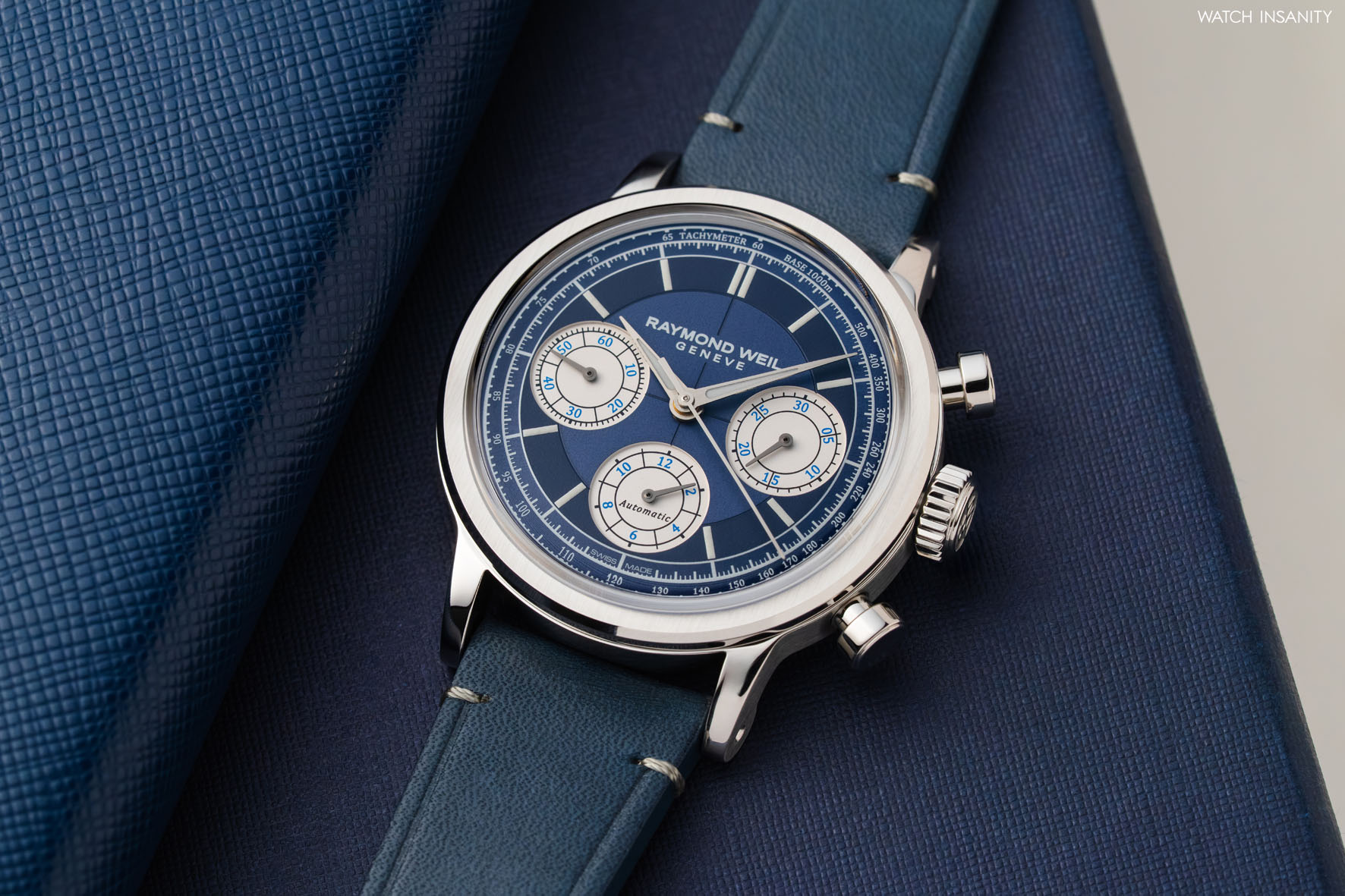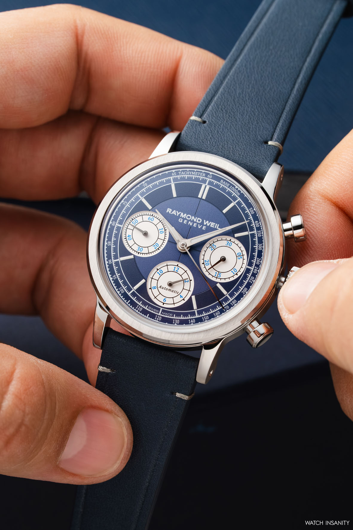 Chiudiamo la presentazione della collezione Millesime con il Chronograph, tra tutte le linee quella più sportiva. Sono 8 le referenze nelle quali Raymond Weil ha declinato questo cronografo dall’estetica fortemente vintage e noi abbiamo scelto di presentarvi nelle nostre immagini quella con il quadrante blu con contatori bianchi, molto sportiva. Accanto a questa troviamo i Chronograph con quadrante antracite, con quadrante nero e contatori tono su tono, con quadrante nero e contatori bianchi e con quadrante argento e contatori verdi (in edizione limitata). La cassa in acciaio è solo quella da 39 mm per 12,9 di spessore e nella versione dell’orologio con quadrante nero e contatori bianchi ha un trattamento PVD oro rosa.