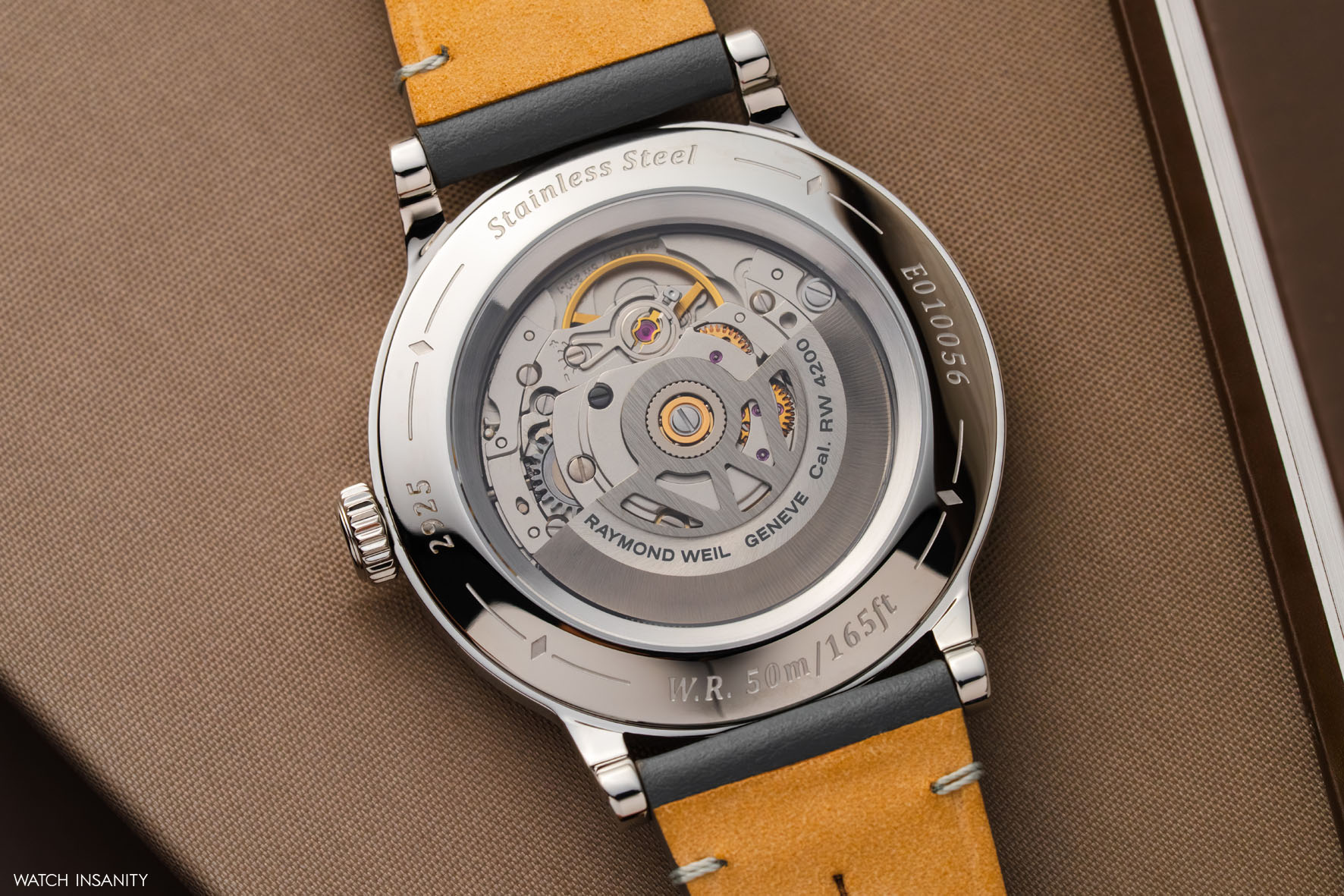 La cassa in tre parti, impermeabile fino a 5 bar, alterna una combinazione di superfici lucide e satinate sulla carrure; ha la lunetta piatta, sottile, satinata verticalmente che corona un vetro zaffiro glassbox con trattamento antiriflesso su entrambi i lati il quale, come il resto dell’orologio, unisce praticità moderna e fascino retrò. È disponibile in acciaio o in acciaio con trattamento PVD color oro rosa. Ospita il calibro automatico RW4251 (visibile attraverso il fondello in vetro zaffiro), sviluppato da Raymond Weil sulla base del Sellita SW 261, che opera a 28.800 alternanze/ora e ha un’autonomia di circa 38-41 ore.