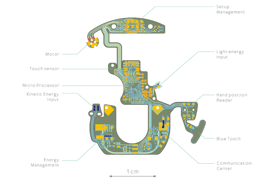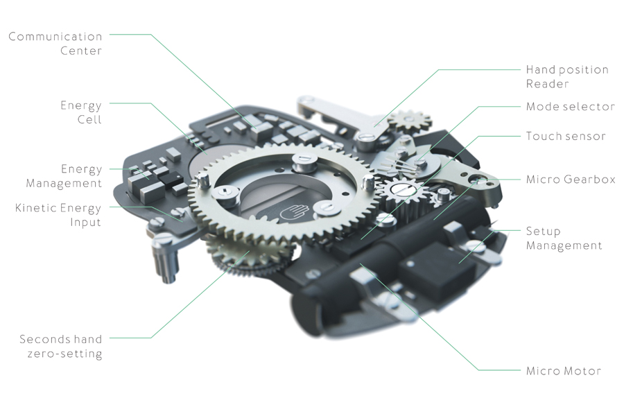 Il Type 2 e-Crown Concept è un orologio meccanico completamente autosufficiente, basato su due fonti di energia naturale: il movimento del polso e la luce esterna. Il movimento è azionato da un rotore a carica automatica, mentre l’ e-Crown è alimentato da un generatore cinetico e da celle fotovoltaiche. Il generatore cinetico, consiste nella massa oscillante in titanio grado 5, che carica anche la molla nel bariletto. Le celle fotovoltaiche a tripla giunzione, sviluppate per Ressence, sono nascoste sotto 10 micro-otturatori situati attorno al disco del selettore. Si aprono automaticamente quando il bilancio energetico è basso e possono essere controllati tramite l’app.