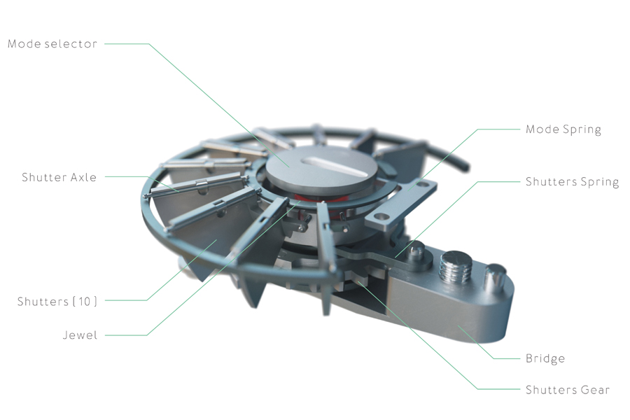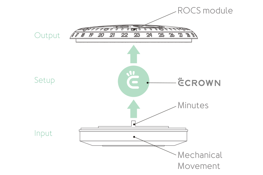 Il Type 2 e-Crown Concept introduce una nuovissima generazione di ROCS, acronimo di Ressence Orbital Convex System. Completamente progettato e sviluppato in-house, questo modulo d’orologeria brevettato è composto da dischi complanari e anelli di diverse dimensioni in titanio grado 5, curvi e allineati per adattarsi alla curva di una sfera con un raggio di 75mm. Tutte le indicazioni temporali del Type 2 e-Crown Concept sono generate dal ROCS a partire dalle informazioni fornite dal movimento automatico di base. Sul Type 2 e-Crown Concept tutti i dischi sono montati su cuscinetti a micro-sfere in rubino per un’architettura più sottile. Gli spazi tra i dischi sono stati ridotti a 35 micron, permettendo un design più pulito e compatto.