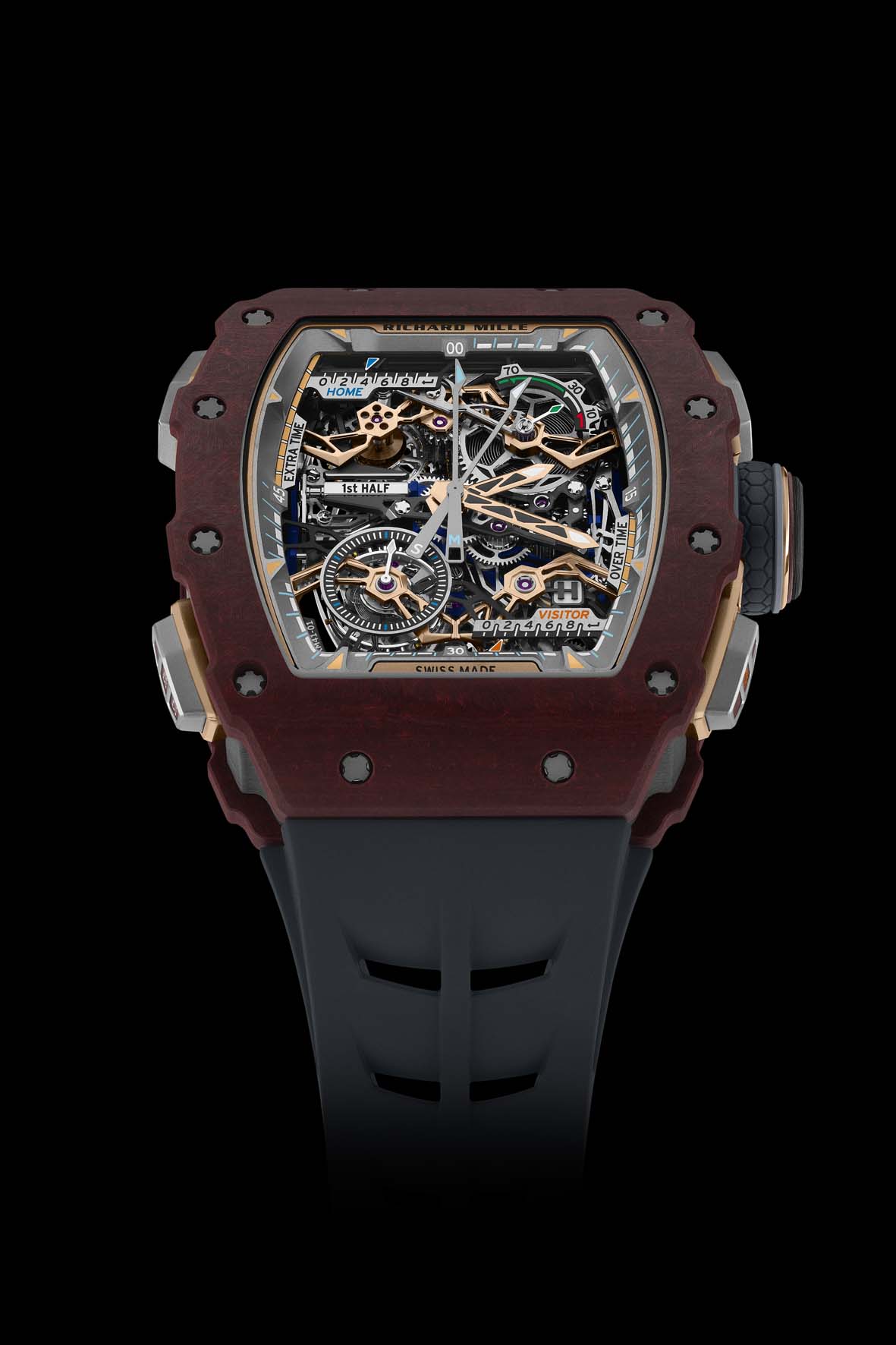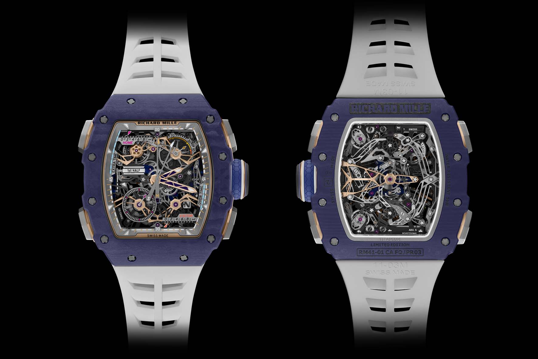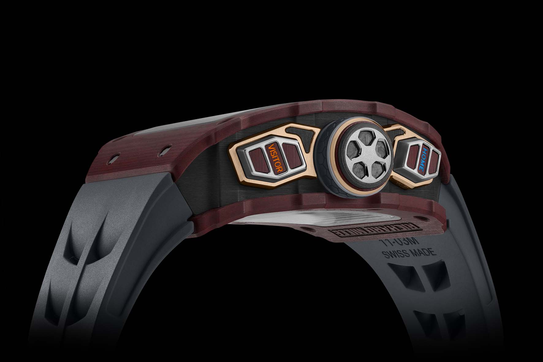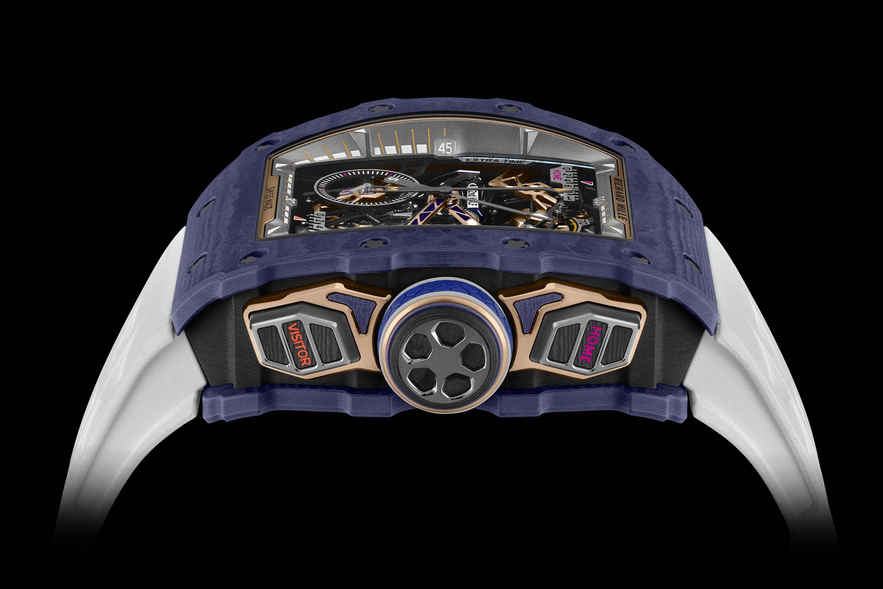 A incorniciare il movimento, le flange in titanio micropallinato e satinato, un trionfo di lavorazioni complesse, mettono in mostra la seconda complicazione esclusiva dell’RM 41-01: i contatori meccanici dei gol. Questi tengono traccia dei punteggi delle squadre di casa e ospiti utilizzando i pulsanti a ore 2 e 4. Ogni pressione fa avanzare le lancette lungo binari metallici tramite un apposito treno di ingranaggi, mostrando fino a nove gol prima di tornare automaticamente a zero.