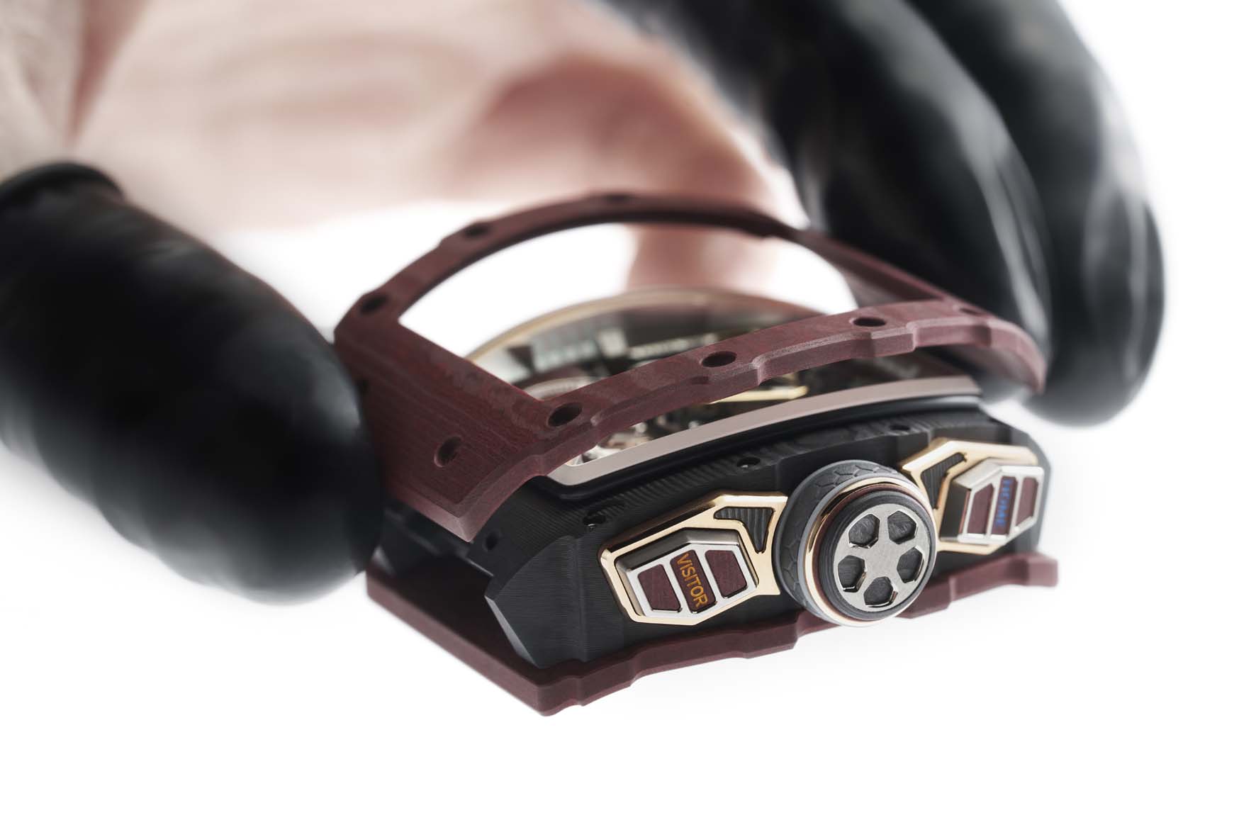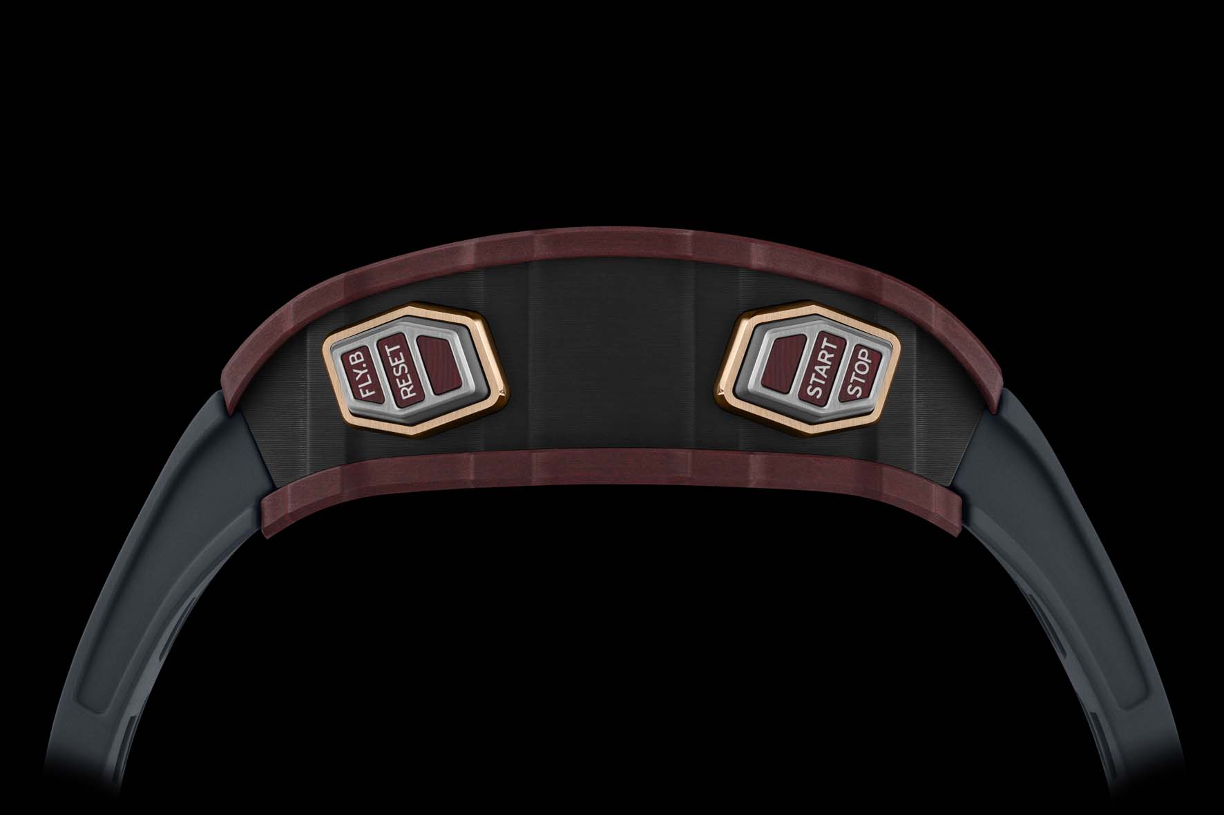 Mostrando una meticolosa attenzione ai dettagli e all’ergonomia, i pulsanti sono realizzati in titanio micropallinato con smussi lucidati, inserti in Carbon TPT o Basalt TPT e protezioni in oro 5N. La loro percezione tattile è uniforme per tutte le funzioni, il che significa che ogni pulsante richiede la stessa pressione per attivarsi, grazie a leve calibrate con precisione e all’aggiunta di una ruota a colonne dedicata per la funzione di azzeramento. Normalmente avvertita come molto brusca, questa funzione ora offre la stessa raffinata sensazione tattile delle altre. Questa innovativa costruzione cronografica flyback con doppia ruota a colonne è stata brevettata.