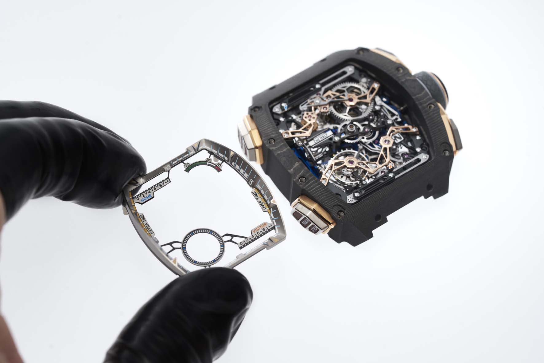 Per dare vita a questa visione, il Marchio è partito da un foglio bianco. Il team ha impiegato cinque anni sviluppare un calibro cronografico tourbillon flyback completamente nuovo e brevettato. Vengono introdotte due nuove complicazioni: l’indicazione della fase di gioco e il contatore meccanico delle reti, a dimostrazione della propria capacità di unire funzionalità specifiche per lo sport con l’orologeria meccanica