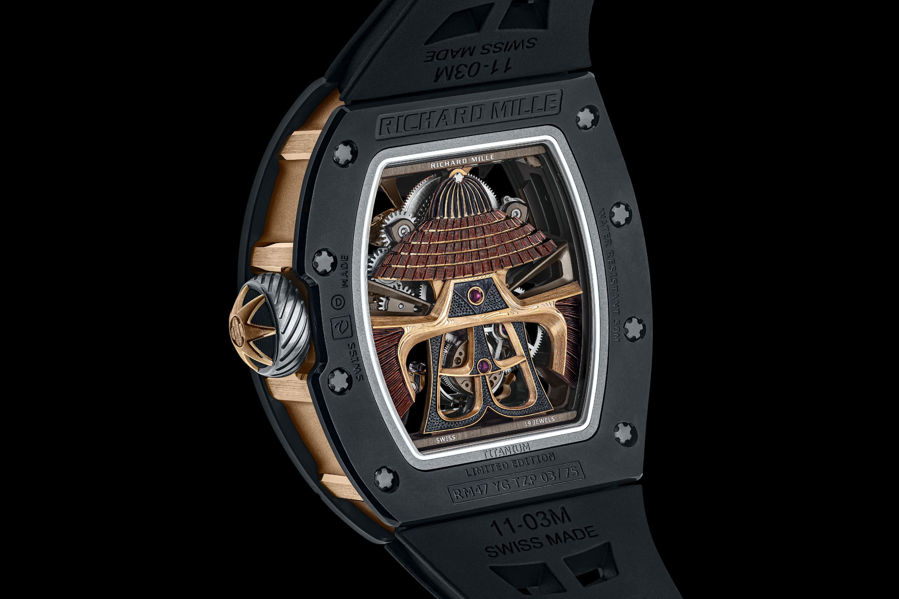 Il movimento, la cassa e la decorazione dell’RM 47 testimoniano un approccio progettuale volto a garantire l’armoniosa ed efficace integrazione di tutti i vari elementi. La cassa a forma di botte e impermeabile fino a 50 metri è composta da tre parti con la struttura centrale in oro giallo 3N che ospita una lunetta e un fondello in ceramica TZP nera. Con la loro estetica eccezionale, i 75 esemplari dell’RM 47 Tourbillon evocano la spiritualità e i valori del bushido, dimostrando una risoluta ricerca della perfezione nel rispetto delle tradizioni.