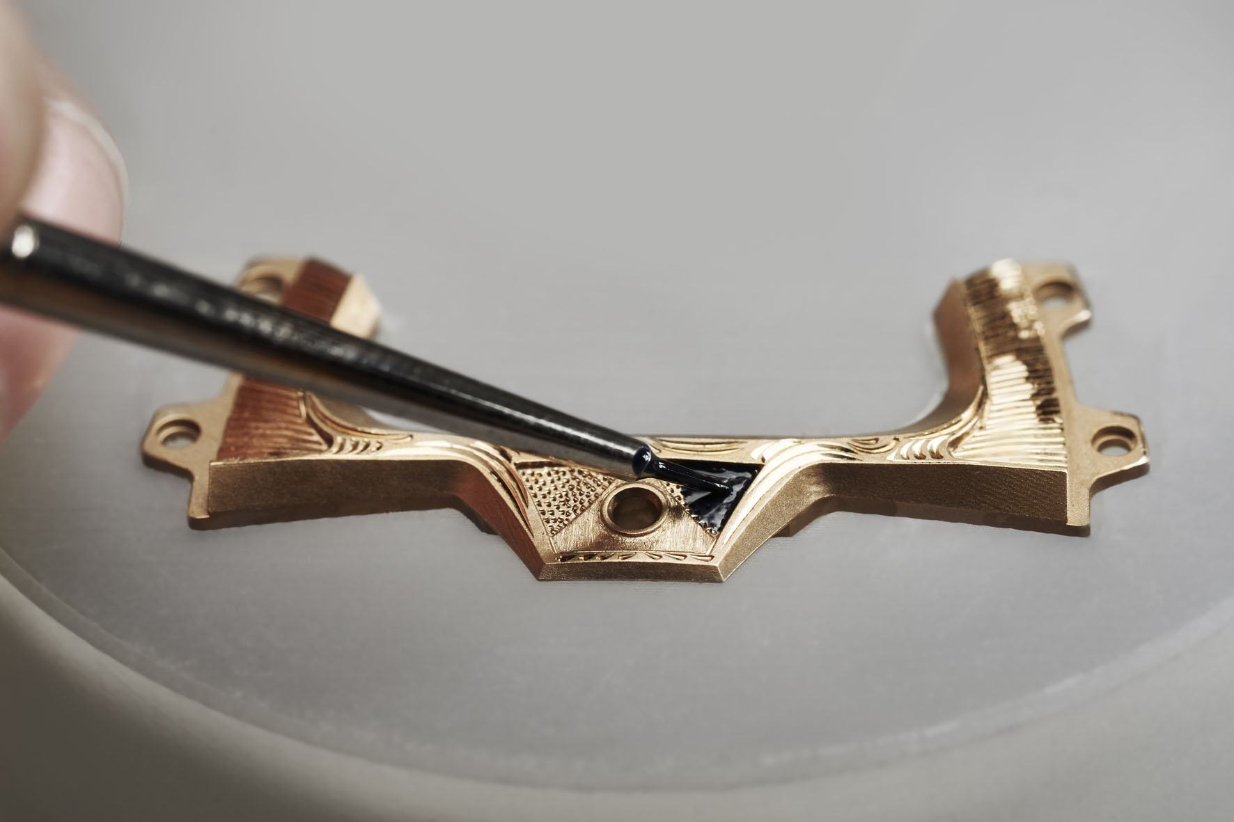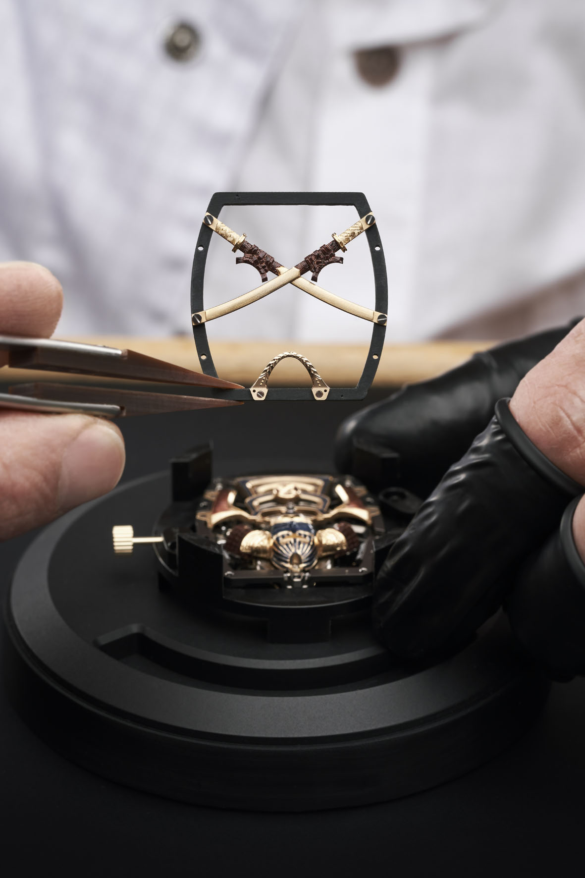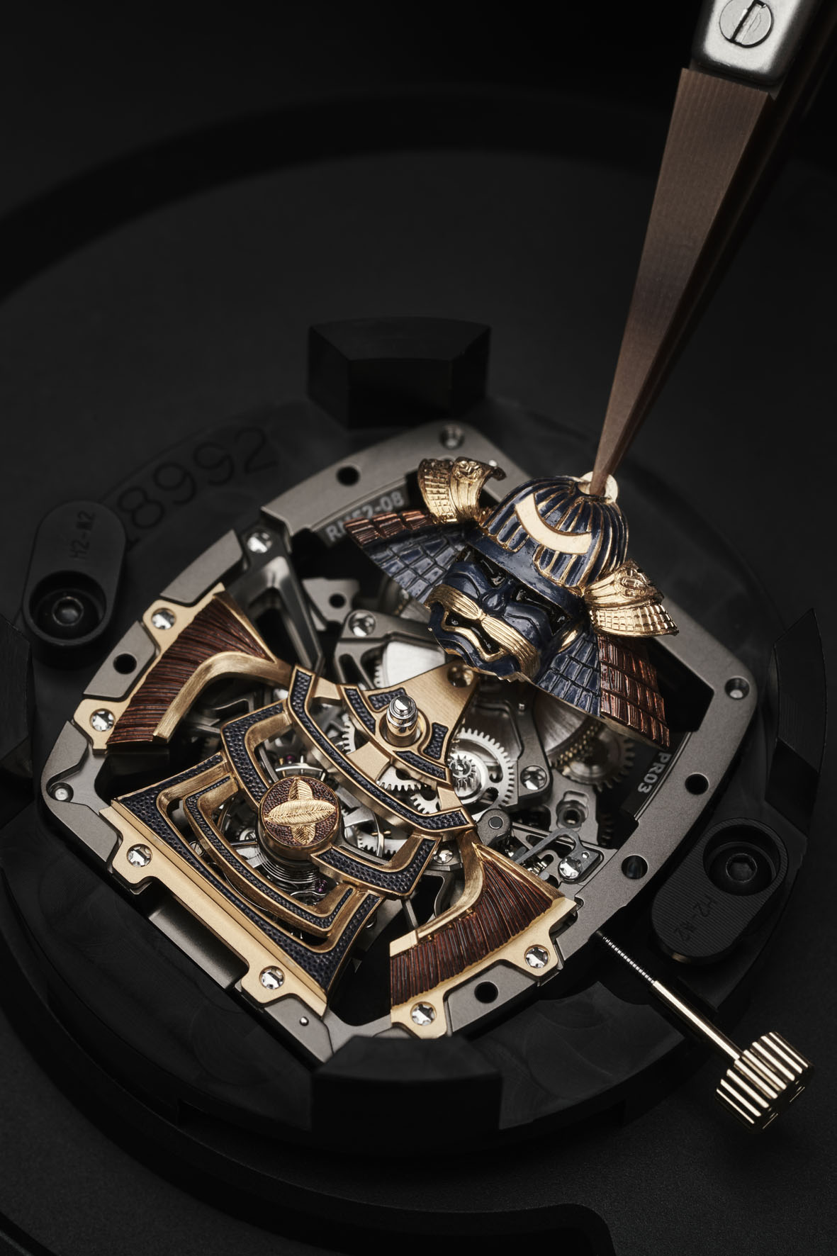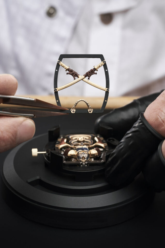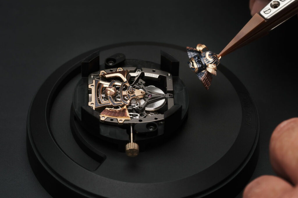 Questa decorazione, che è più un’opera di scultura che un’incisione, ha richiesto pazienza, meticolosità, manualità e passione. «Tra spada e cesello, tra il tagliente della lama e le precise incisioni frutto della maestria tecnica dell’incisore, ci sono molti parallelismi per evocare le somiglianze tra le capacità di questi guerrieri e quelle richieste ai nostri maestri artigiani», spiega Pierre-Alain Lozeron. In totale, occorrono ben 16 ore di incisione e 9 ore di pittura, in tutto, più di un’intera giornata, per ottenere gli 11 componenti che compongono il Samurai, perfettamente integrati, davanti e dietro, attorno al movimento del RM 47 Tourbillon.