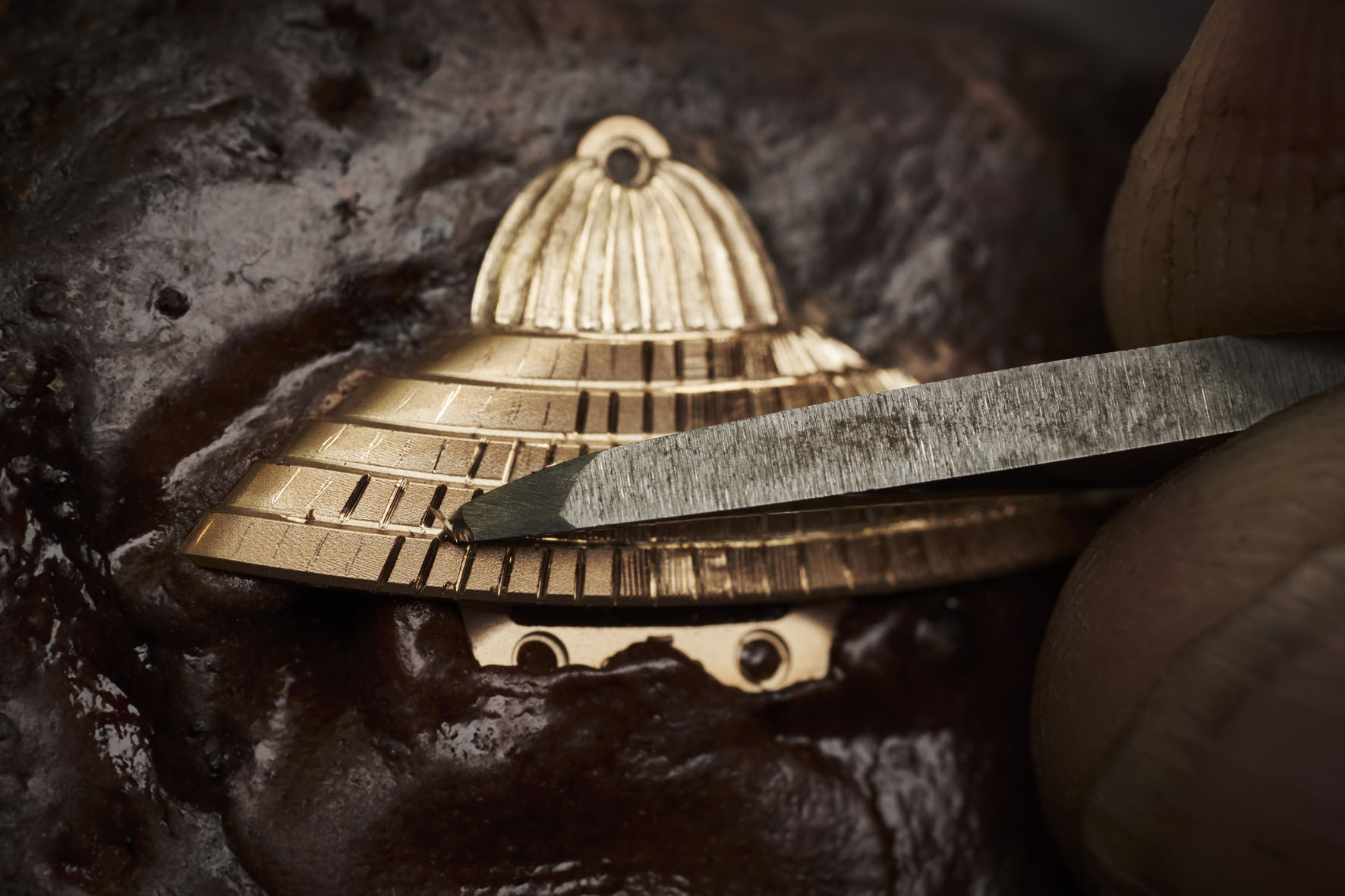 Questo nuovo modello trascende i limiti creativi e si inserisce nella prestigiosa stirpe degli orologi «ornamentali» tipici del marchio. Interamente realizzata a mano dall’incisore Pierre-Alain Lozeron e dipinta dalla moglie Valérie Lozeron, l’armatura da samurai incorpora i diversi aspetti della cultura ancestrale giapponese. Evocando lo spirito del bushido, il codice etico dei Samurai i cui valori prevalgono ancora nella società giapponese, l’armatura prende vita da una lastra in oro giallo 3N, che ricorda l’utilizzo della foglia d’oro usata nell’antico Giappone per abbellire i più bei santuari del paese e anche alcune opere di artigianato tradizionale.