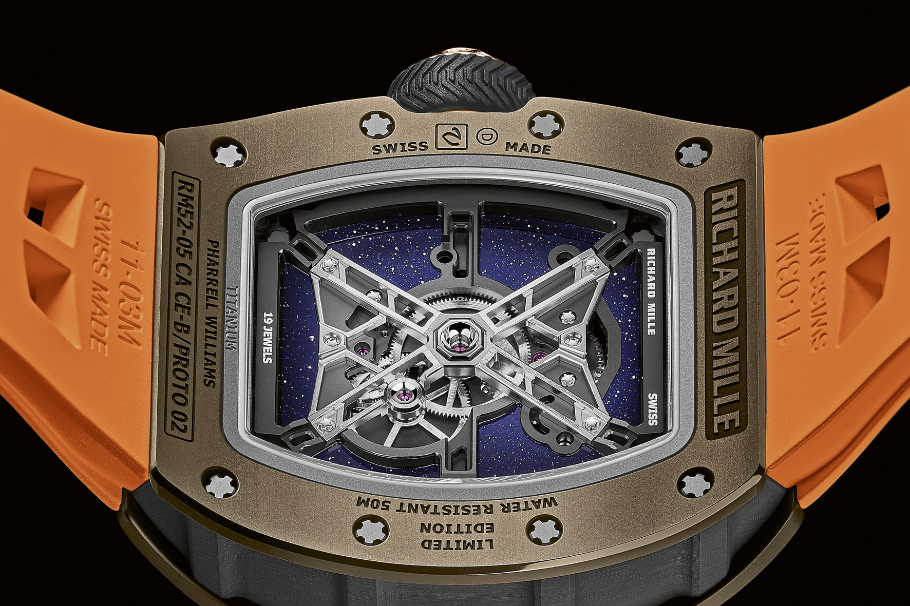 La tecnica del calibro RM 52-05 con tourbillon è incredibilmente innovativa. Equivalente a una navetta spaziale, la platina di supporto del movimento è realizzata in titanio di grado 5 attraverso la quale è possibile intravedere i ponti, in titanio di grado 5, scheletrati per richiamare le strutture delle piattaforme di lancio di razzi. È dotato di ampi inserti in vetro avventurina blu che evocano lo spazio esterno e i confini dell’universo con tutte le sue stelle.