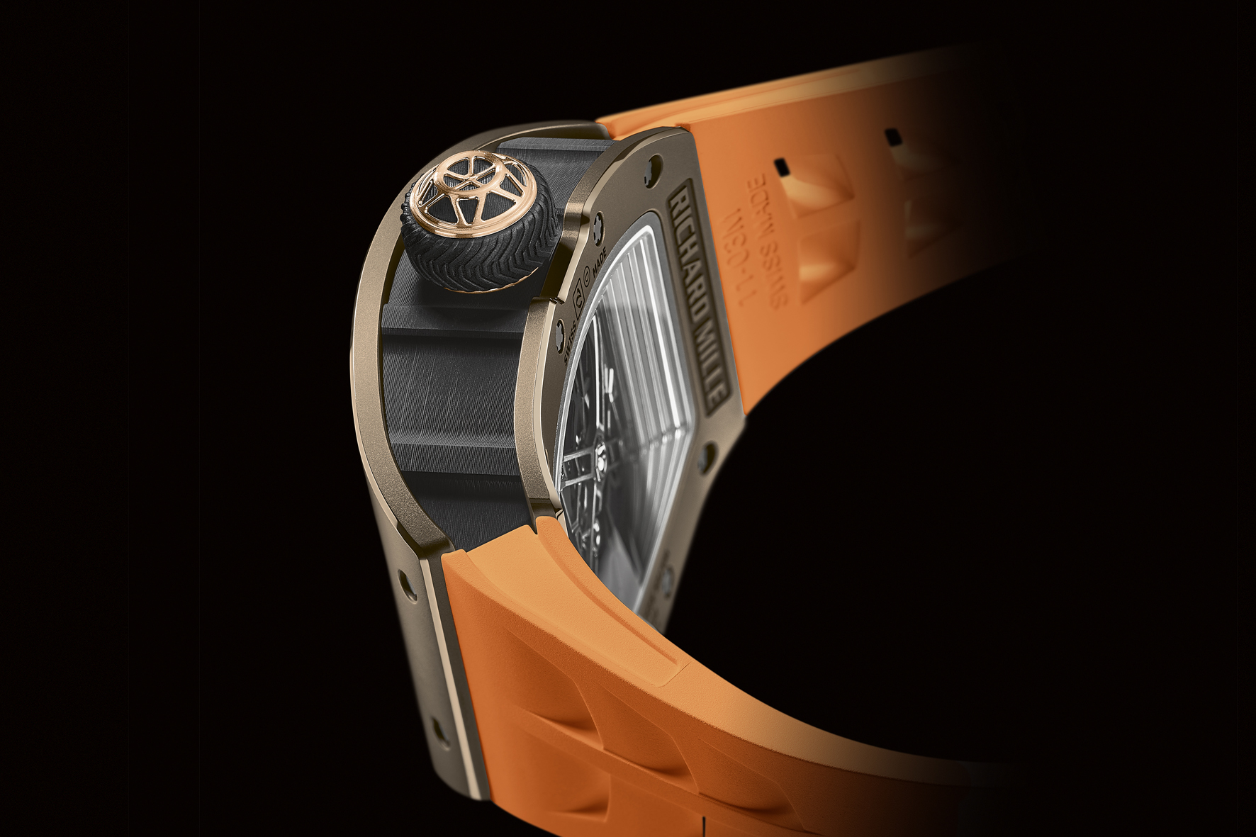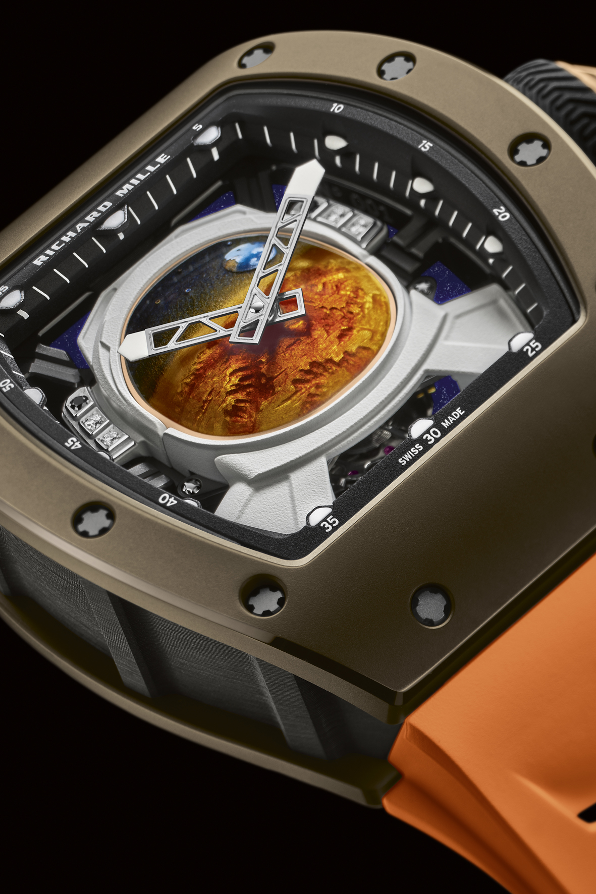 Altre innovazioni completano questo orologio ispirato al cosmo. Il Cermet della cassa combina la leggerezza del titanio con la durezza della ceramica è formato da una matrice metallica di zirconio associata ad una ceramica di elevate caratteristiche di durezza che gli conferisce un incredibile color bronzo riflettente. La carrure è realizzata in Carbon TPT, ben noto nel settore aerospaziale. Le lancette e i ponti sul retro del movimento sono stati scheletrati per rappresentare le torri delle piattaforme di lancio dei missili o i bracci dei satelliti. La corona si basa sul design di una capsula spaziale. Perfino il suo anello in gomma ricalca il disegno del battistrada degli pneumatici di un “rover” marziano.