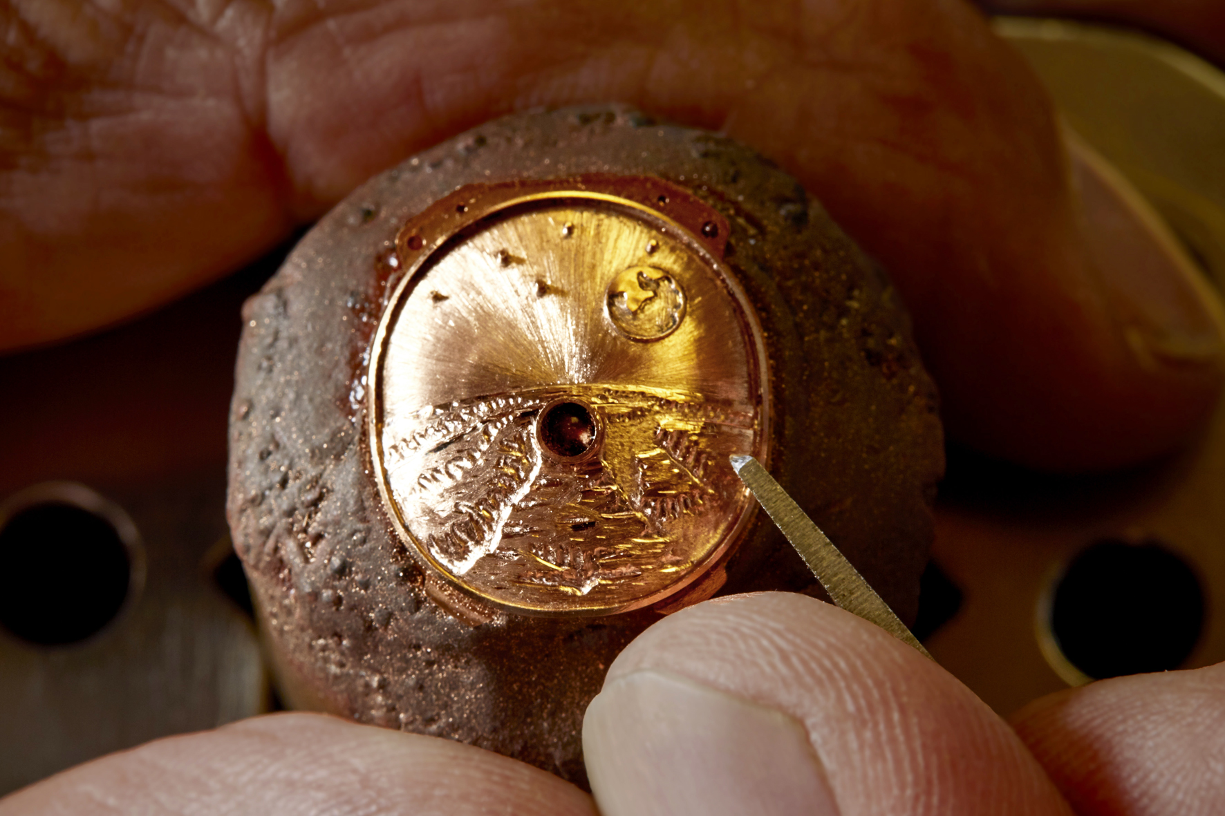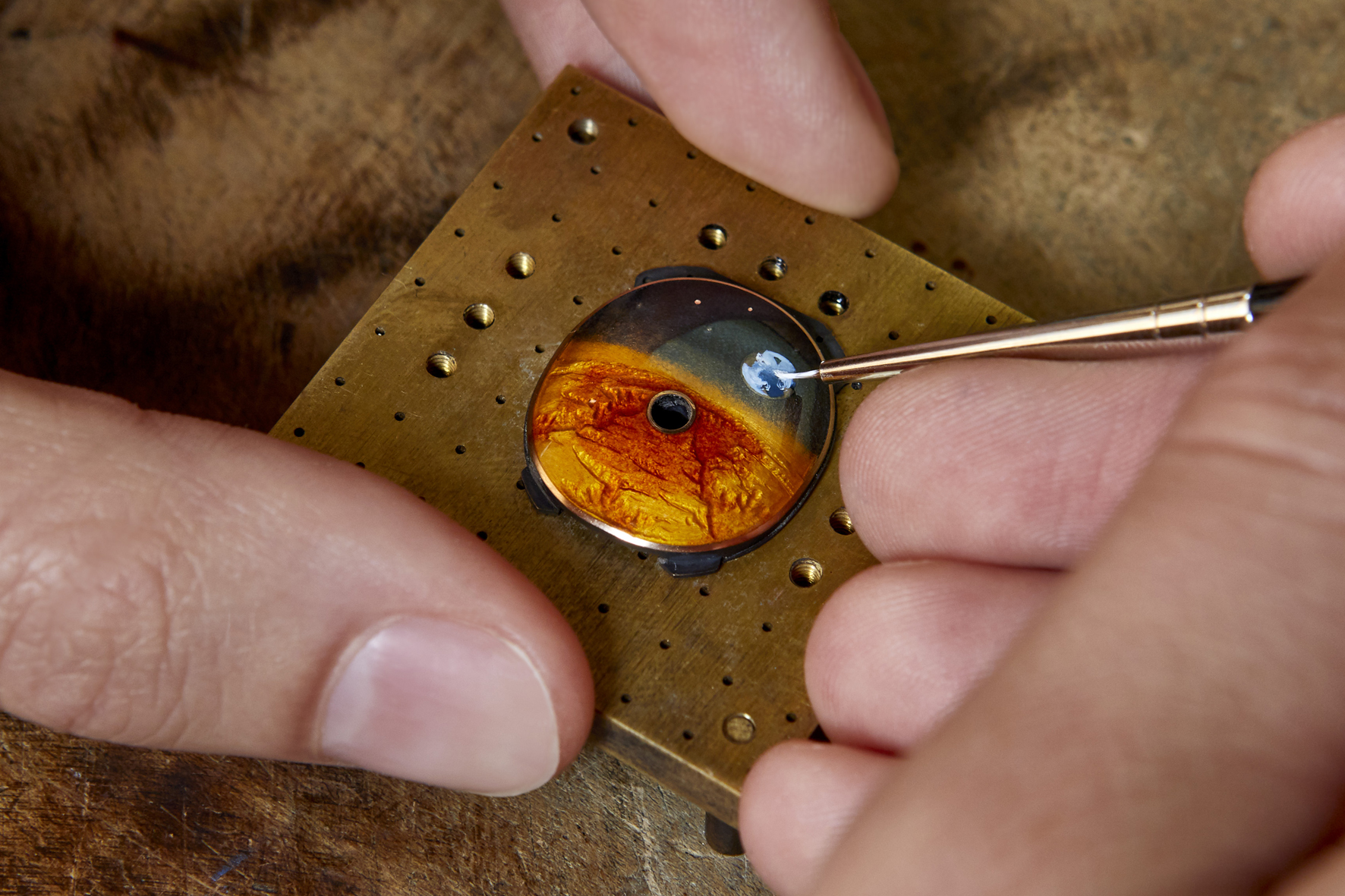 Il casco dell’astronauta è modellato in titanio di grado 5 e dipinto a mano con vernice inalterabile. Per quanto riguarda il Pianeta Rosso, solo l’oro rosso poteva dare vita alle sue inconfondibili tonalità. Siamo attratti dalle impressionanti Valles Marineris, così chiamate in onore della sonda Mariner 9, la prima inviata dell’umanità al nostro distante “vicino di casa”. L’incisione riporta l’imponente complesso di ampie fenditure nella roccia, che si aprono fino a 7 chilometri di profondità sui rugginosi paesaggi sottostanti. Per questo è stato necessario ottenere più variazioni di tonalità nello smalto. A differenza dei tradizionali smalti “grand feu”, ottenuti aggiungendo diversi pigmenti, i gradienti da arancione a rosso e da blu a nero sono stati realizzati sovrapponendo più strati e aumentando il numero delle cotture a 850 °C.
