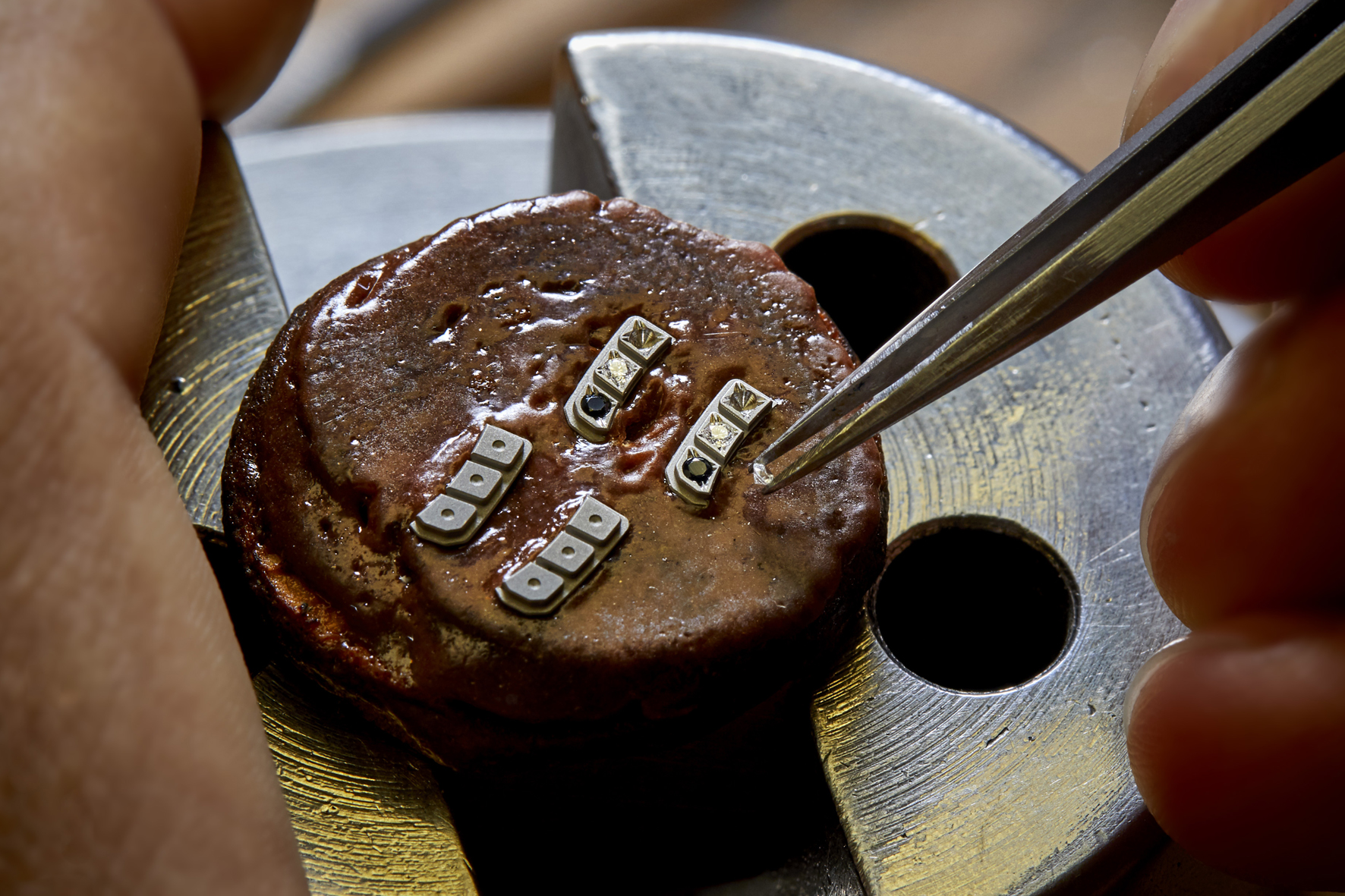 Noi diventiamo l’astronauta. Sul casco, due elementi in oro bianco che ospitano uno zaffiro nero e due diamanti, rappresentano i proiettori che illuminano l’ambiente circostante. Sulla pelle sentiamo la tuta spaziale, composta da titanio grado 5 verniciato in bianco ad aerografo.