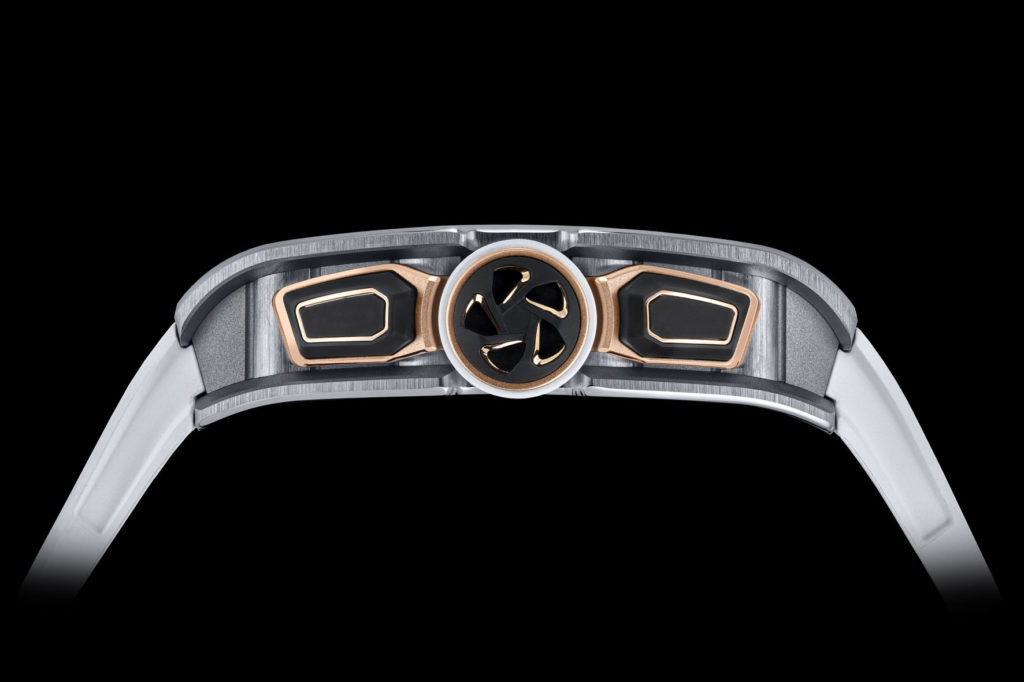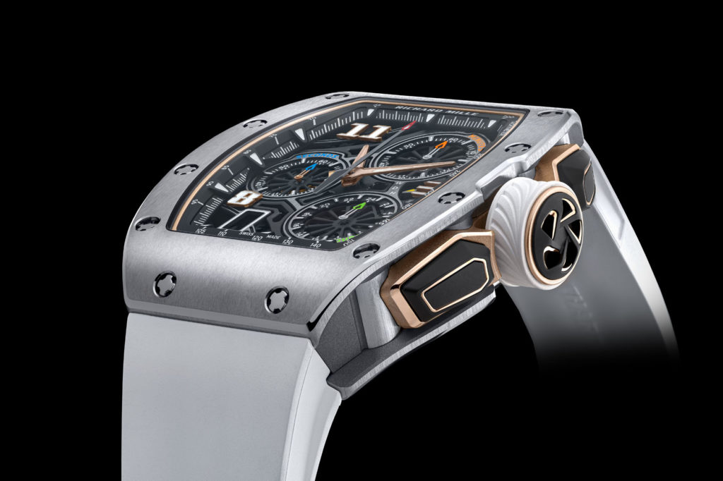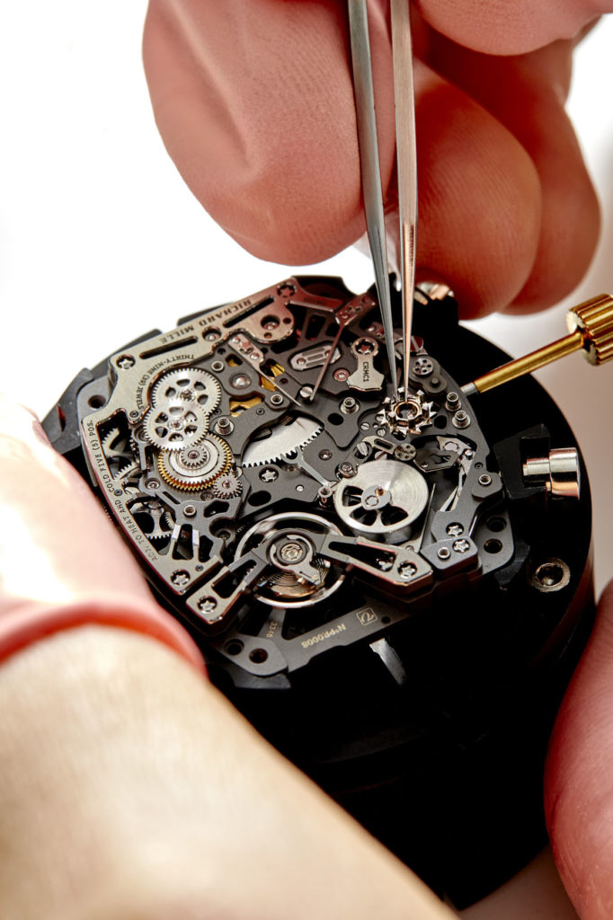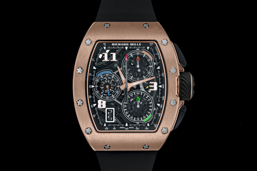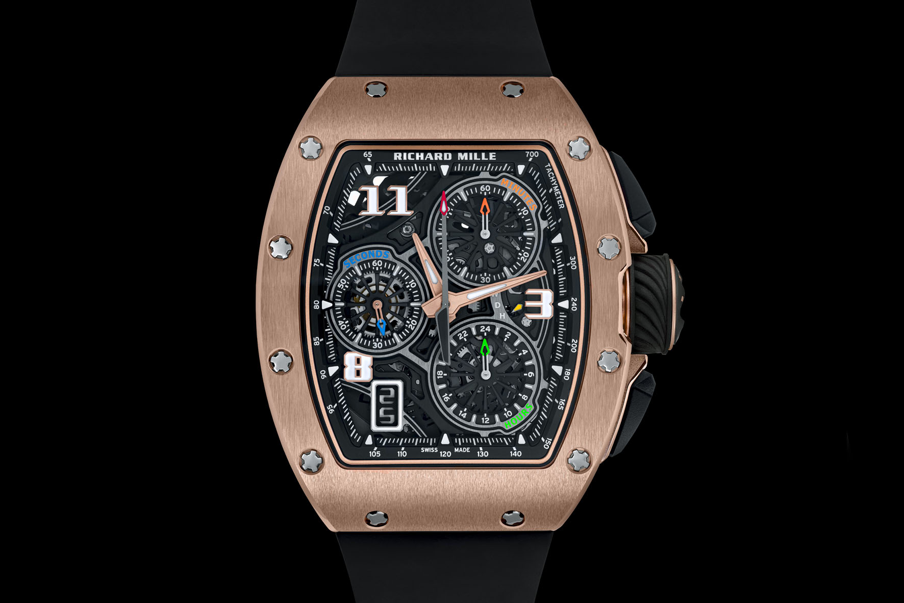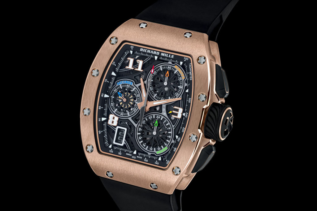 Dotato di contatori delle 24 ore e dei 60 minuti, posizionati rispettivamente alle ore 5 e alle ore 2, dimostra che un cronografo non deve essere limitato solo alla misurazione di tempi brevi. E’ stato interamente ideato, prodotto e assemblato a Les Breuleux, presso i laboratori del marchio. La sua estrema precisione può essere seguita attraverso il fondello trasparente della cassa, un segno distintivo della Richard Mille.