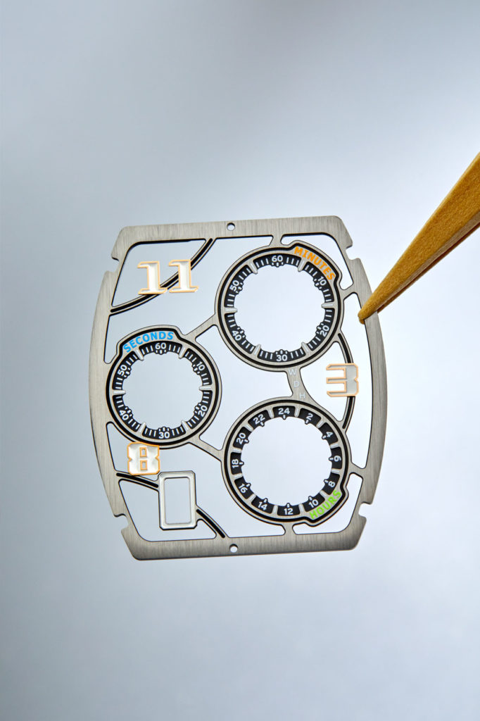 L’RM 72-01 indica il tempo, con tre ritmi diversi, sui quadranti dei tre contatori che catturano immediatamente ogni sguardo; al loro interno infatti le lancette ballano in una loro propria ed essenziale armonia, orchestrata da una ruota a sei colonne, sulle rispettive scale temporali: blu per i secondi, arancione per i minuti, verde per le ore.