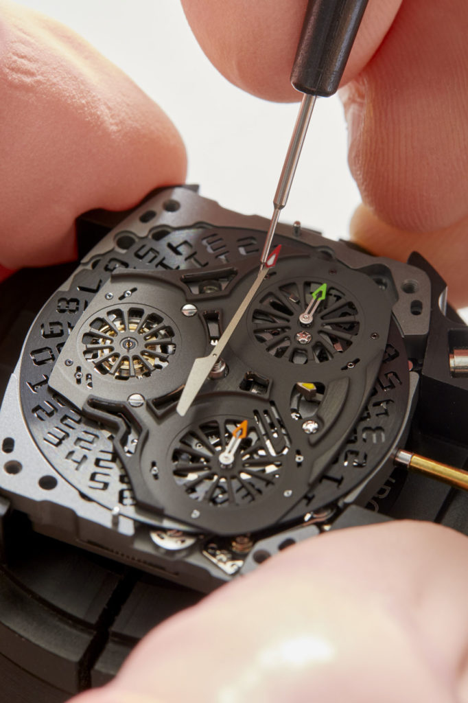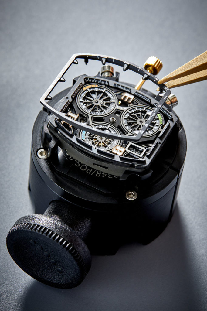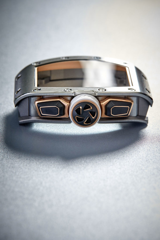 La trasmissione del moto dai minuti alle ore è stata isolata dalla ruota dei secondi in questo cronografo flyback, che incorpora un meccanismo a doppio pignone oscillante sviluppato in Richard Mille. Il marchio ha presentato una domanda di brevetto per questo suo cronografo a doppio innesto. «Il pignone, che può impegnarsi o ritirarsi dai denti dell’ingranaggio, è stato gemellato e adesso ce n’è uno per i minuti e un altro per i secondi. Questo sistema è più sottile di un meccanismo verticale, che sarebbe difficile da inserire nel cuore del movimento», ha spiegato Salvador Arbona, direttore tecnico dei movimenti in Richard Mille. Di conseguenza, la funzione cronografica ha un impatto minimo sulla riserva di carica, quando questa viene attivata. Il calibro CRMC1 rimane quindi piuttosto sottile, con uno spessore di soli 6,05 mm, nonostante sia composto da 425 parti diverse.