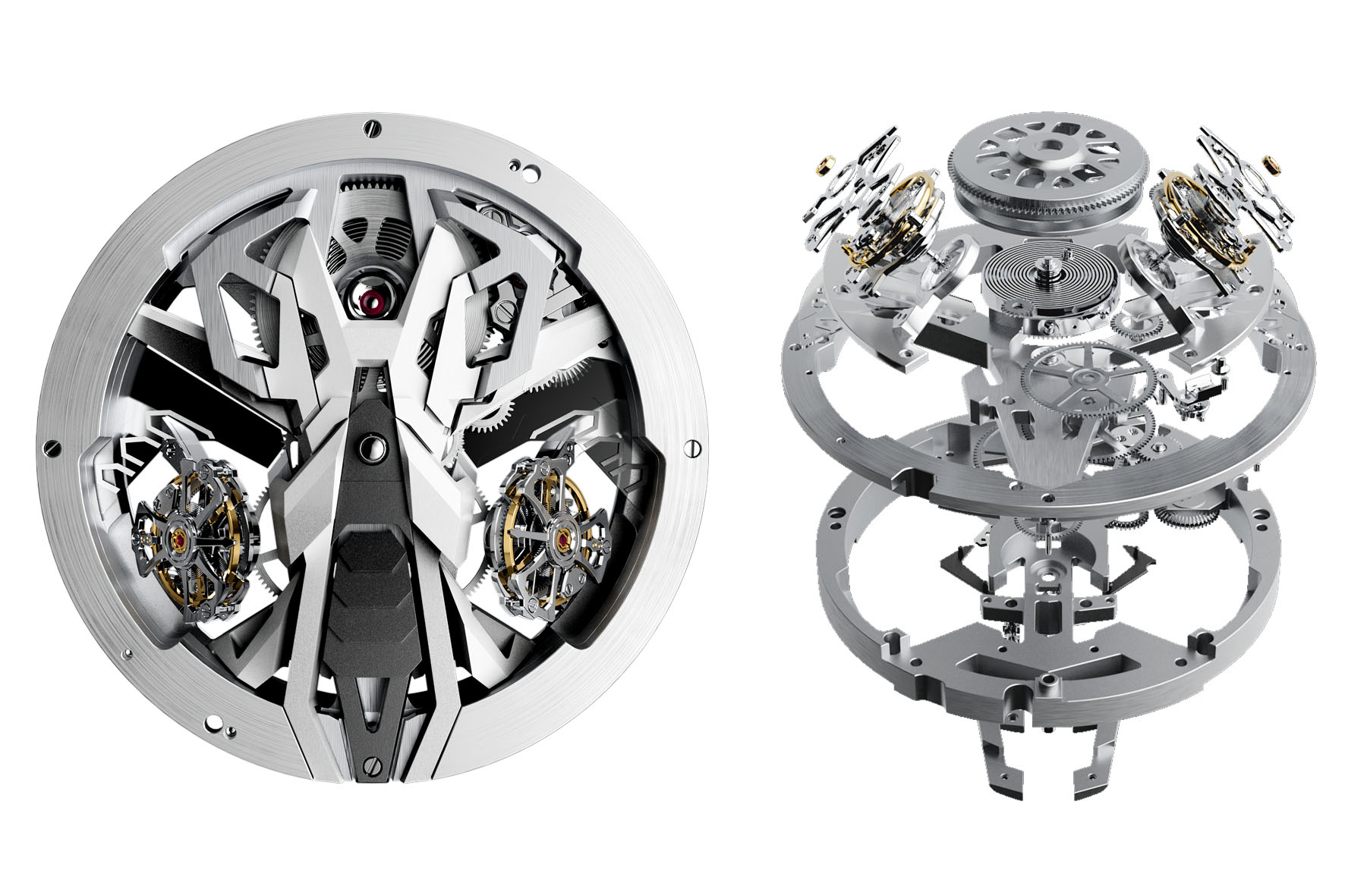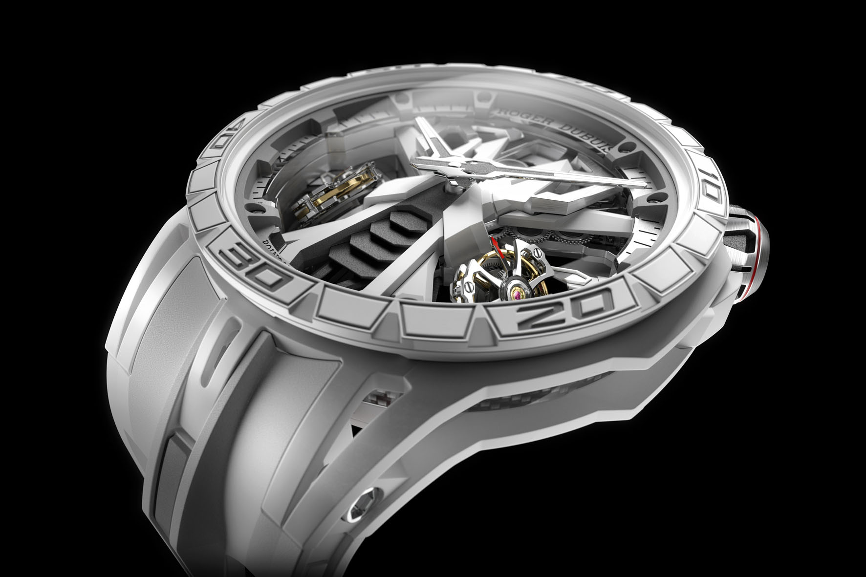 Battezzato “RD112” in omaggio al numero limitato di supercar prodotte, l’Excalibur Spider Countach DT/X è mosso da un calibro costruito per avere la stessa efficienza di prestazioni del motore della supercar. Un movimento senza uguali nel mondo dell’Iper Orologeria: i due tourbillon sono inclinati esattamente a 90° l’uno rispetto all’altro così da compensare gli effetti della gravità terrestre non solo orizzontalmente, ma anche verticalmente –un risultato ingegneristico complesso che è stato a lungo perseguito al fine di offrire una precisione assoluta.