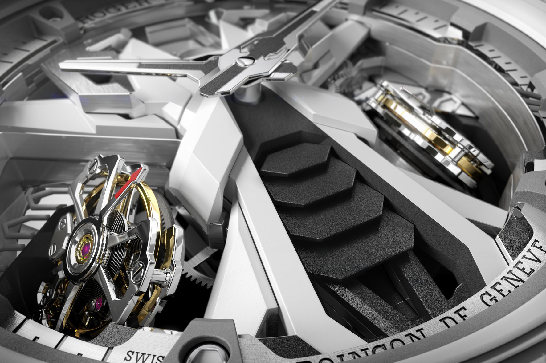 Essi fanno affidamento anche su di un ruotismo che si comporta come una bilancia appianando qualsiasi differenza di movimento fra i due oscillatori, esattamente come fa il differenziale di un’automobile con il diverso comportamento delle ruote sulla strada. In questo modo la trasformazione dell’energia in misurazione del tempo avviene in modo estremamente efficace. Inoltre, il fatto che le gabbie del tourbillon siano state realizzate in un materiale ultraleggero come il titanio significa che è necessaria meno energia per farle girare, rendendo possibile garantire una riserva di carica di 72 ore. Questa costruzione così complessa è garantita dal Poinçon de Gnève, che ne certifica l’eccellenza delle finiture, meticolosamente realizzate a mano da abili orologiai della Manifattura Roger Dubuis.