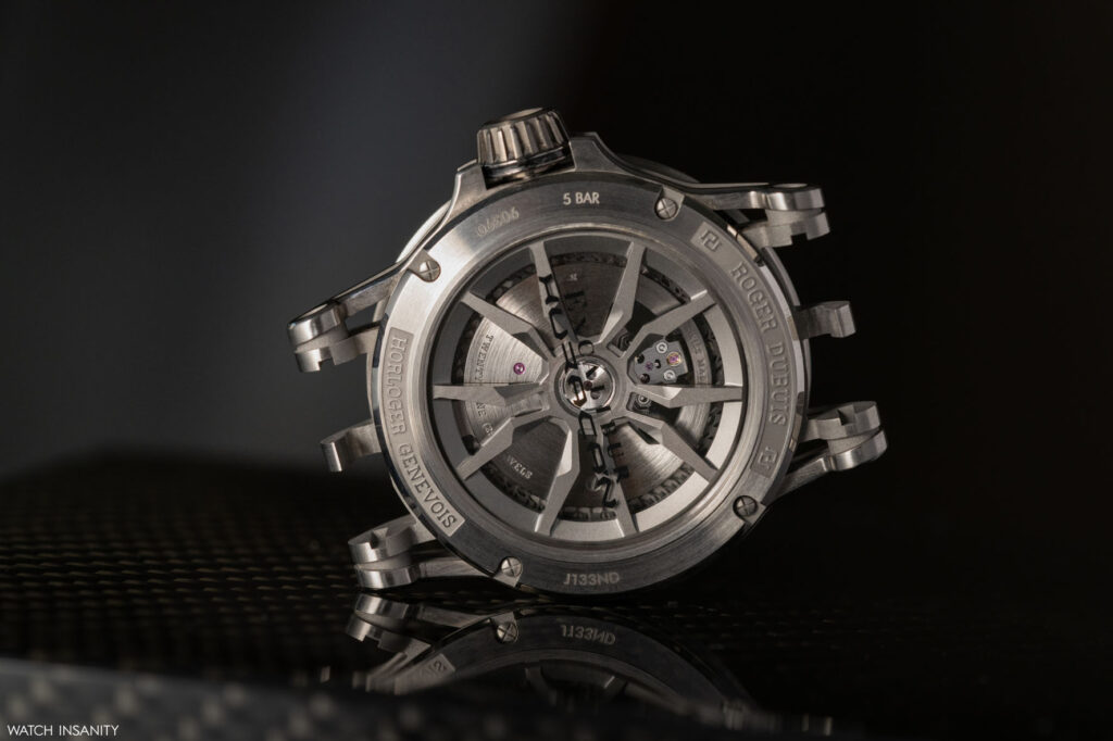 L’estetica forte di questo orologio passa anche attraverso le anse. La lavorazione di ciascuna di esse è una sorta di opera d’arte e merita una menzione speciale. Presentano la classica forma tripartita tipica delle anse Roger Dubuis con i due elementi laterali scheletrati, che servono per l’aggancio del cinturino intercambiabile. Oltre alla funzionalità, l’elemento centrale “accompagna” il cinturino in modo più morbido intorno al polso favorendone la vestibilità, che in estate è fondamentale.