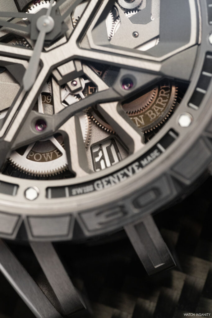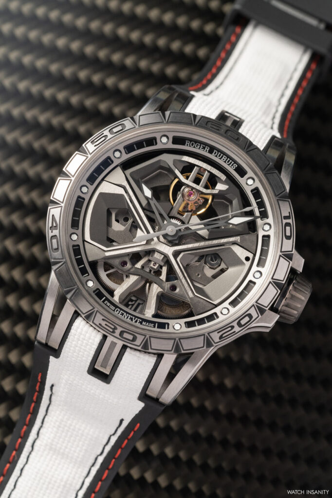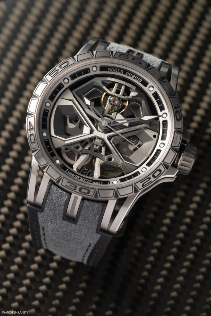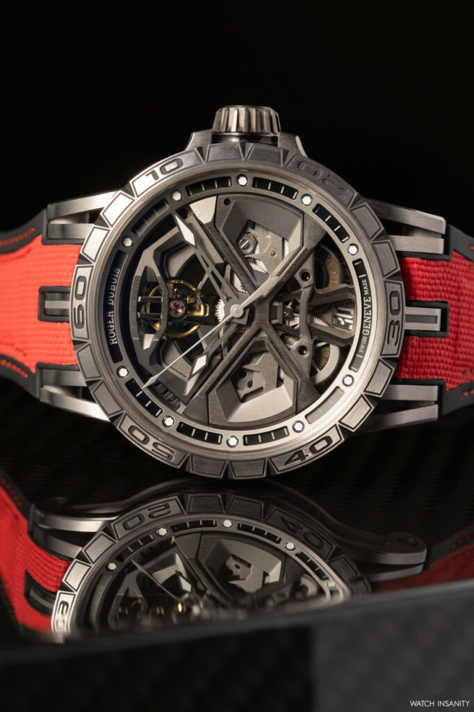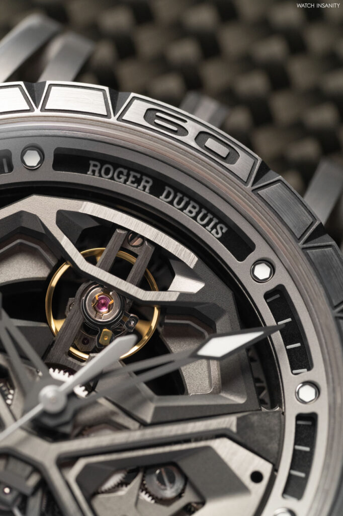 I nuovi cinturini si possono utilizzare, naturalmente, anche sulla protagonista di queste pagine, la referenza DBEX0748, con cassa in titanio e carrure rivestita di caucciù nero. Accanto a essa, Roger Dubuis ne ha create altre due, una in titanio DLC e un’altra molto elegante in oro rosa e titanio. Il diametro di 45 mm e lo spessore di 13,3 mm lo rendono ben presente al polso, grazie anche alla lunetta, anch’essa in titanio, caratterizzata da profonde zigrinature; ciascuna di esse crea elementi trapezoidali con finitura satinata, sulla quale spiccano gli indici laccati. Un design ardito che si estende alla corona sovradimensionata con il logo della manifattura, protetta da due robuste spallette.