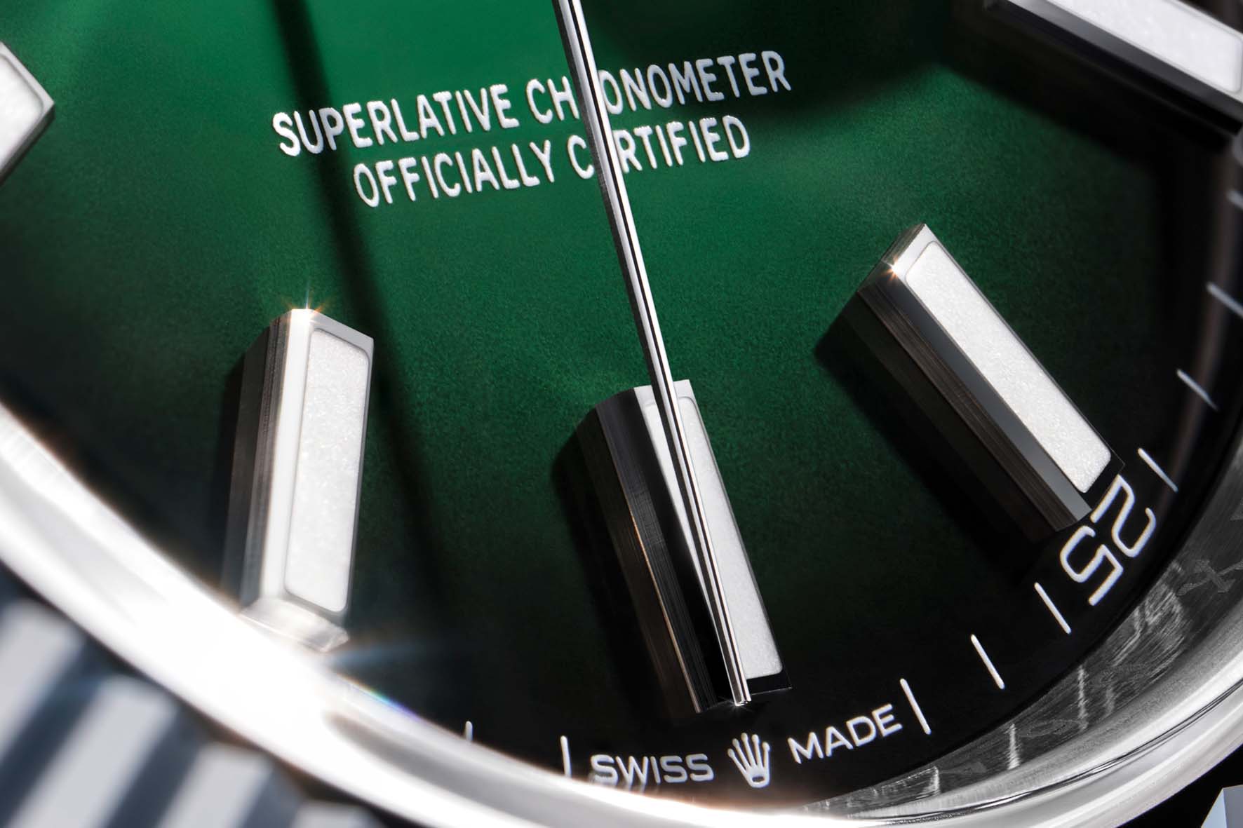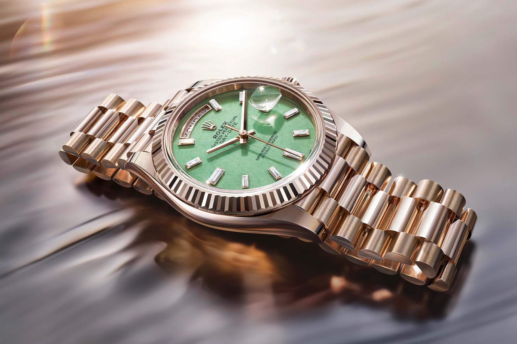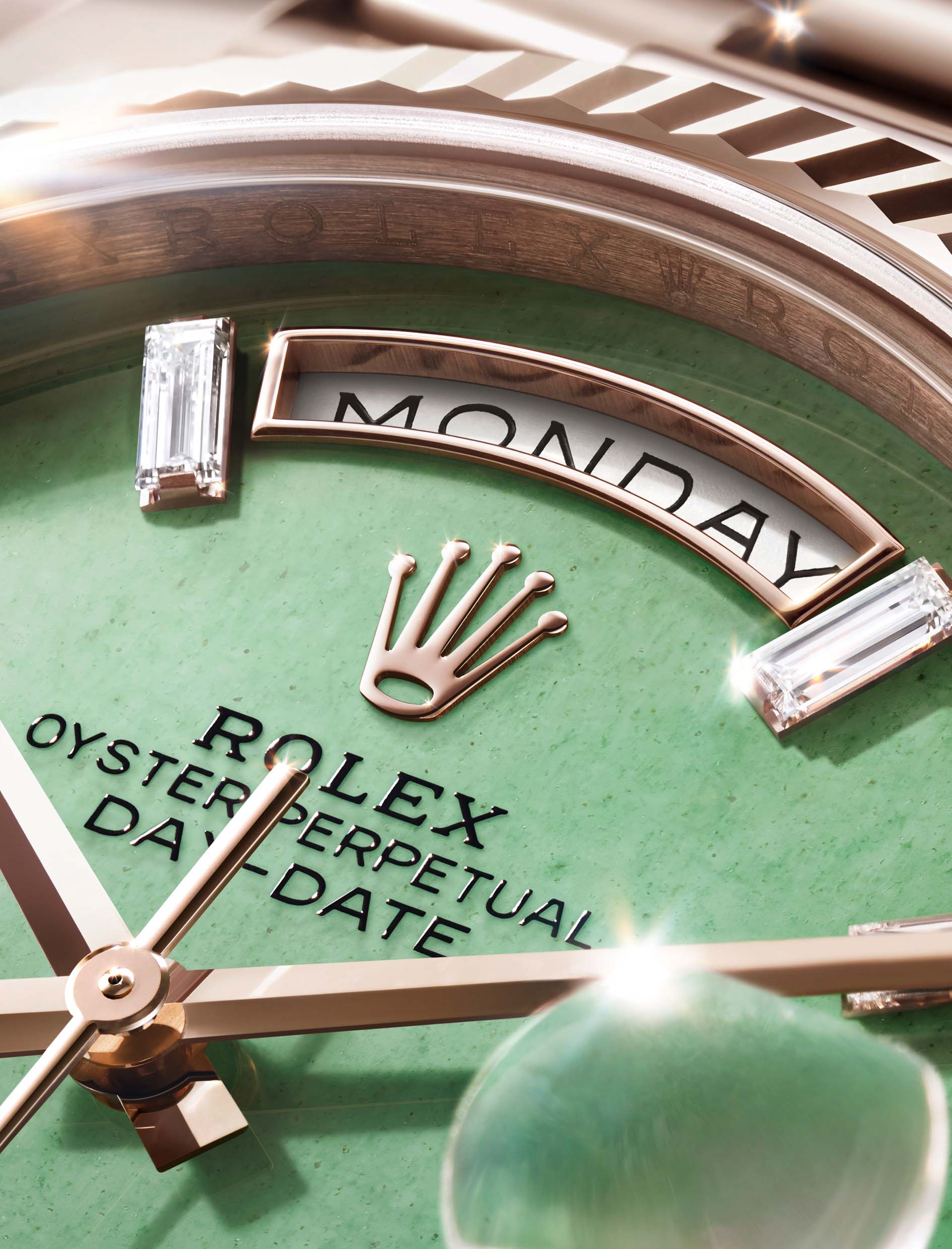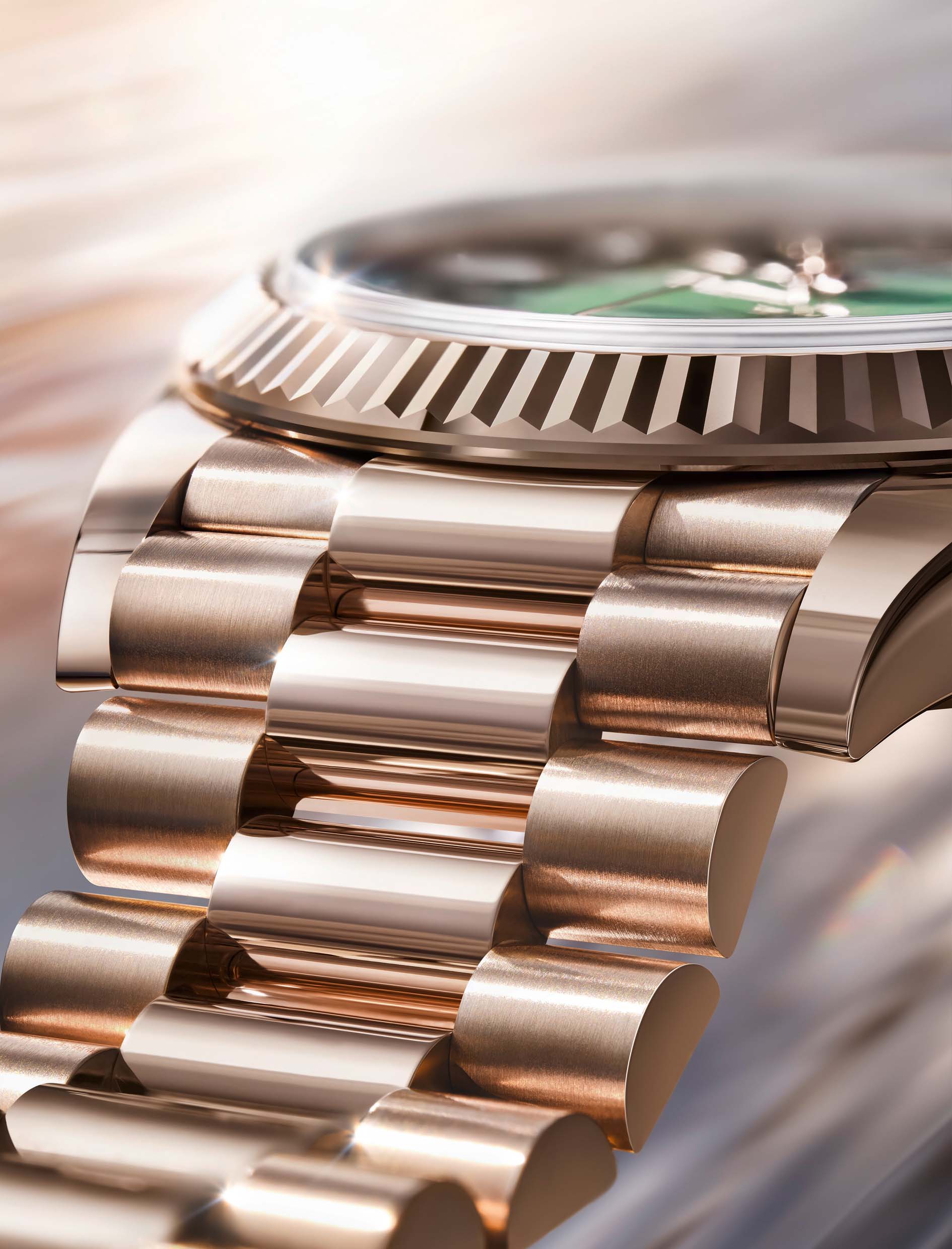 Fin dalle origini, il Day-Date è realizzato esclusivamente in metalli preziosi, una scelta che ne definisce il posizionamento all’interno della collezione Rolex. La versione presentata a Watches and Wonders 2026 prosegue su questa linea introducendo l’Oyster Perpetual Day-Date 40 in oro Jubilee Gold 18 ct, una lega inedita, interamente sviluppata e realizzata in-house, concepita per esprimere una tonalità intermedia tra oro giallo, bianco e rosa. Il quadrante in avventurina verde introduce una dimensione materica particolarmente raffinata. La superficie, attraversata da riflessi puntiformi, crea un effetto luminoso sottile ma continuo, che si integra con la tonalità della cassa e del bracciale, mantenendo una lettura sempre controllata. La cassa Oyster da 40 mm, con carrure monoblocco, fondello a vite e corona Twinlock a doppia impermeabilizzazione, garantisce impermeabilità fino a 100 metri, mentre il bracciale President, con maglie a tre file semicircolari, assicura continuità formale, comfort e stabilità al polso.