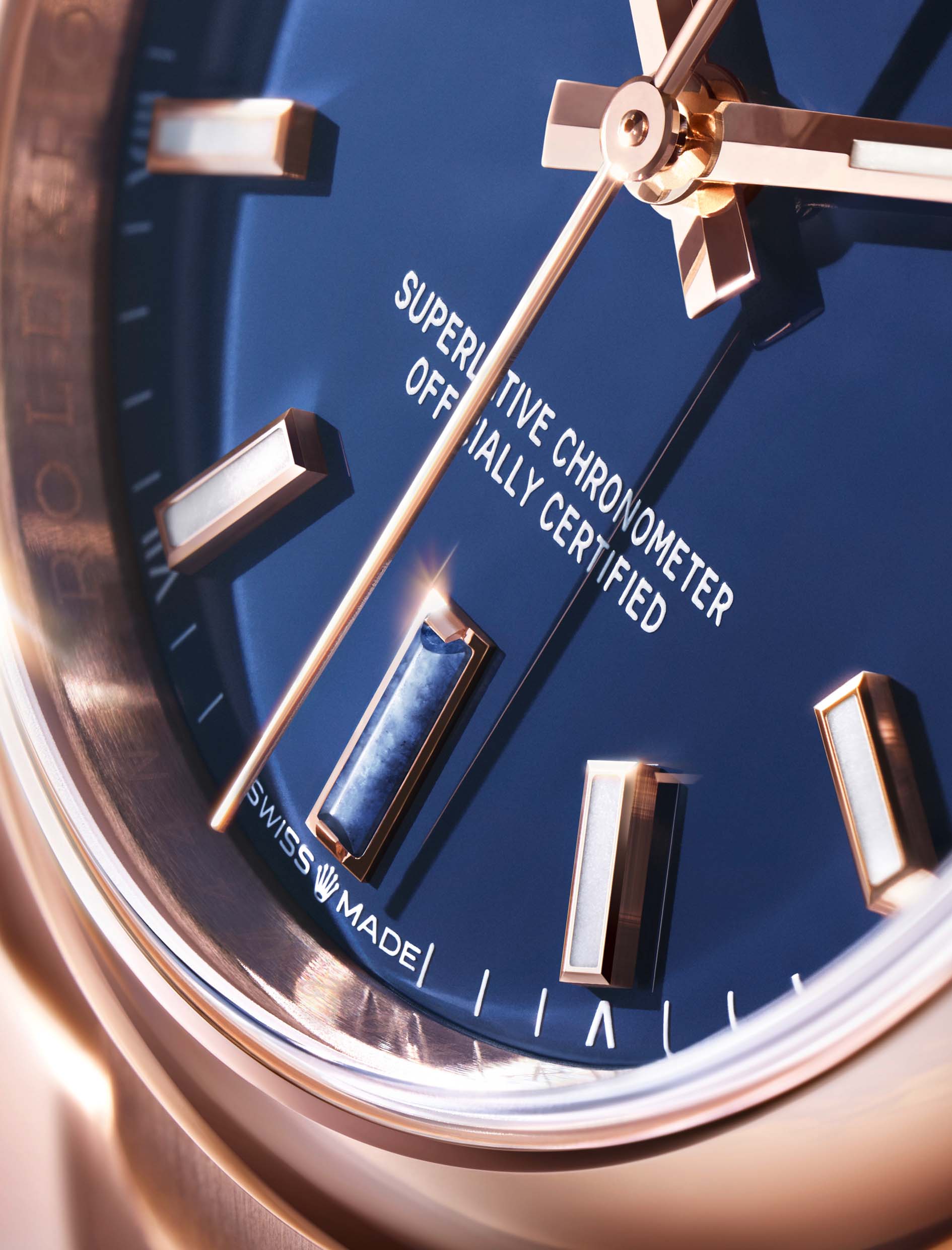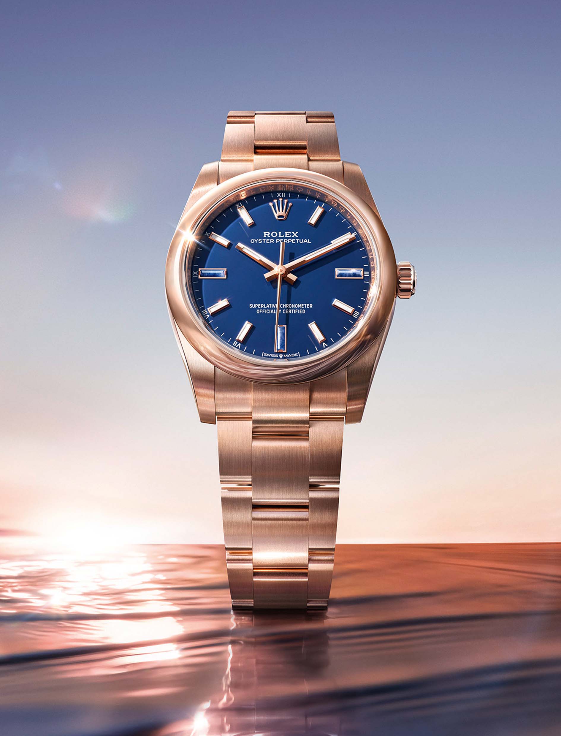 L’Oyster Perpetual 34 interpreta la stessa idea attraverso una diversa tonalità del metallo prezioso. La cassa e il bracciale sono qui realizzati in oro Everose 18 ct, la lega brevettata da Rolex, abbinata a un quadrante laccato blue stone, anch’esso inedito. Come nel modello da 28 mm, gli indici a ore 3, 6 e 9 sono in pietra naturale, in questo caso dumortierite, minerale blu dalle sfumature più chiare o più profonde che introduce una variazione cromatica sottile e sofisticata.