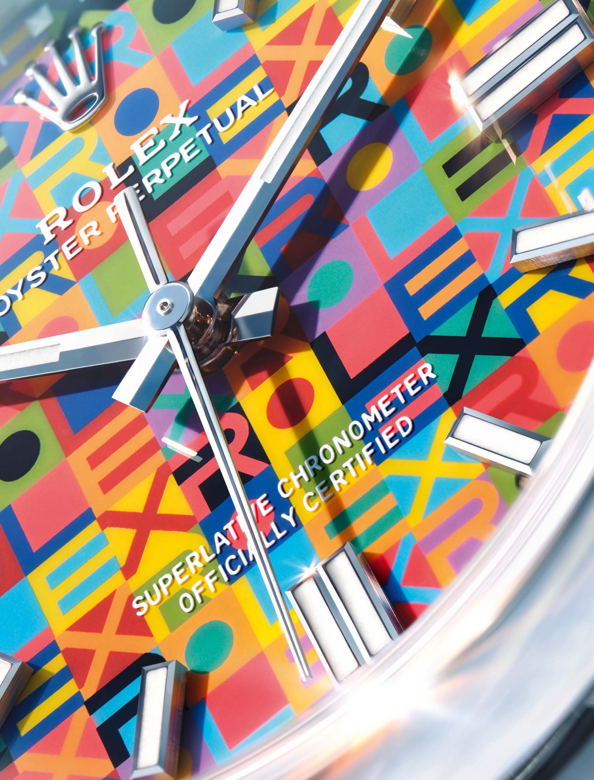 Con l’Oyster Perpetual 36, Rolex lavora sulla superficie del quadrante e sulla profondità del proprio patrimonio estetico. Realizzato in acciaio Oystersteel, il modello accoglie un quadrante laccato multicolore con motivo Jubilee, qui interamente rivisitato in una composizione più grafica, luminosa e contemporanea. Le lettere del nome “Rolex” si distribuiscono sulla superficie in un gioco di contrasti che coinvolge dieci tonalità differenti, restituendo un insieme di forte personalità ma perfettamente controllato. La realizzazione di questo quadrante richiede una procedura particolarmente complessa: i colori non vengono infatti applicati simultaneamente, ma uno dopo l’altro, mediante tampografia, con un livello di precisione estrema necessario a garantire l’esatto posizionamento di ogni forma e di ogni lettera.