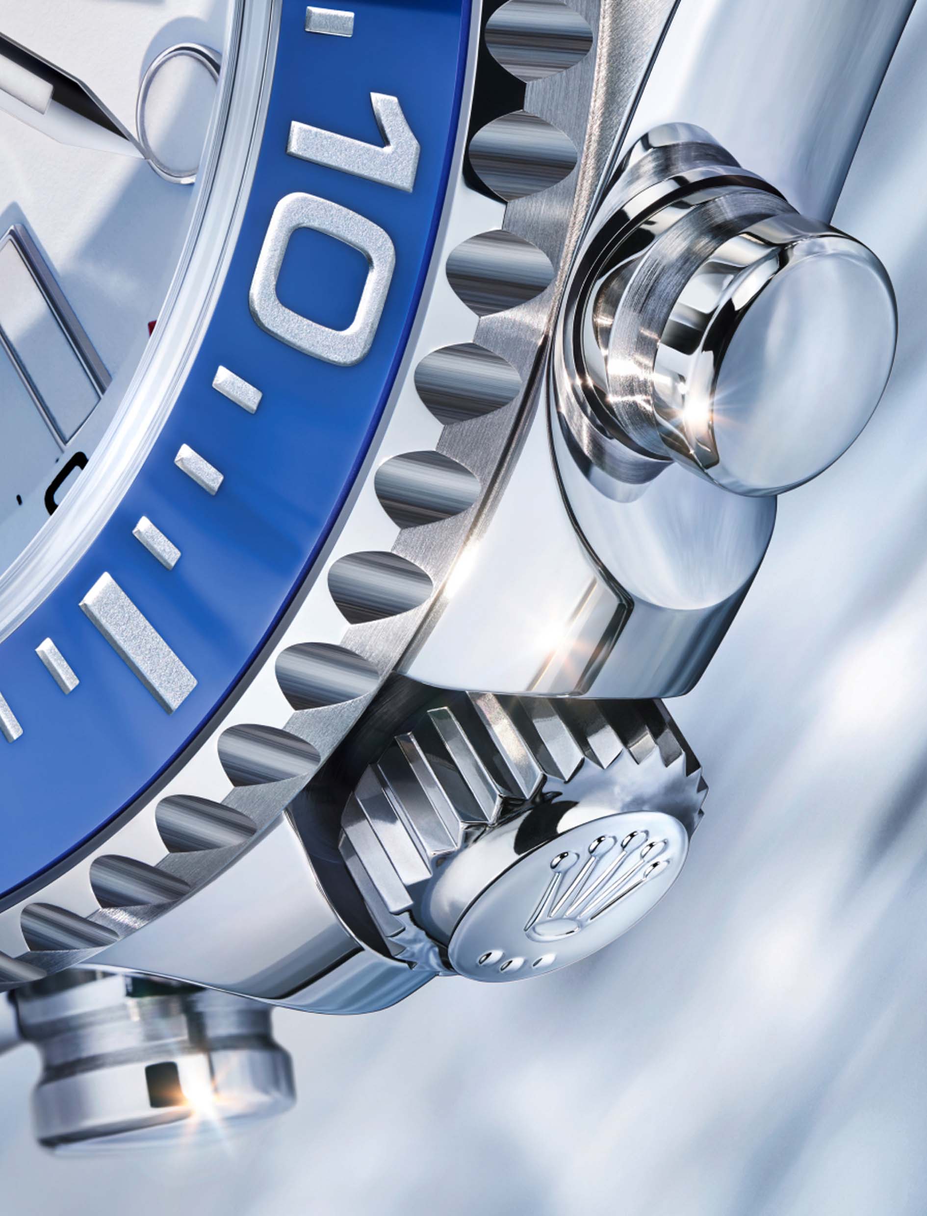 Il quadrante si presenta con una configurazione più pulita, caratterizzata da indici larghi tipici degli orologi Professionali Rolex, mentre la minuteria del conto alla rovescia è trasferita sul rehaut, contribuendo a una migliore organizzazione visiva delle informazioni. Il contrasto tra il bianco opaco del quadrante e il blu intenso del disco della lunetta Cerachrom rafforza l’impronta nautica del modello, mentre il design dei pulsanti, ispirato ai verricelli delle imbarcazioni, sottolinea il legame diretto con l’ambiente marino.