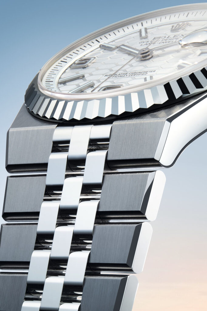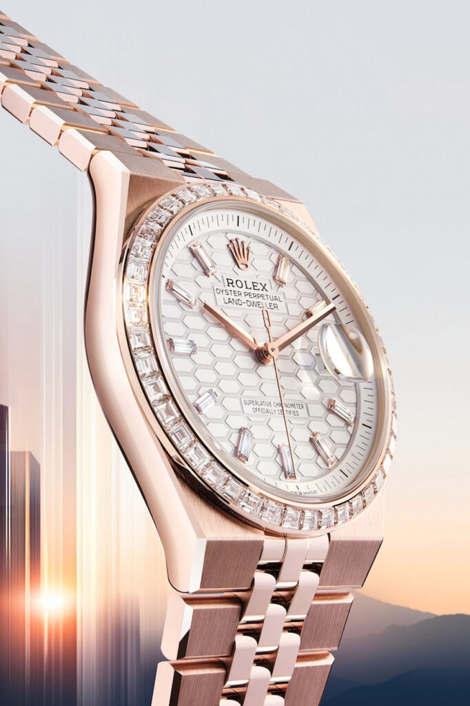 Accompagnato da un bracciale metallico inedito, chiamato Flat Jubilee, il Land-Dweller, esibisce una cassa Oyster dall’architettura rivisitata, sovrastata da una lunetta zigrinata o da una lunetta con diamanti con un quadrante che spicca per il suo motivo a nido d’ape.