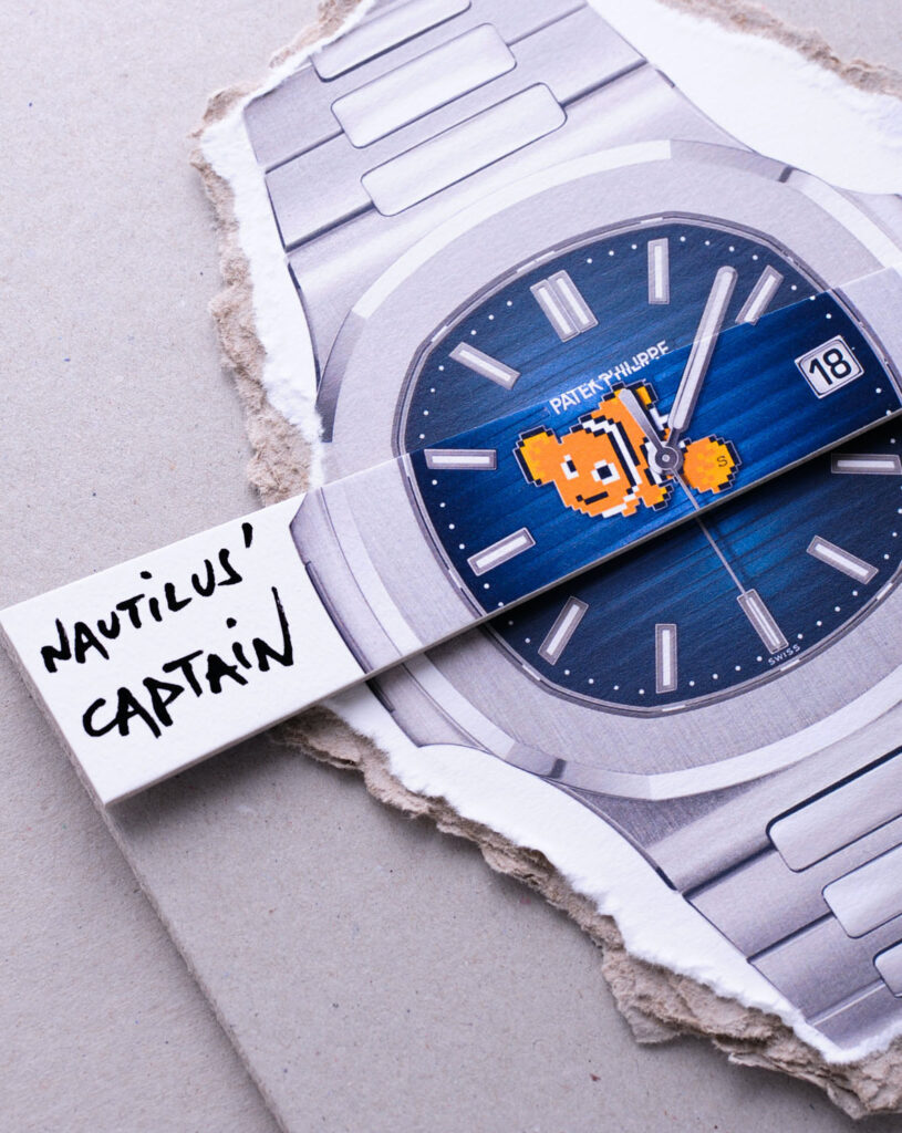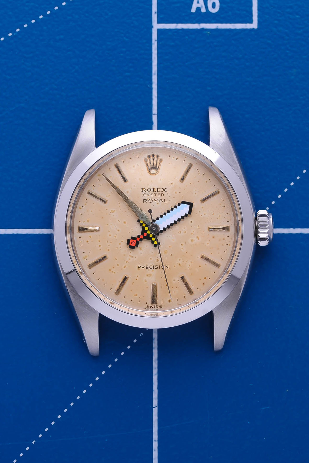 La sua “ironica” sperimentazione approda inizialmente nel mondo vintage con un’operazione atipica: la sostituzione della sfera dei secondi con elementi personalizzati. È il caso di un cursore mouse pixellato applicato in un Patek Philippe ref. 2509, il millennium falcon (da Star Wars) in uno Zenith “Excelsior Park”, la spada di Link (da The Legend of Zelda) in un Rolex Oyster Royal o una clessidra su un Omega ref. 2390.