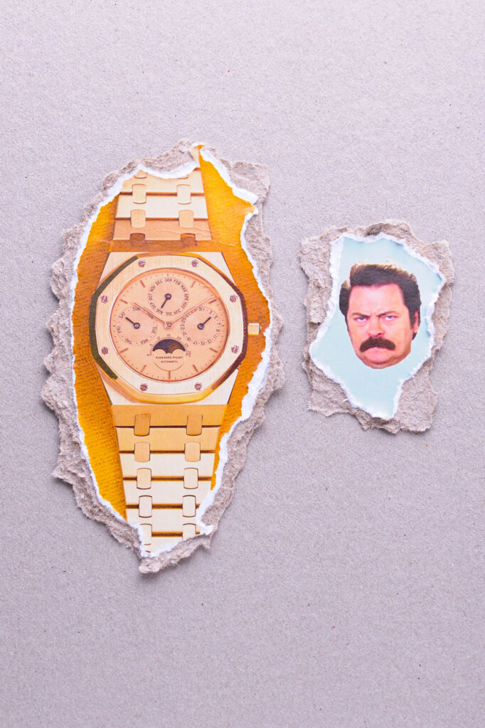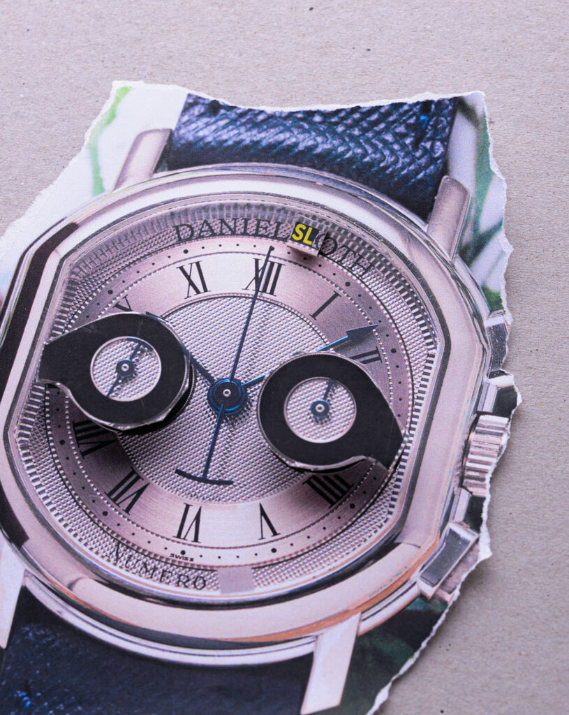La mia “firma” non è stata calcolata a priori. Purtroppo non avevo molta scelta. Non ero bravo (e tutt’ora non lo sono) con tutti i nuovi strumenti e software di disegno e progettazione, per cui non potevo competere con le tendenze dell’epoca (3D, animazioni e video di tendenza, iper-realismo). Quindi ho optato per la carta, il cartone, i giochi di parole, gli strumenti di base della cancelleria e gli accessori della vita quotidiana. E ho “giocato” con quelli. Chiamatelo stile minimal, paleo o normcore… ma era il modo più economico e veloce per farlo. In questo maniera sono riuscito a differenziarmi nel mondo degli orologi e ho trovato il mio “universo”. I vincoli e le limitazioni sono stati il mio vero vantaggio. Per quanto riguarda i riferimenti, non pretendo di avere una conoscenza approfondita. “Gioco” principalmente con la cultura mainstream (di massa) che a volte tendo ad elevare con alcune nozioni classiciste per fingere di essere intelligente ed istruito.