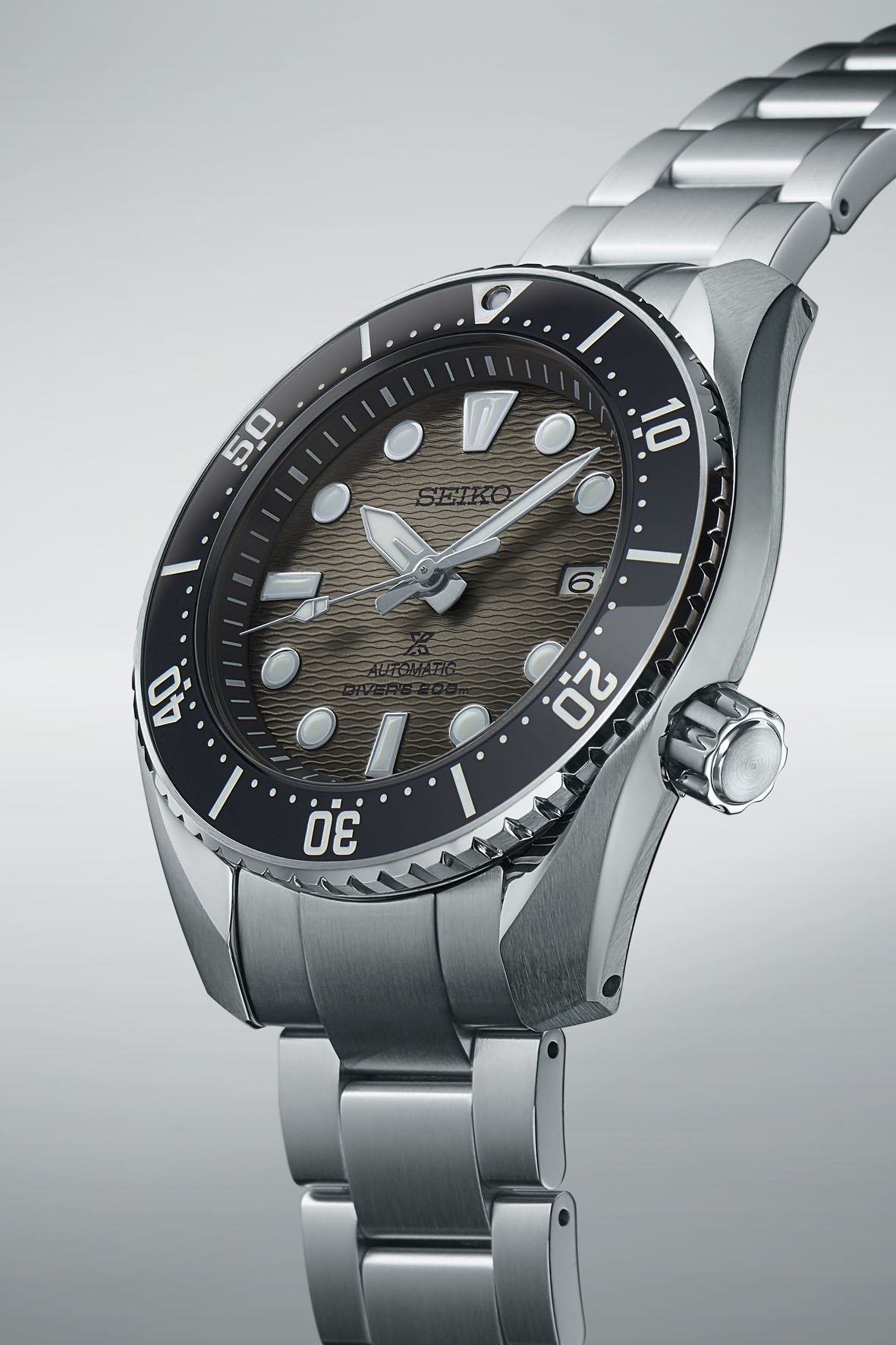 La cassa in acciaio ha un diametro contenuto di 40 mm e uno spessore di 13, per garantire l’affidabilità, la sicurezza e la facilità d’uso richieste a un orologio subacqueo Seiko. La lunetta è in acciaio con inserto in alluminio, con indici e numeri arabi incisi al laser per evitare l’usura dovuta a lunghi periodi di utilizzo. Grazie a un nuovo bracciale con maglie più corte e con una fibbia di dimensioni più contenute, l’orologio si adatta facilmente a polsi di diverse dimensioni.