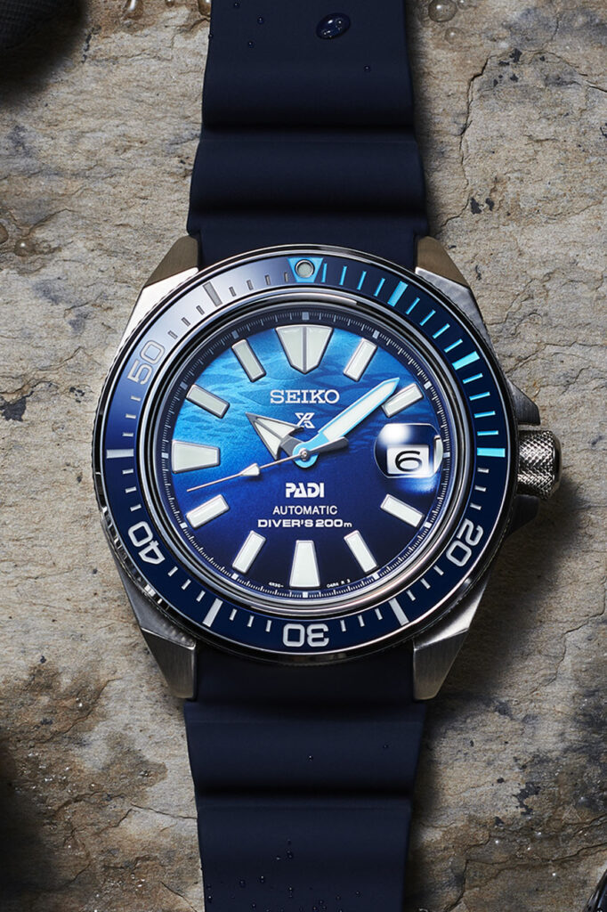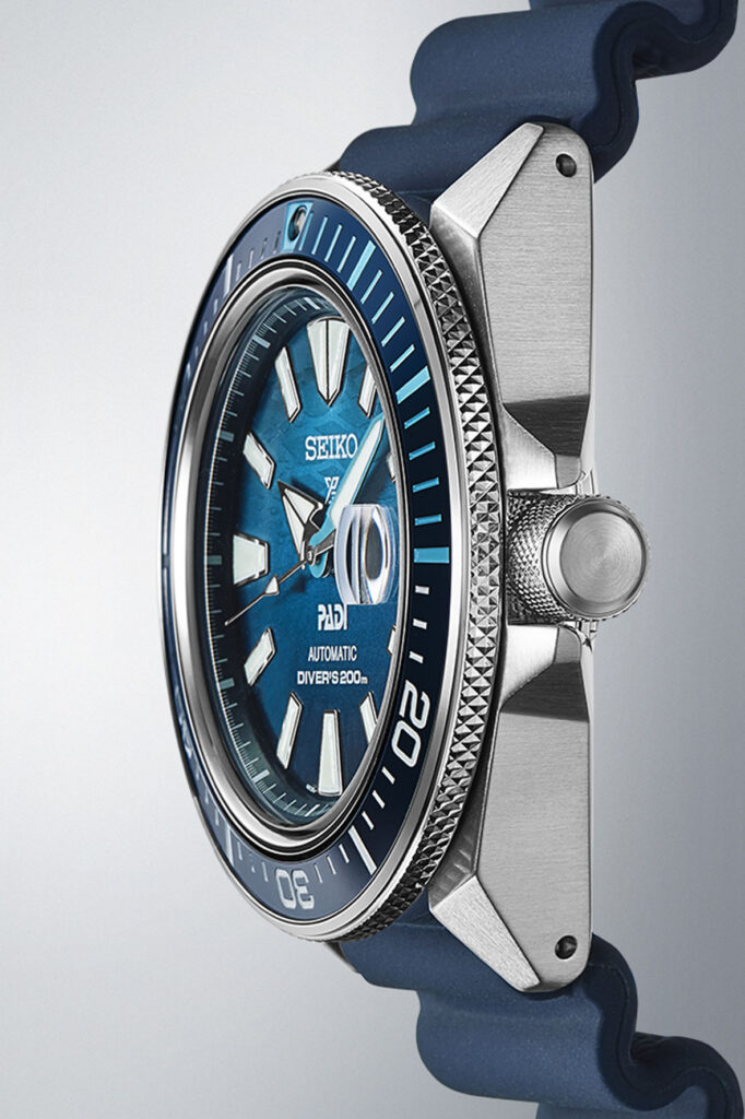 Il diver professionale SRPJ93K1 PADI Special Edition “The Great Blue” è dotato del calibro 4R35, che offre una riserva di carica di 41 ore. Se la sua struttura è essenziale – cassa King Samurai in acciaio inossidabile con lunetta girevole unidirezionale e cinturino in silicone -, ciò che risalta è invece la collaborazione che lo caratterizza. È quella con PADI – ossia la “Professional Association Of Diving Instructors”, di cui parleremo più avanti – ben visibile dal logo dell’associazione a ore 6 e dalla scritta all’esterno del cinturino. Il motivo del quadrante riflette la superficie dell’Oceano vista da sotto l’acqua, con la luce del sole che scende e la superficie dell’acqua in movimento.