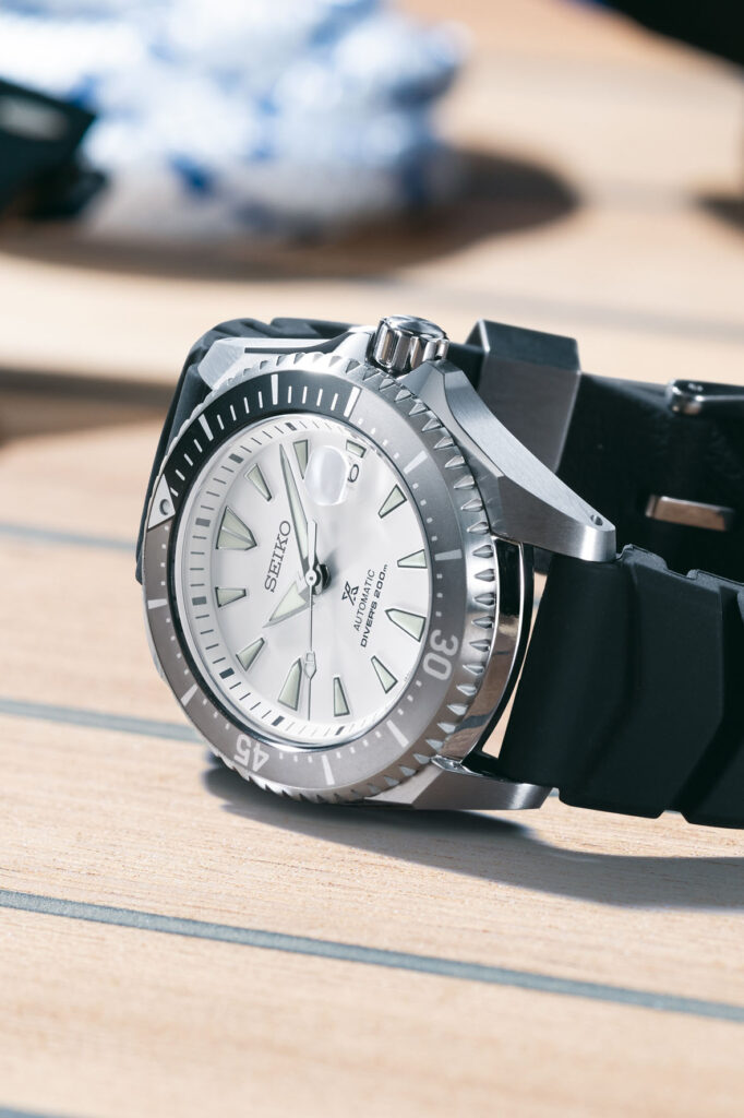 Il Seiko Shogun SPB191J1 ha una cassa importante da 43,5 mm in titanio con trattamento super-hard-coating e la lunetta girevole in titanio. Il vetro è zaffiro con trattamento antiriflesso e il cinturino è in silicone nero. Bello il bianco del quadrante, che spicca a contrasto con il colore della lunetta e del cinturino. È mosso anch’esso da calibro automatico 6R35 da 70 ore di riserva di carica. È interessante ricordare che lo Shogun fu lanciato nel 2008 inizialmente solo per il mercato giapponese e la sua distribuzione fu estesa successivamente al resto del mondo.