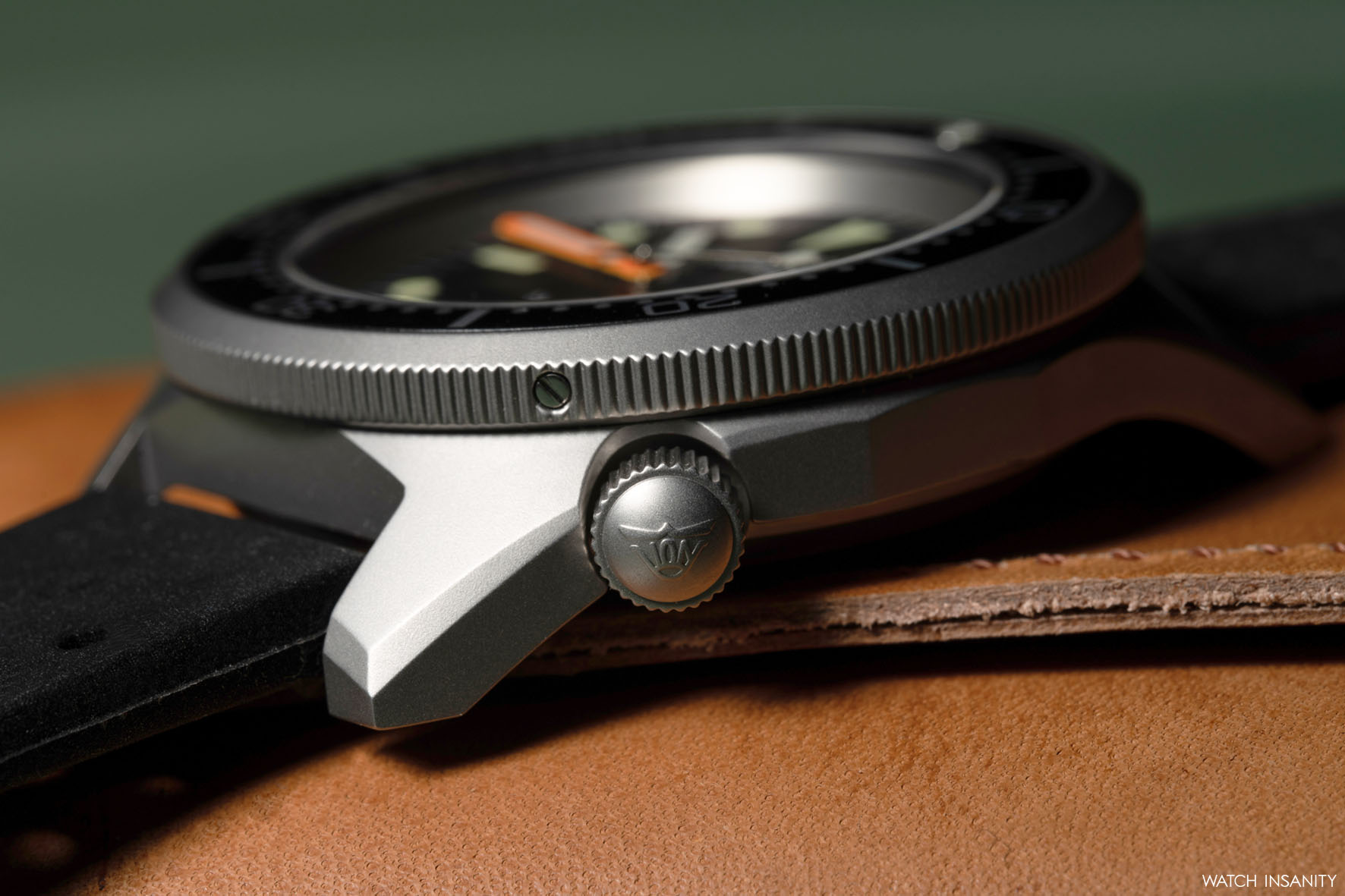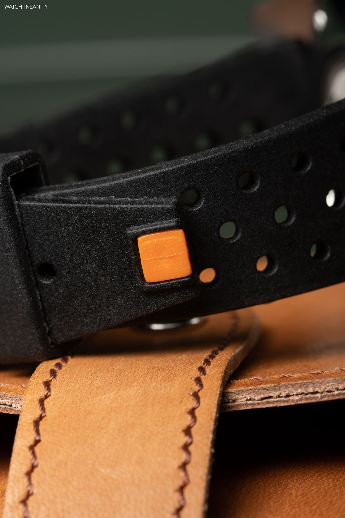 Inoltre la confezione della nostra Limited Edition contempla una raffinata custodia in pelle e l’abbinamento di due cinturini. Anche in questo caso abbiamo privilegiato l’aspetto tecnico del diver professionale, scegliendo un bracciale in acciaio con chiusura di sicurezza e maglia Milano – la città dove ha la sede Watch Insanity – e un cinturino in caucciù traforato, dove troviamo l’ultimo dettaglio in arancione.