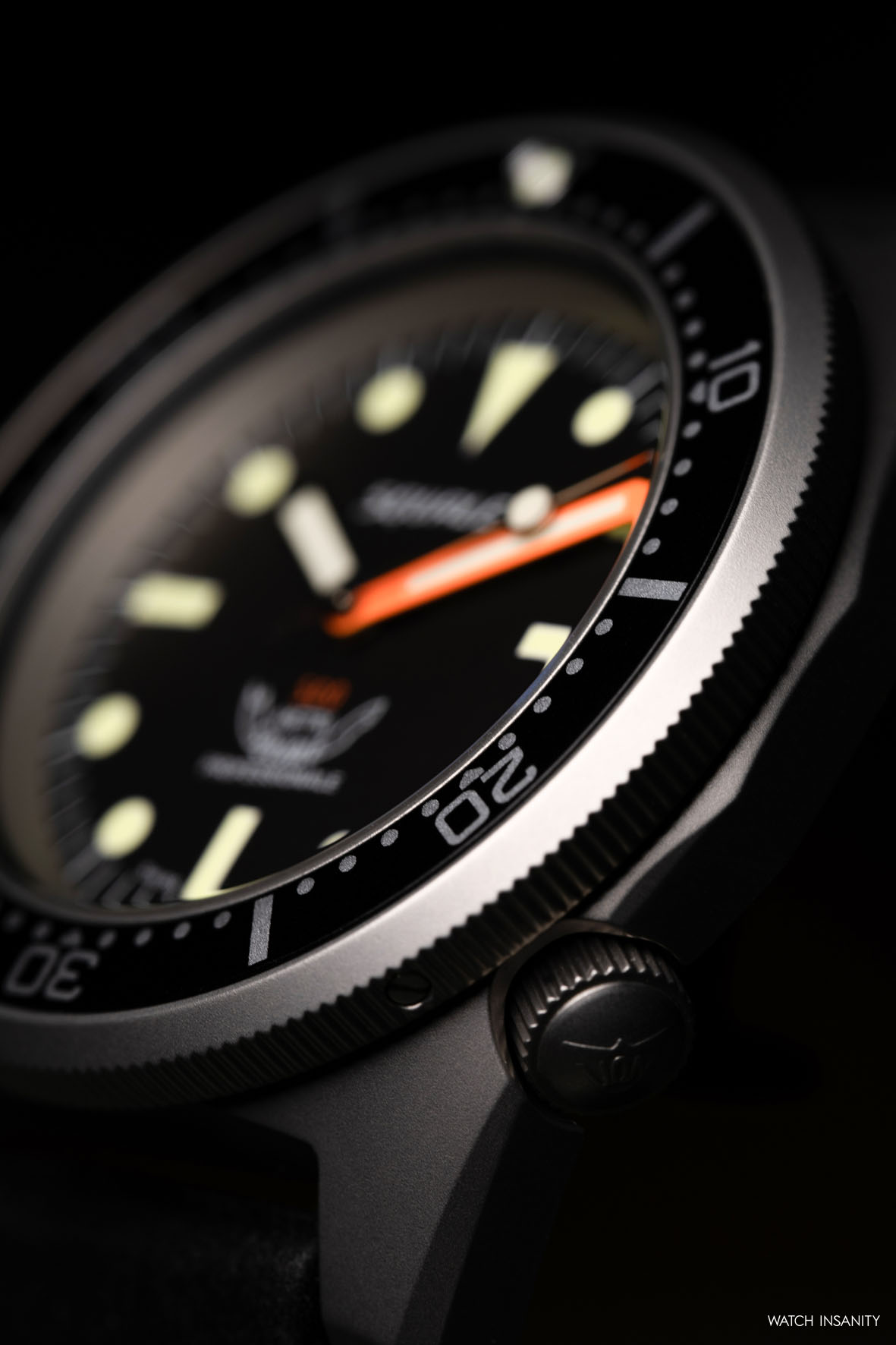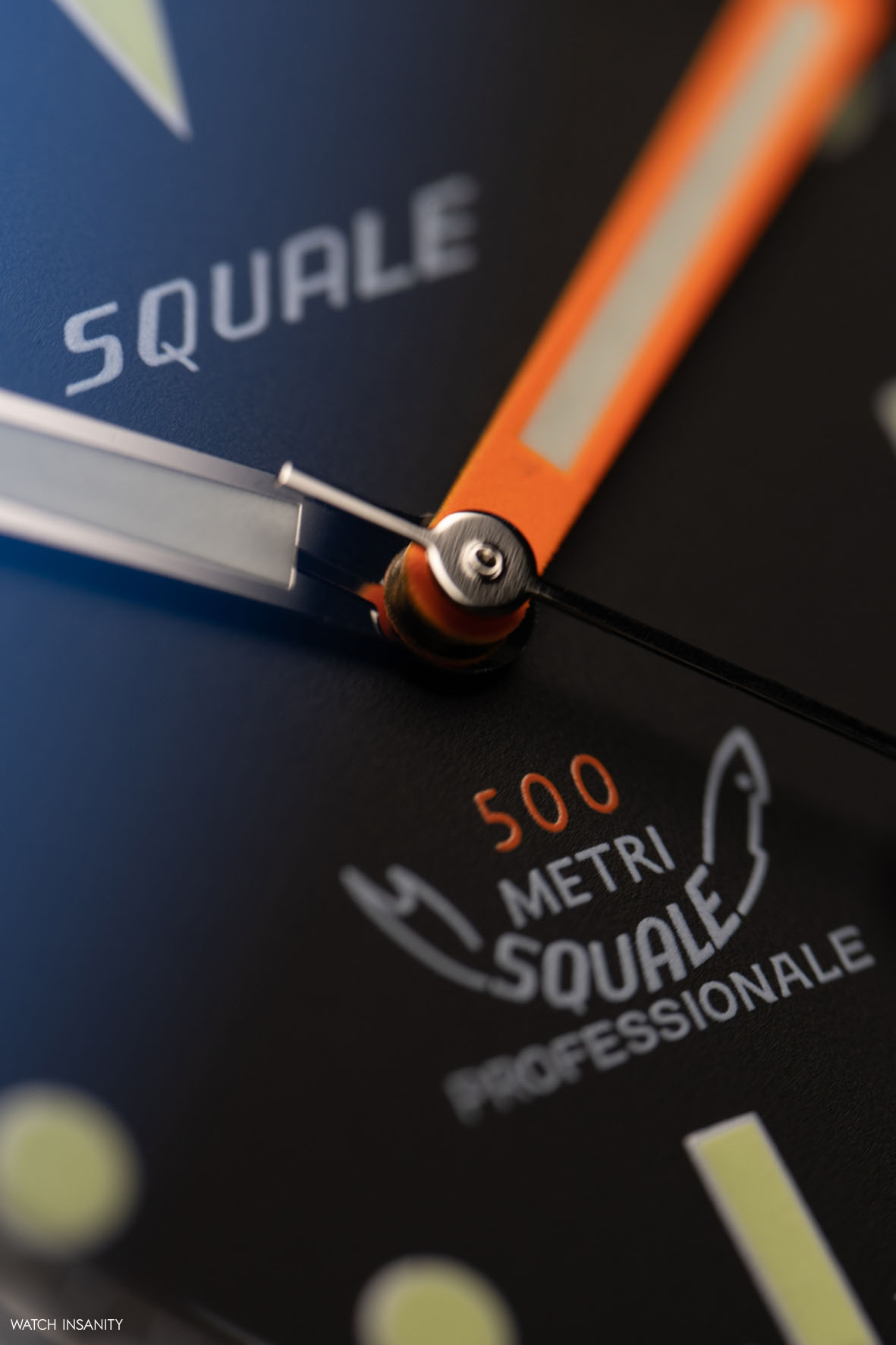 Il vetro zaffiro con trattamento antiriflesso sul lato interno dà risalto al quadrante di un suggestivo nero opaco. Per mantenerlo “pulitissimo” e ultra tecnico abbiamo deciso di eliminare il consueto datario a ore 3 e l’altrettanto consueto “Von” – dalla preposizione del cognome del fondatore – che normalmente fa capolino sopra la scritta Squale a ore 12. La scelta degli indici è caduta sui leggendari pallettoni trattati con SuperLuminova, con un piccolo colpo di scena per la lancetta dei secondi, che rispetto a quella rettangolare in SuperLuminova della serie continuativa ha nel nostro caso la luminescenza tonda in armoniosa continuità con il disegno dei pallettoni.