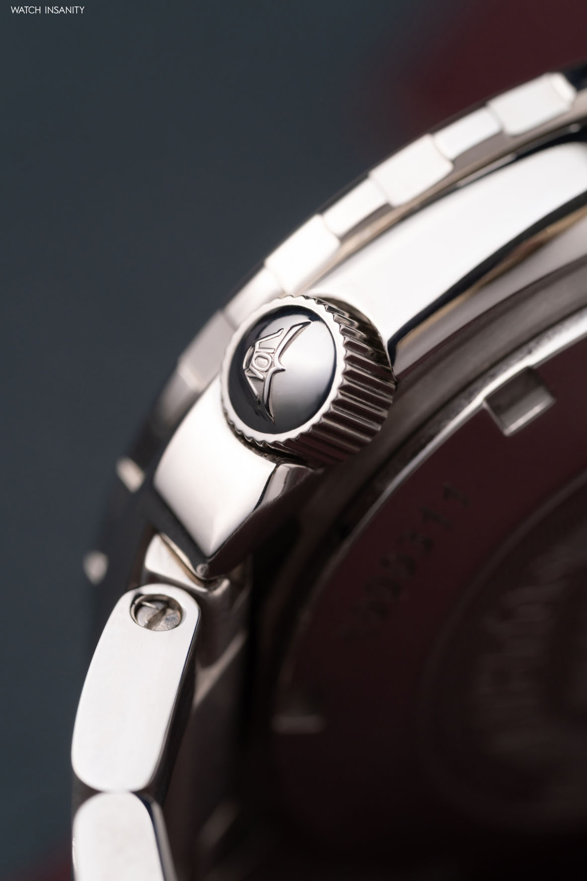 I segnatempo rileggono la referenza “2001”, collezione prodotta tra gli anni sessanta e settanta, con una cassa asimmetrica “a botte” lucida dal diametro di 40mm, 43.6mm in lug to lug e uno spessore di 13mm. Le anse nascoste con passo da 19mm, la corona a vite ad ore 4 e l’inserto ghiera in vetro zaffiro (dotato, come l’originale, dell’innovativo sistema “push to release”) completano l’orologio e lo rendono resiliente in tutte le attività subacquee.