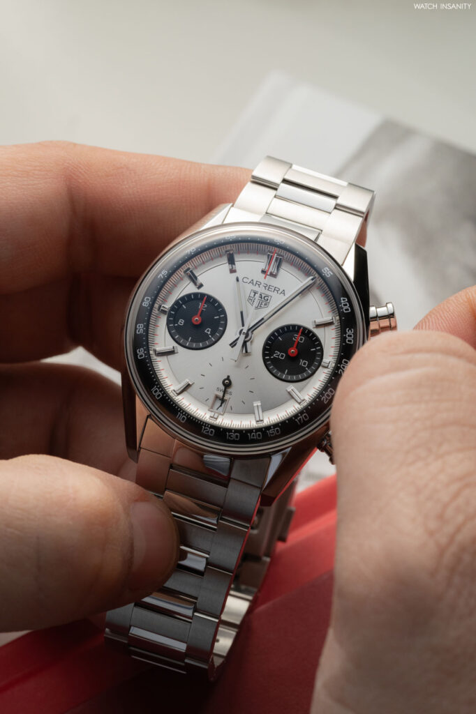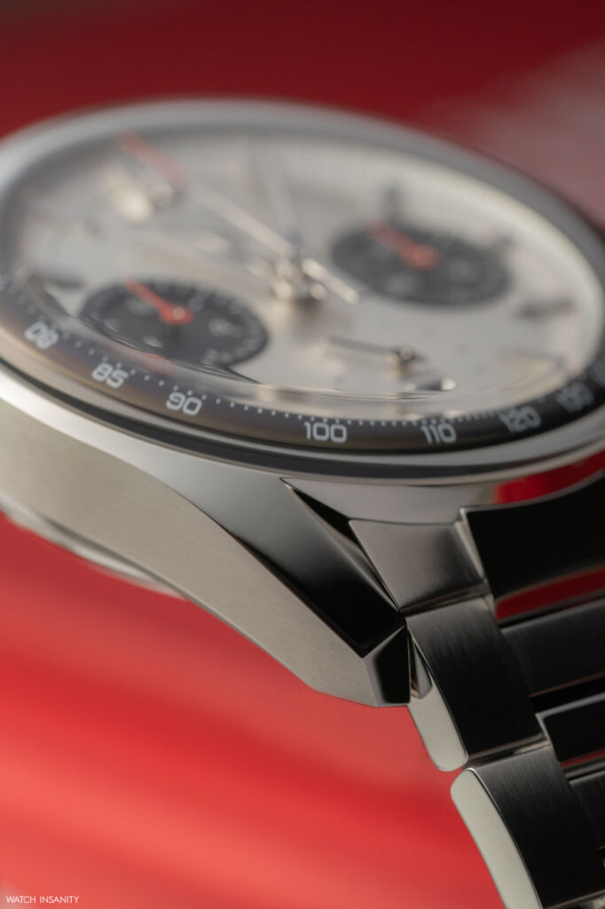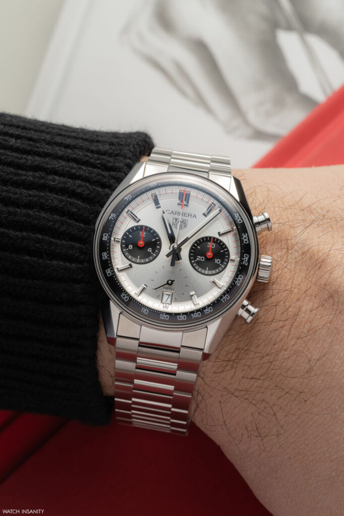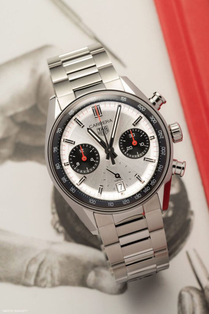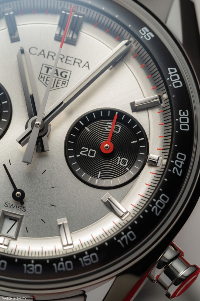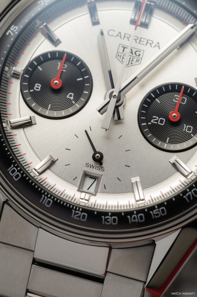 Il fatto che il nuovo TAG Heuer Carrera Chronograph sia ispirato al 7753 SN fa capire che il brand ha optato per la configurazione panda, quindi con i contatori scuri e il quadrante chiaro. Non si tratta però di un bianco né di un color panna, ma di un quadrante argentato spazzolato con finitura soleil. I due contatori a ore 3 e 9 sono invece neri azzurrati e danno all’orologio un aspetto bi-compax vagamente retrò. A onor del vero, però, questo Carrera avrebbe anche un terzo contatore, per i piccoli secondi a ore 6. Il fatto però che sia delineato solo grazie ai piccoli indici dei secondi e che la lancetta scorra di fatto al di sopra del quadrante, lo equipara esteticamente a un bi-compax.