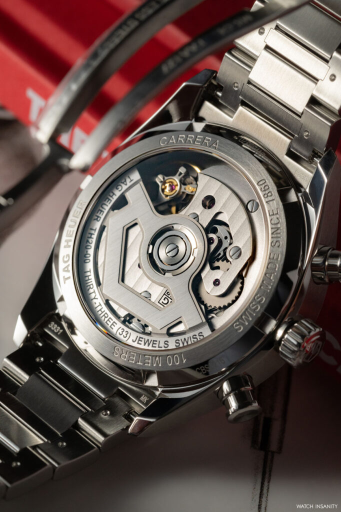 Il calibro TH20-00 è caratterizzato da un movimento di carica bidirezionale e lavora a 28.800 alternanze/ora, per un’autonomia piuttosto elevata: 80 ore. Oltre alla cronografia e all’indicazione di ore, minuti e secondi, il movimento aziona anche un datario. La sua presenza a ore 6, all’interno del contatore dei piccoli secondi, per quanto molto discreta non passa inosservata. Il movimento è visibile attraverso il fondello in vetro zaffiro; per fortuna, perché il rotore del calibro a forma di scudo, che riprende il logo di TAG Heuer, merita di essere guardato.