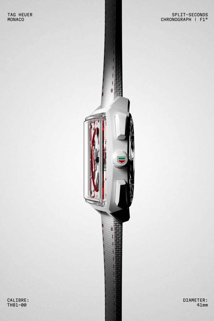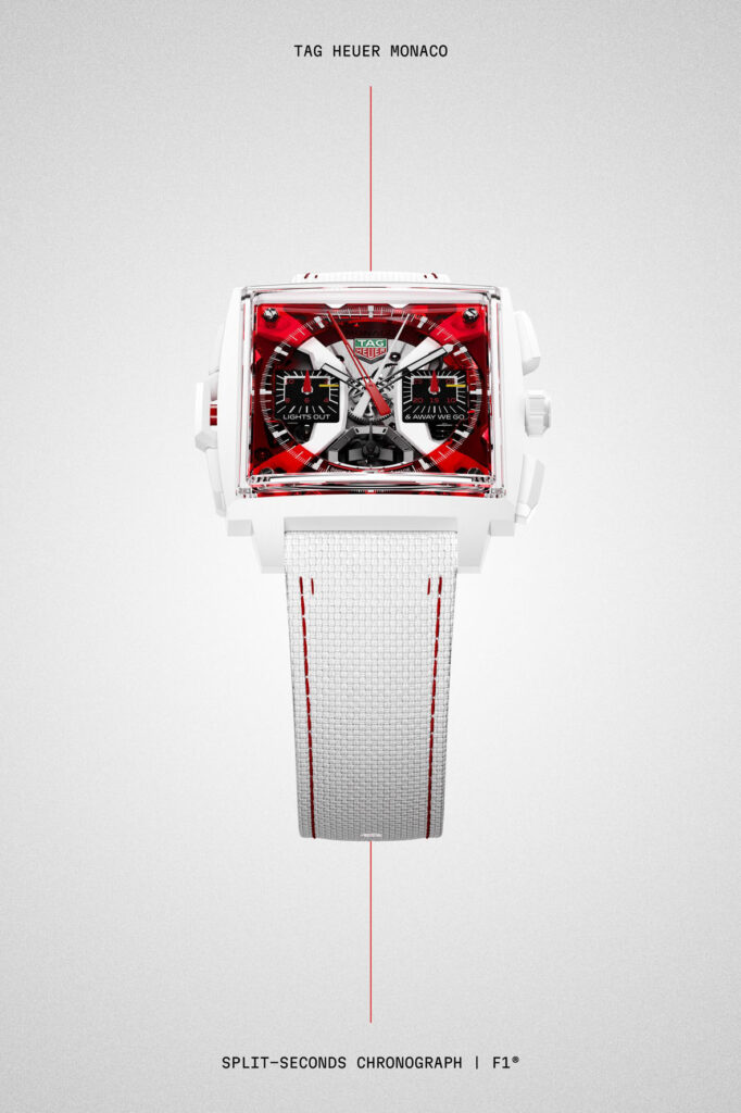 Limitato a soli 10 esemplari numerati singolarmente, il nuovo TAG Heur Monaco Split-Seconds Chronograph | F1 è completato da un cinturino in pelle di vitello bianca con fibbia déployante con doppia chiusura di sicurezza in titanio grado 5. Una scatola laccata in legno appositamente progettata e ispirata ai colori caratteristici della Formula 1 completa l’orologio. (Prezzo CHF. 155,000)