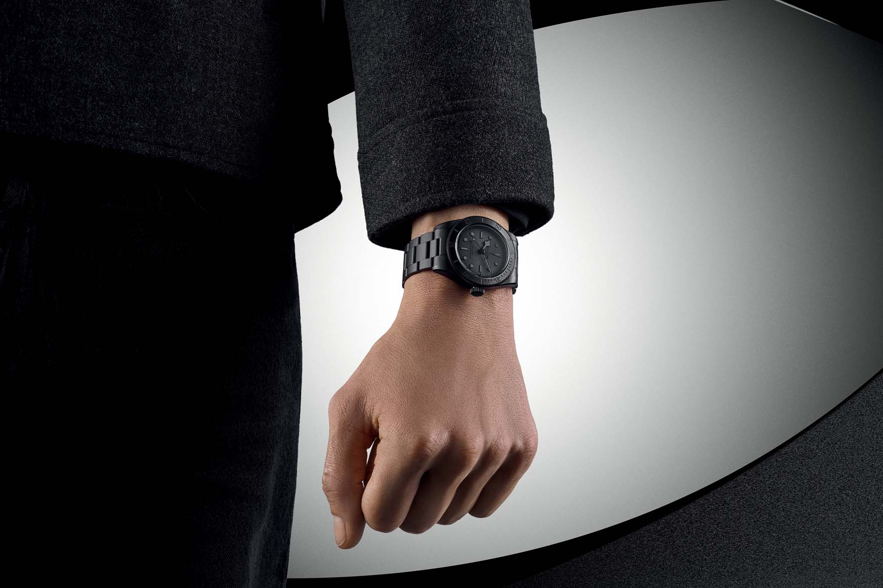 Le proporzioni restano quelle familiari — 41 mm — ma è la materia a fare la differenza. La ceramica nera opaca microsabbiata assorbe la luce e restituisce una presenza più compatta, quasi monolitica, lontana dalla brillantezza dell’acciaio.