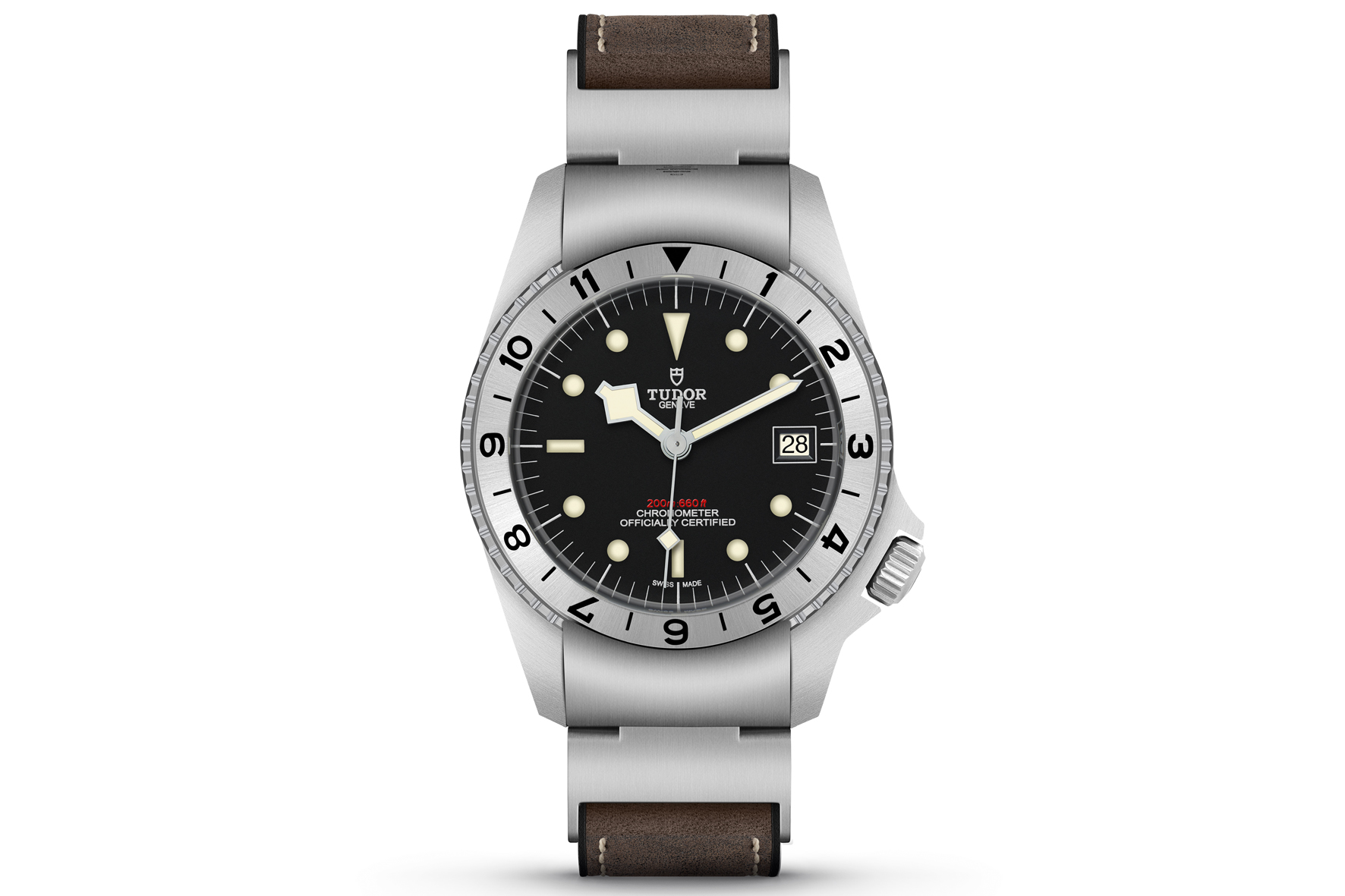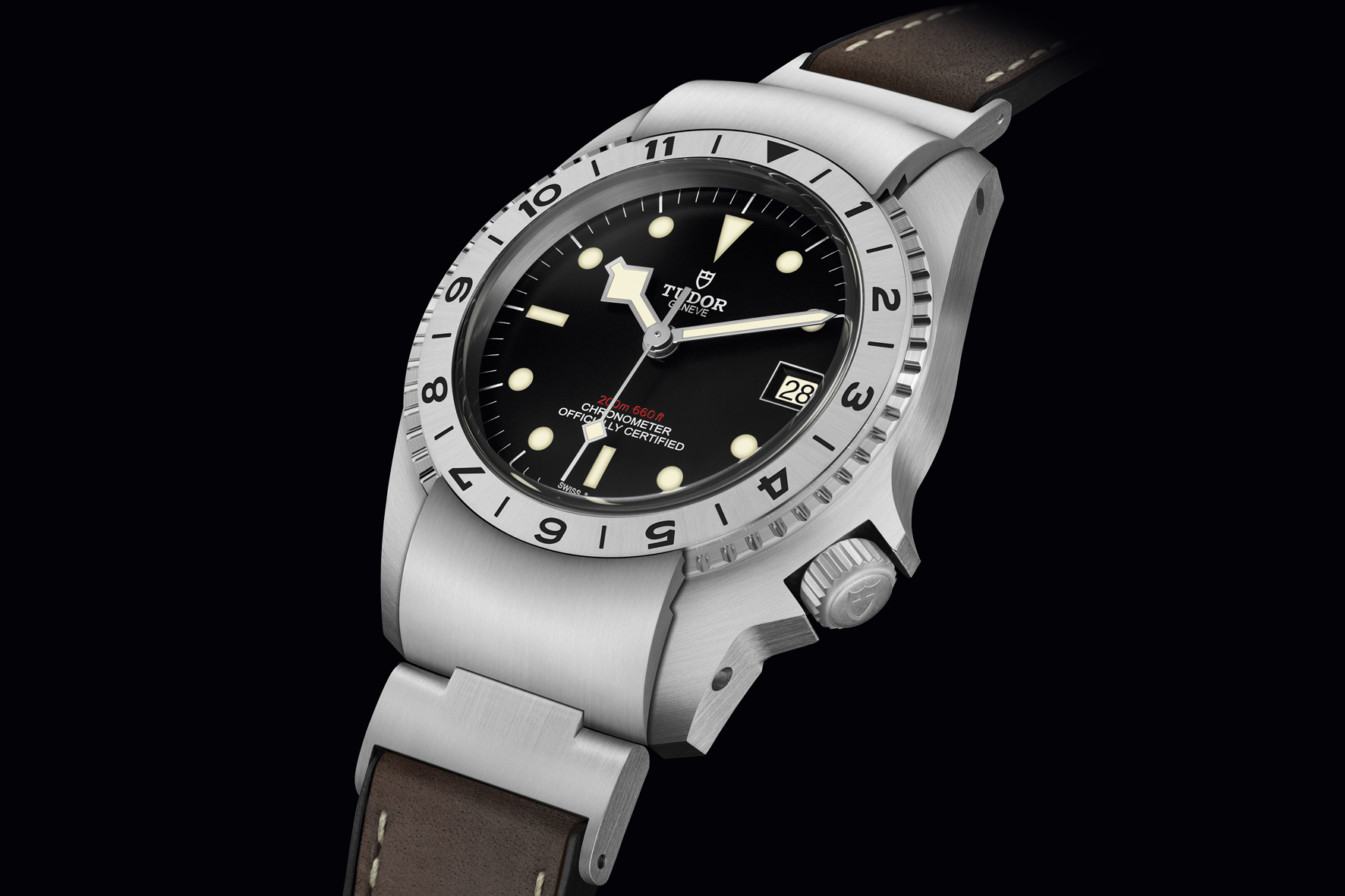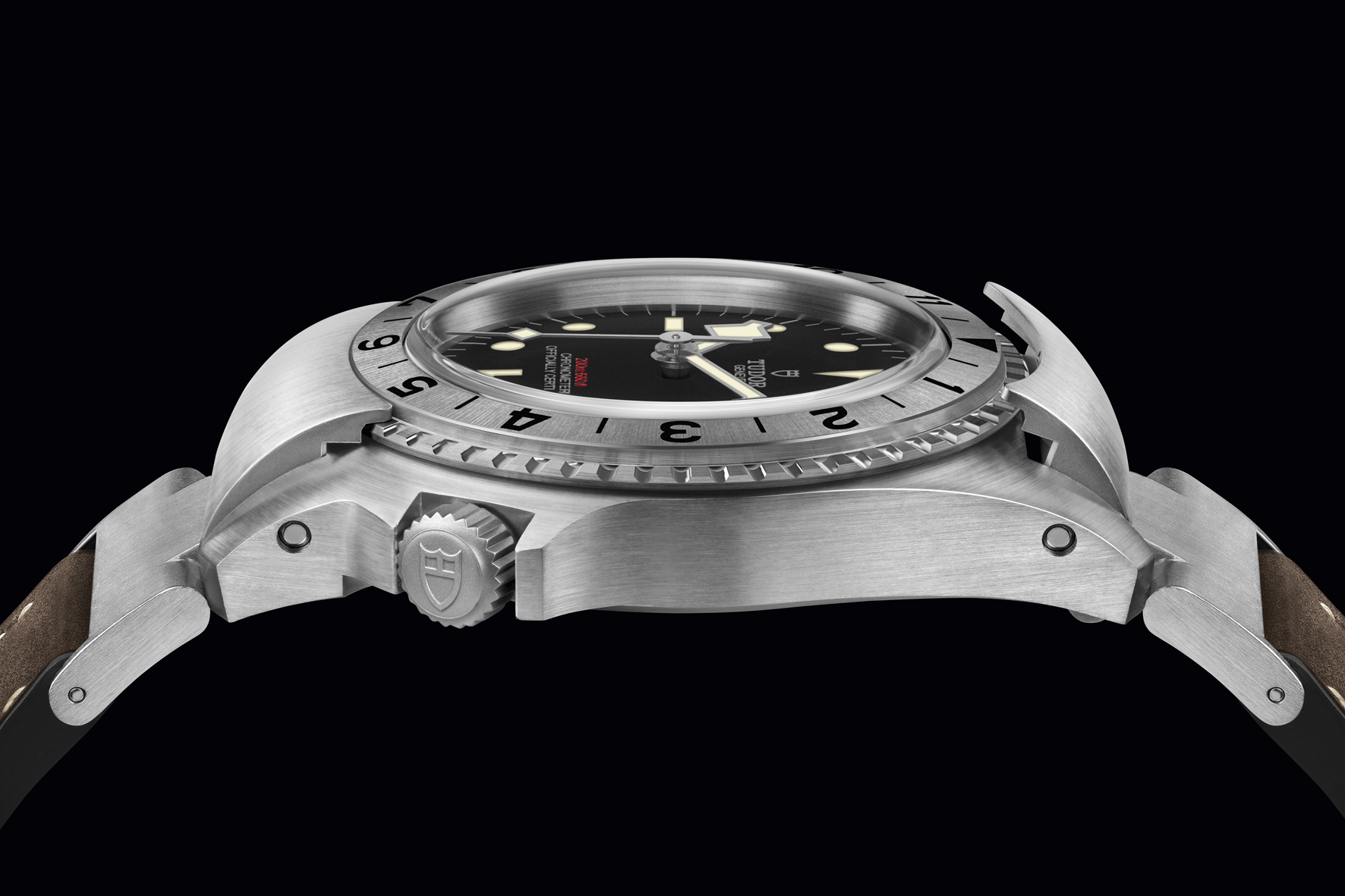 Il cinturino sviluppato per il modello Black Bay P01 ha una base in caucciù con motivo “Snowflake” sulla parte posteriore e finitura in pelle marrone. In linea con il prototipo d’epoca, è fissato alla cassa dell’orologio mediante elementi di giunzione mobili in acciaio satinato. (Prezzo €.3.750)