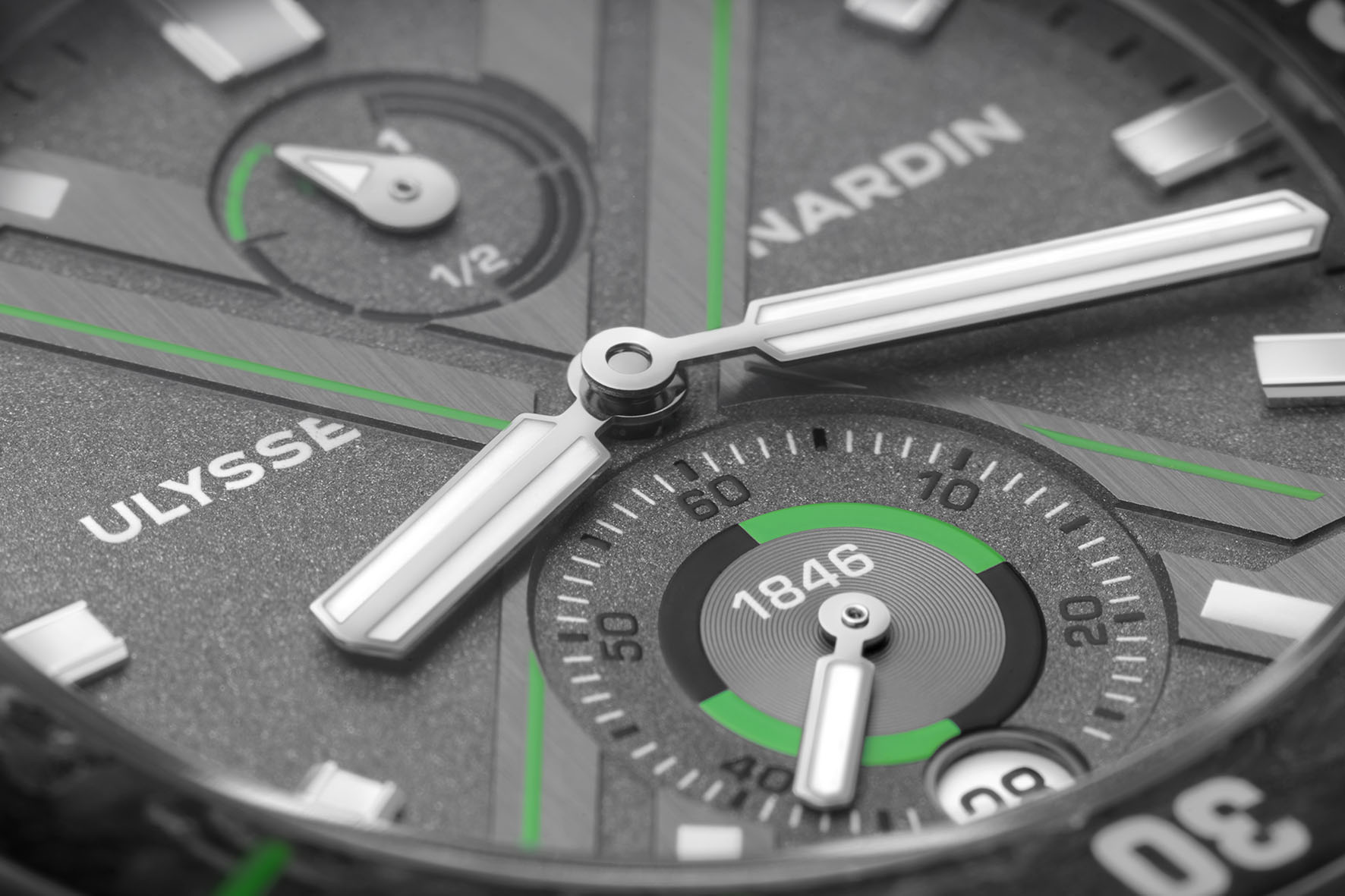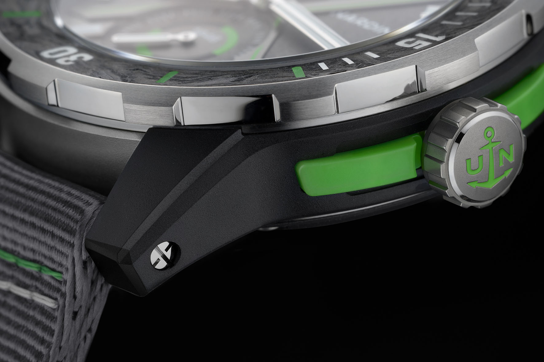 I designer di Ulysse Nardin hanno decorato meticolosamente l’orologio, resistente all’acqua fino a 300 m, con tocchi di colore verde brillante, come un riflesso della natura. I tocchi di verde sono ovunque: dalle cuciture sul cinturino agli indici e alla lunetta, compreso anche la firma a “doppia X“ sul quadrante, l’indicatore della riserva di carica alle ore 12, la lancetta dei piccoli secondi alle ore 6, il logo Ulysse Nardin inciso sulla corona, il copri-corona e la platina singola. Una combinazione di bianco, grigio e nero completa la palette di colori dell’orologio, che pulsa al ritmo dell’iconico movimento della Manifattura, UN-118, con la sua tecnologia al silicio.